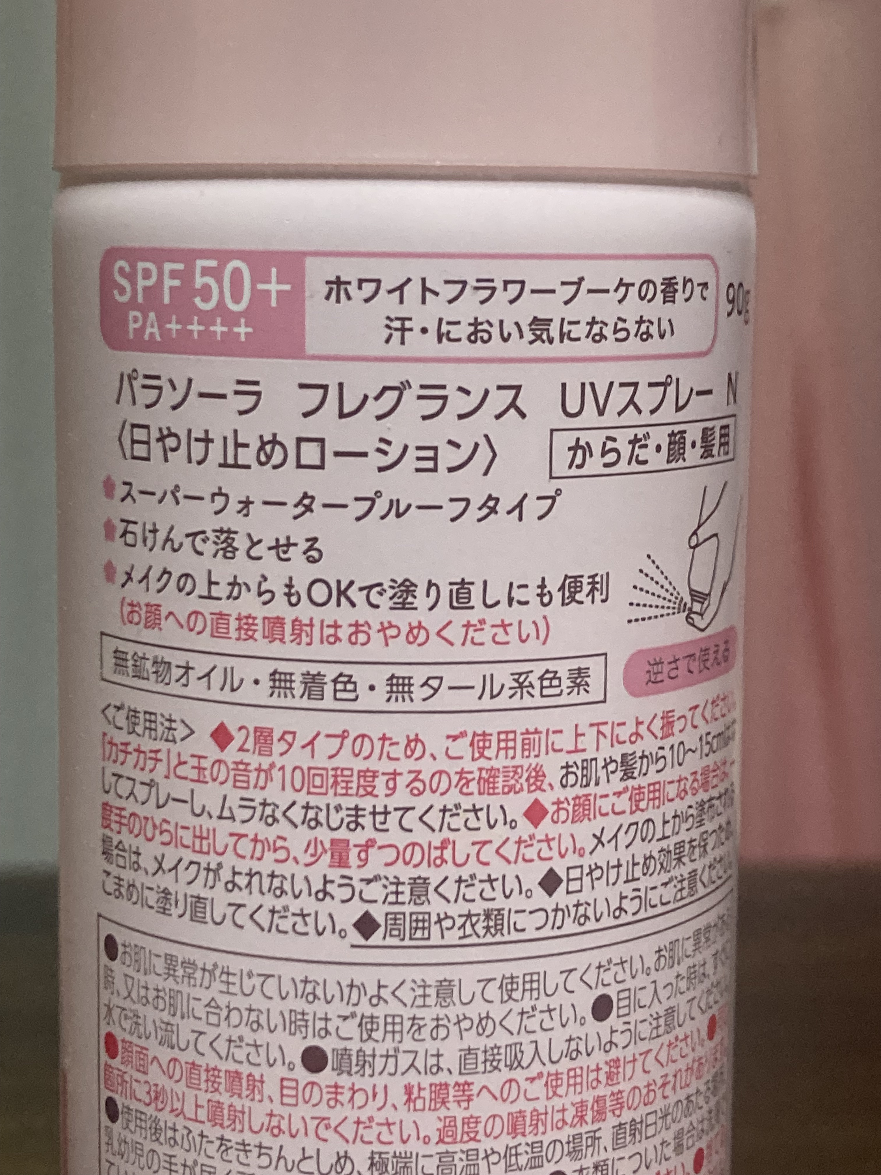 - SPF50+・PA++++ 大人気のフレグランスUVスプレーがリニューアル。 まるで香水みたいな華やかな香り×高密着のスーパーウォータープルーフ 〇ホワイトフラワーブーケの香りで汗・におい気にならない 〇憧れの香水をイメージしたこだわりの香り 〇スーパーウォータープルーフ 〇緑茶エキス・10種の美容液成分*(保湿成分)配合。 〇透明タイプだから髪・メイクの上からでも使え、塗り直しにも便利 (顔への直接噴射はおやめください) 〇逆さで使えて、うなじ・背中・つま先など塗りにくい部分も簡単UVカット。 〇ボディソープで落とせます。 〇汗吸着パウダー**・べたつき抑制成分***配合でべたつきフリーに。 *ナノヒアルロン酸・ナノコラーゲン・高浸透型ビタミンC誘導体・セラミド・アミノ酸・コエンザイムQ10・ローヤルゼリーエキス・ハイビスカス花エキス・ザクロ果実エキス・カミツレエキス配合。 **シリカ ***ラフィノース(整肌成分)