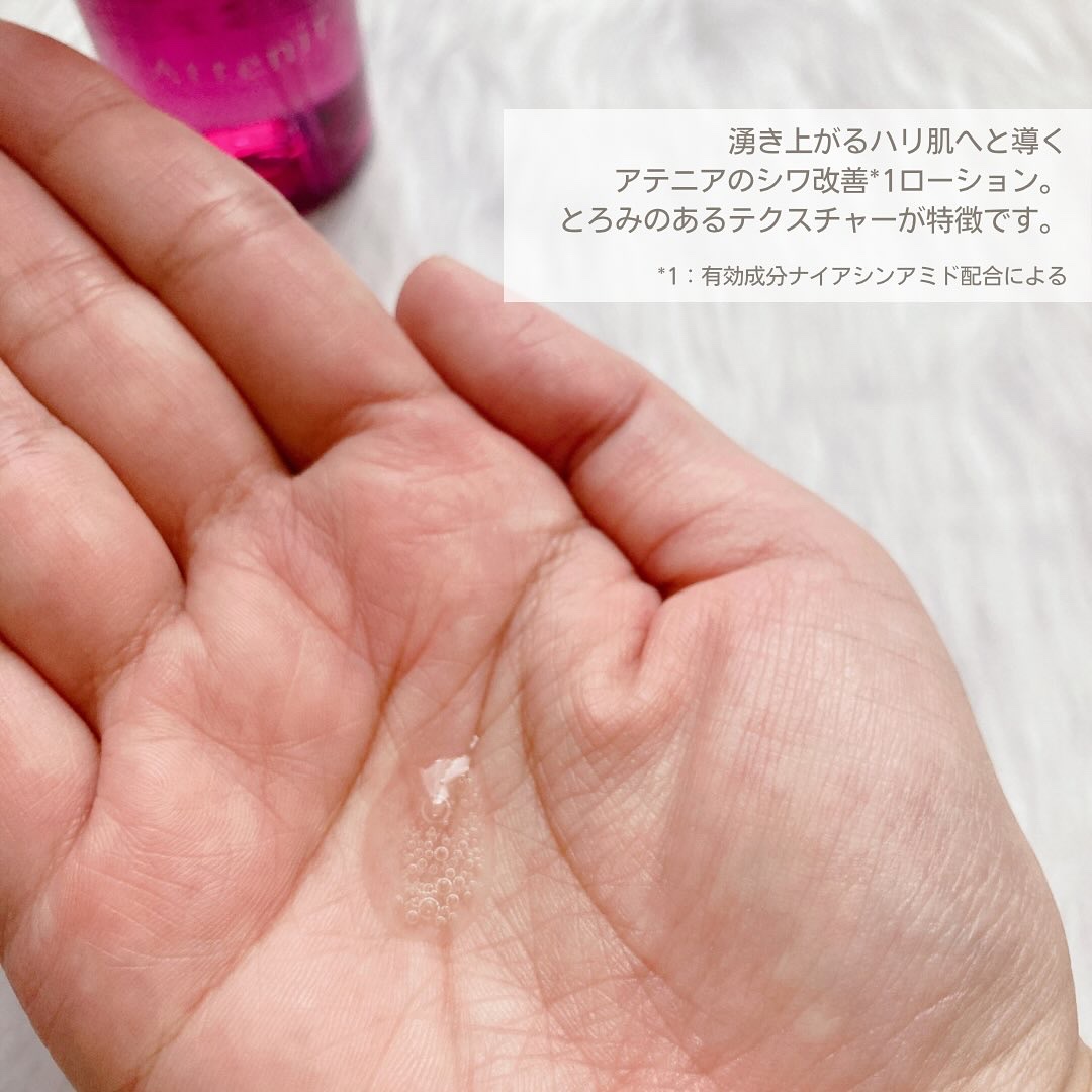 - 【医薬部外品】 [販売名:アテニア ローション DLr] 肌に上質なうるおいとハリを与える化粧水。 なめらかで心地よいローションが、使うたび角層のすみずみまでいきわたり、 ふっくらしなやかな肌感触をもたらします。