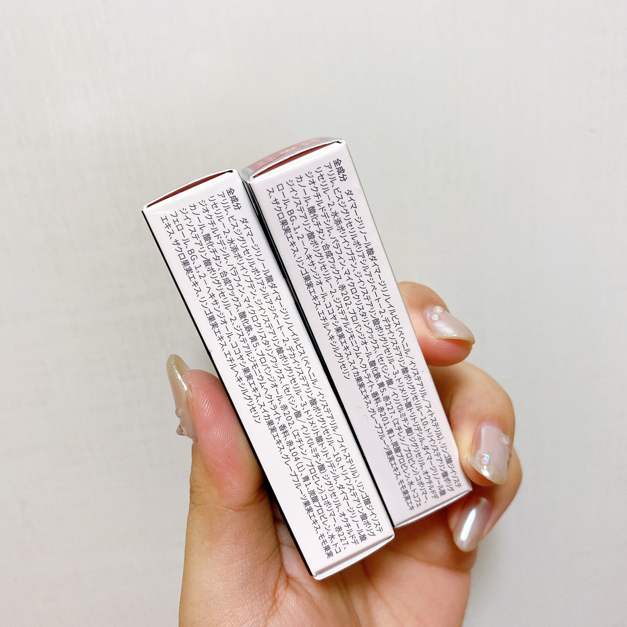 - <01 ミュートパーセント> リンゴ酸ジイソステアリル、ダイマージリノール酸ダイマージリノレイルビス(ベヘニル/イソステアリル/フィトステリル)、ビスジグリセリルポリアシルアジペート 2、デカイソステアリン酸ポリグリセリル 10、トリイソステアリン酸ポリグリセリル 2、水添ポリイソブテン、ジイソステアリン酸ポリグリセリル 3、トリメリト酸トリトリデシル、ダイマージリノール酸ジオクチルドデシル、パラフィン、マイクロクリスタリンワックス、(セバシン酸/イソパルミチン酸)ジグリセリル、酸化チタン、オクチルドデカノール、合成ワックス、黄5、プロパンジオール、赤227、(エチレン/プロピレン)コポリマー、ジステアルジモニウムヘクトライト、香料、酸化鉄、赤202、ジイソステアリン酸ポリグリセリル 2、青1、炭酸プロピレン、水、トコフェロール、BG、1,2 ヘキサンジオール、ココヤシ果実エキス、スイカ果実エキス、グレープフルーツ果実エキス、モモ果実エキス、ザクロ果実エキス、リンゴ果実エキス、エチルヘキシルグリセリン <04 ウォーミングコーラル> ダイマージリノール酸ダイマージリノレイルビス(ベヘニル/イソステアリル/フィトステリル)、リンゴ酸ジイソステアリル、ビスジグリセリルポリアシルアジペート 2、デカイソステアリン酸ポリグリセリル 10、トリイソステアリン酸ポリグリセリル 2、水添ポリイソブテン、ジイソステアリン酸ポリグリセリル 3、トリメリト酸トリトリデシル、ダイマージリノール酸ジオクチルドデシル、パラフィン、マイクロクリスタリンワックス、(セバシン酸/イソパルミチン酸)ジグリセリル、オクチルドデカノール、酸化チタン、合成ワックス、赤104(1)、酸化鉄、黄5、プロパンジオール、黄4、(エチレン/プロピレン)コポリマー、ジステアルジモニウムヘクトライト、香料、ジイソステアリン酸ポリグリセリル 2、炭酸プロピレン、水、トコフェロール、BG、1,2 ヘキサンジオール、ココヤシ果実エキス、スイカ果実エキス、グレープフルーツ果実エキス、モモ果実エキス、ザクロ果実エキス、リンゴ果実エキス、エチルヘキシルグリセリン <07 オータムグレーズ> ダイマージリノール酸ダイマージリノレイルビス(ベヘニル/イソステアリル/フィトステリル)、リンゴ酸ジイソステアリル、ビスジグリセリルポリアシルアジペート-2、デカイソステアリン酸ポリグリセリル-10、トリイソステアリン酸ポリグリセリル-2、水添ポリイソブテン、ジイソステアリン酸ポリグリセリル-3、トリメリト酸トリトリデシル、ダイマージリノール酸ジオクチルドデシル、パラフィン、マイクロクリスタリンワックス、(セバシン酸/イソパルミチン酸)ジグリセリル、オクチルドデカノール、酸化チタン、酸化鉄、合成ワックス、黄5、プロパンジオール、赤202、(エチレン/プロピレン)コポリマー、ジイソステアリン酸ポリグリセリル-2、ジステアルジモニウムヘクトライト、香料、青1、赤227、炭酸プロピレン、水、トコフェロール、BG、1、2-ヘキサンジオール、ココヤシ果実エキス、スイカ果実エキス、グレープフルーツ果実エキス、モモ果実エキス、ザクロ果実エキス、リンゴ果実エキス、エチルヘキシルグリセリン <08 ミューテッドプラム> ダイマージリノール酸ダイマージリノレイルビス(ベヘニル/イソステアリル/フィトステリル)、リンゴ酸ジイソステアリル、ビスジグリセリルポリアシルアジペート 2、デカイソステアリン酸ポリグリセリル 10、トリイソステアリン酸ポリグリセリル 2、水添ポリイソブテン、ジイソステアリン酸ポリグリセリル 3、トリメリト酸トリトリデシル、ダイマージリノール酸ジオクチルドデシル、パラフィン、マイクロクリスタリンワックス、(セバシン酸/イソパルミチン酸)ジグリセリル、オクチルドデカノール、酸化チタン、合成ワックス、酸化鉄、黄5、プロパンジオール、赤202、(エチレン/プロピレン)コポリマー、赤227、ジイソステアリン酸ポリグリセリル 2、ジステアルジモニウムヘクトライト、香料、赤104(1)、青1、炭酸プロピレン、水、トコフェロール、BG、1,2 ヘキサンジオール、ココヤシ果実エキス、スイカ果実エキス、グレープフルーツ果実エキス、モモ果実エキス、ザクロ果実エキス、リンゴ果実エキス、エチルヘキシルグリセリン <09 プラムブリュー> ダイマージリノール酸ダイマージリノレイルビス(ベヘニル/イソステアリル/フィトステリル)、リンゴ酸ジイソステアリル、ビスジグリセリルポリアシルアジペート 2、デカイソステアリン酸ポリグリセリル 10、トリイソステアリン酸ポリグリセリル 2、水添ポリイソブテン、ジイソステアリン酸ポリグリセリル 3、トリメリト酸トリトリデシル、ダイマージリノール酸ジオクチルドデシル、パラフィン、マイクロクリスタリンワックス、(セバシン酸/イソパルミチン酸)ジグリセリル、オクチルドデカノール、酸化チタン、合成ワックス、赤202、プロパンジオール、酸化鉄、黄5、赤227、(エチレン/プ