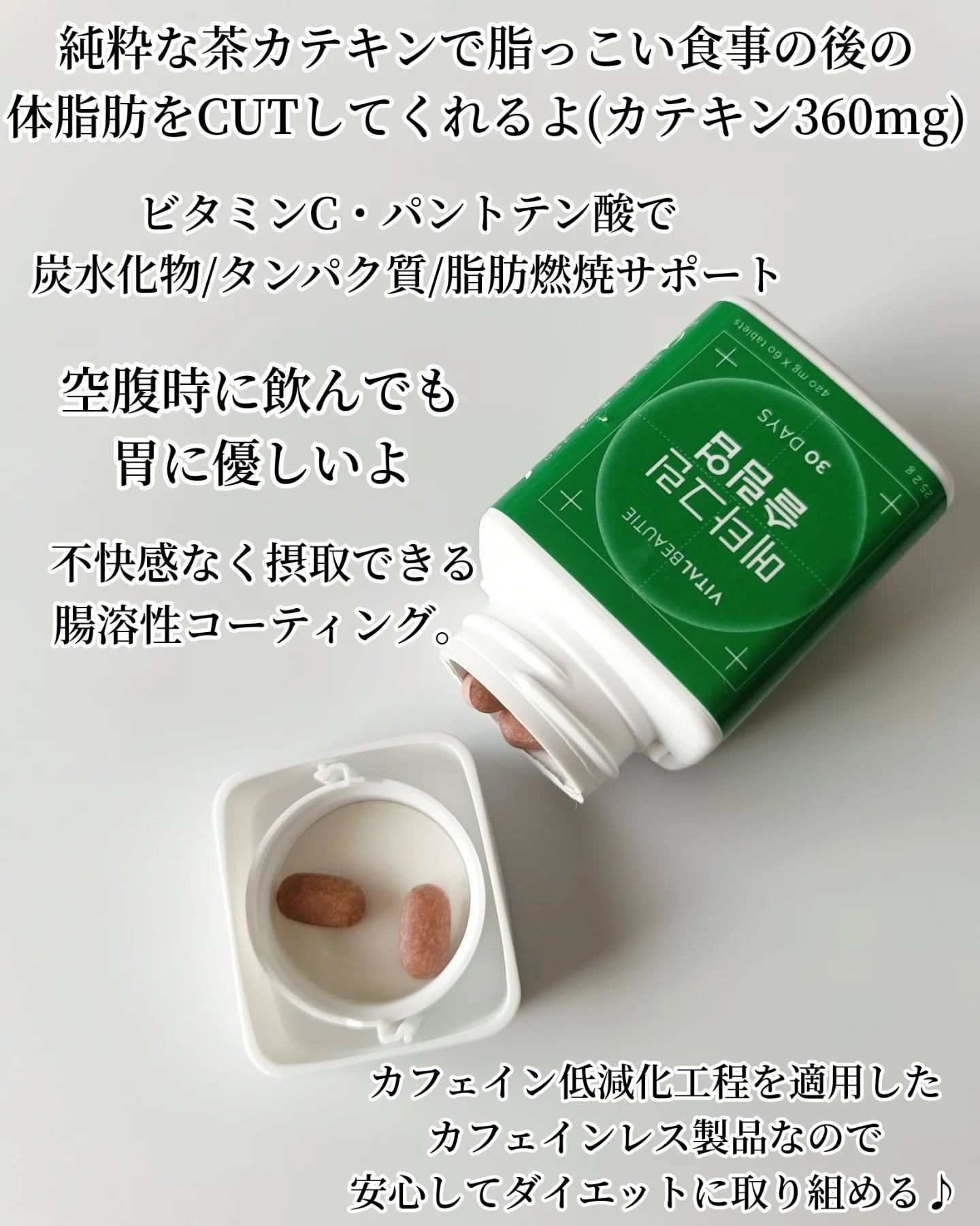 - 累積販売1,500万個 当社安定のベストセラー ヴィーガンカテキン最大*含有量 -カテキン含有量120%UP*! - *メタグリーンライン基準の最大含有量! カテキン300mg → 360mg カフェインレス - アモーレパシフィックならではの工程で 純粋なカテキンだけを1本の瓶に入れました。 1日目安摂取量減少! (自社比較) - カテキン含有量は増量*し、1日3粒 → 2粒目安に ビタミンC、パントテン酸配合