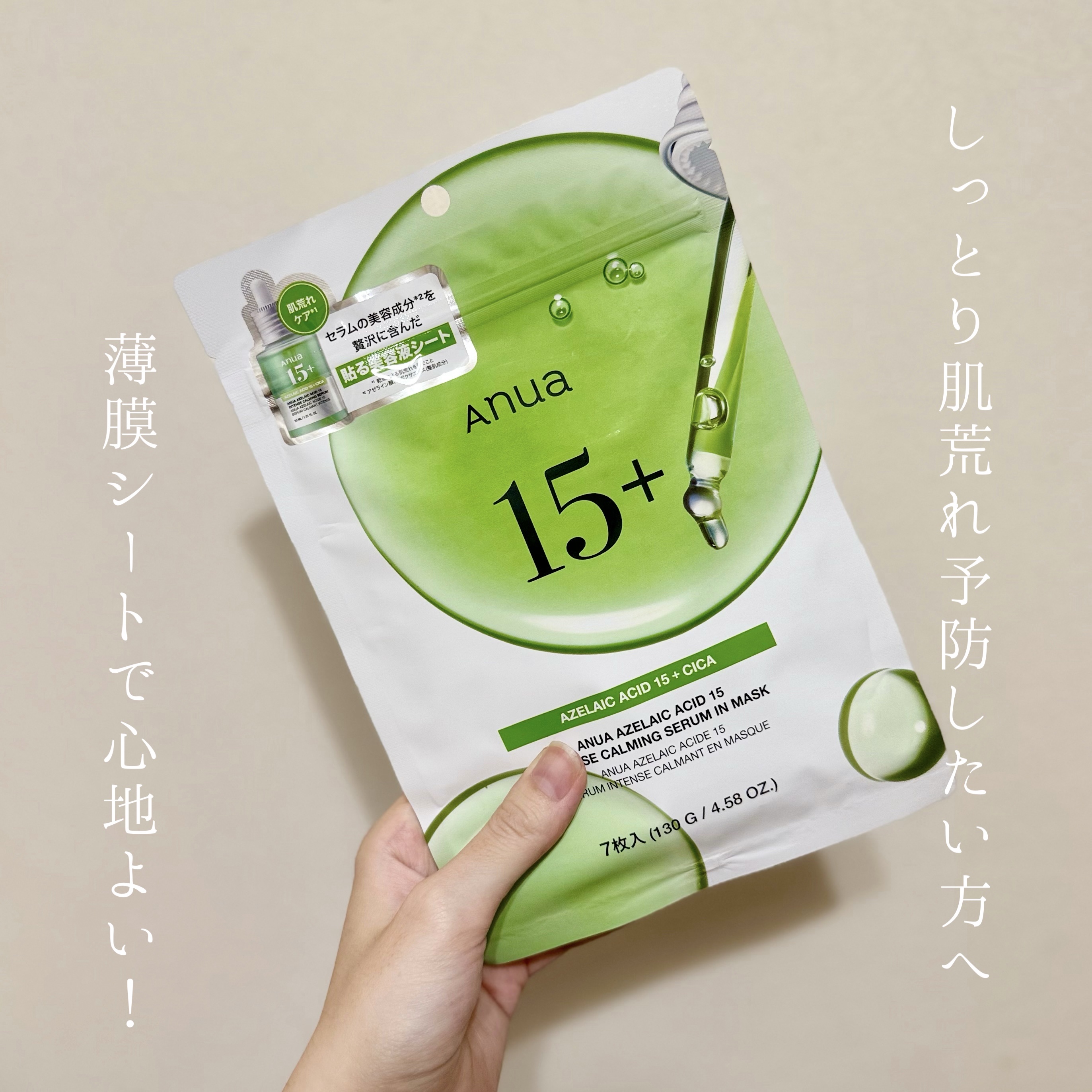 Anua(アヌア) アゼライン酸15インテンスカーミングセラムインマスク。原料臭ぽいものがするような気もしますがほとんど香りはしないです。美容液は緑色でシャバシャバ系です。シートマスクは柔らかくて程よく厚みがあります。シートマスクをつけている...