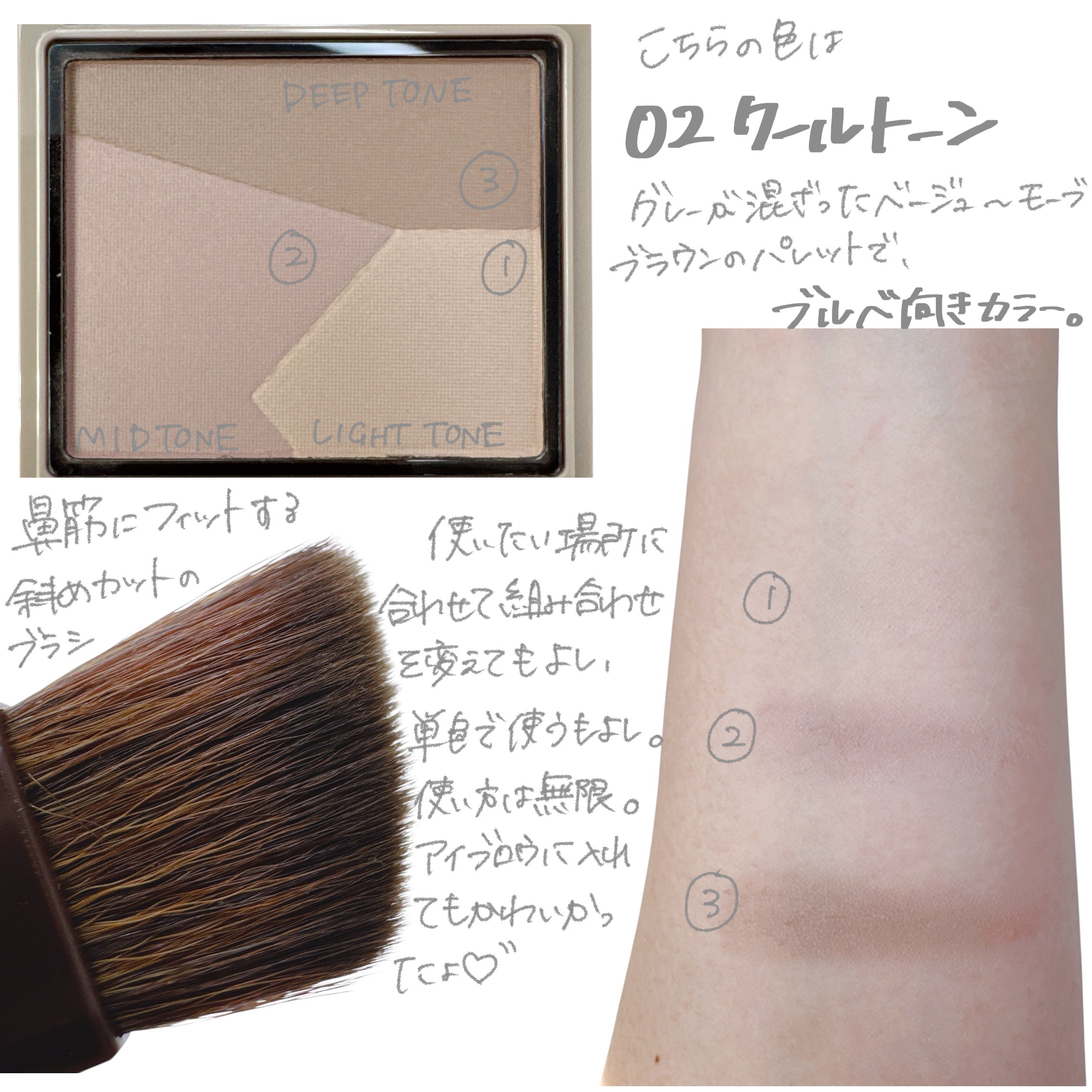 - 自然な陰影をプラスする3色グラデーションシェーディング。入れたい部分に合わせて濃淡・色味をぴったり調節できます。混ぜても一色ずつでも、使い方自由自在。 美容保湿成分(オリーブ果実油、バオバブ種子油、ヒアルロン酸Na)配合。 鼻筋にフィットする斜めカットブラシ付。 01 ウォームトーン:グレーが混ざったベージュ~ブラウンパレット。イエローベースの方、自然な陰影感が欲しい方に。肌色問わず使いやすい。迷ったらこれ。 02 クールトーン:グレーが混ざったベージュ~モーヴブラウンパレット。ブルーベースの方、より陰影感が欲しい方におすすめ。 03 メリハリトーン:マットなホワイトとグレーブラウンの組み合わせでメリハリ立体感を演出。肌色問わず使いやすい。 (ご使用方法) ブラシに適量を取り、輪郭や鼻筋の横など影を入れたい部分に塗布してください。単色はもちろん、お好きな色を混ぜてもお使いいただけます。 (使用上の注意) お肌に異常が生じていないかよく注意して使用してください。お肌に合わない時は、ご使用をおやめください。
