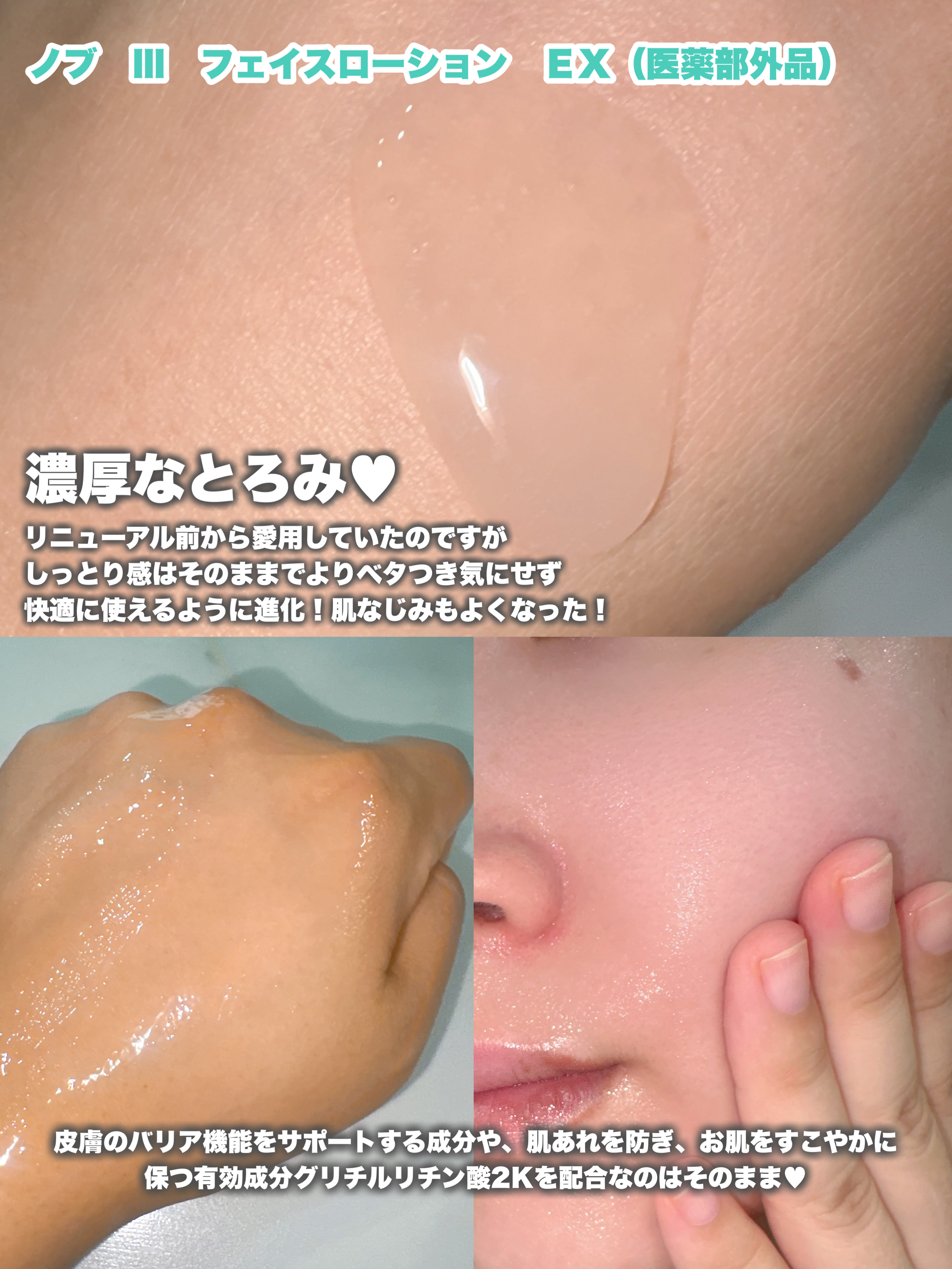 ノブⅢシリーズは皮膚のバリア機能に着目した低刺激性の高保湿化粧品⭐︎⭐︎⭐︎ ヒリつきや赤みに悩む人にもおすすめ。 クセの無い心地良いテクスチャーが気に入っていて、強い香りもしない◎