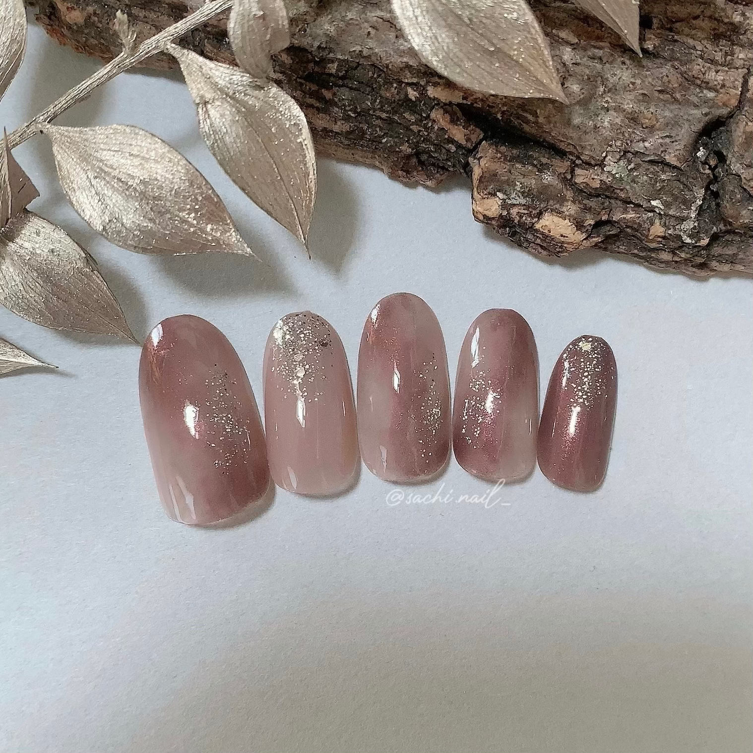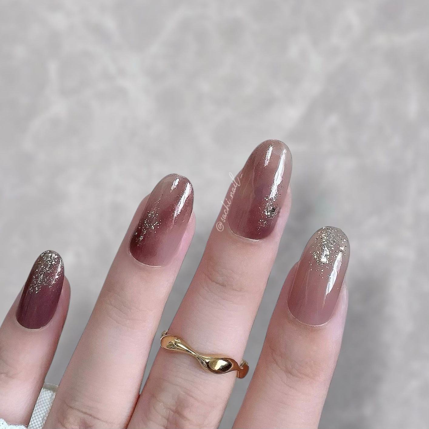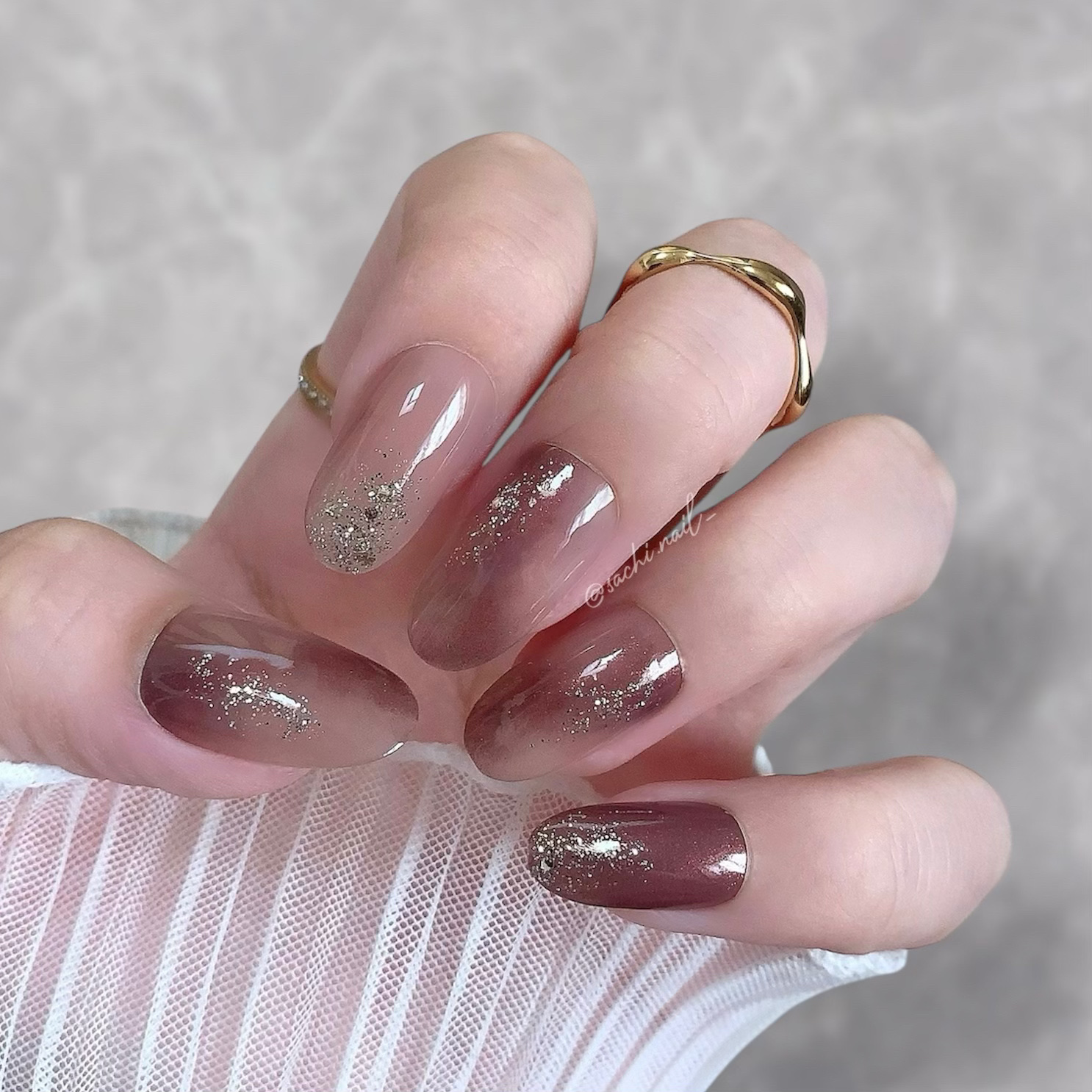 ワンカラーでも指ごとに色を変えるだけでオシャレに見えます💕 画像のようにゴールドラインとストーンを少し足すだけで華やかさがアップ🥰 何度かご紹介したことのあるスポンジで作るグラデーションです✨ スポンジを使うことで境目が綺麗に馴染んでくれます💕 アルミホイルの上でブラウンとトップコートを1:1くらいで混ぜたものを、トップコートのハケに取って3箇所に塗るだけ👌 事前に混ぜたものを塗ることで、爪の上でぼかすより簡単に出来ます💕 ベースカラーが乾く前に点置きしてぼかすことで綺麗にぼかせます✨ スピードが大事なので、使うポリッシュのキャップは全て開けておきましょう😊 天然石のラインはガタガタの方がより天然石っぽく見えるので、ラインを描くのが苦手な方でも大丈夫🙆♀️ 難しそうに見えて、やってみると意外と簡単に出来ます♡