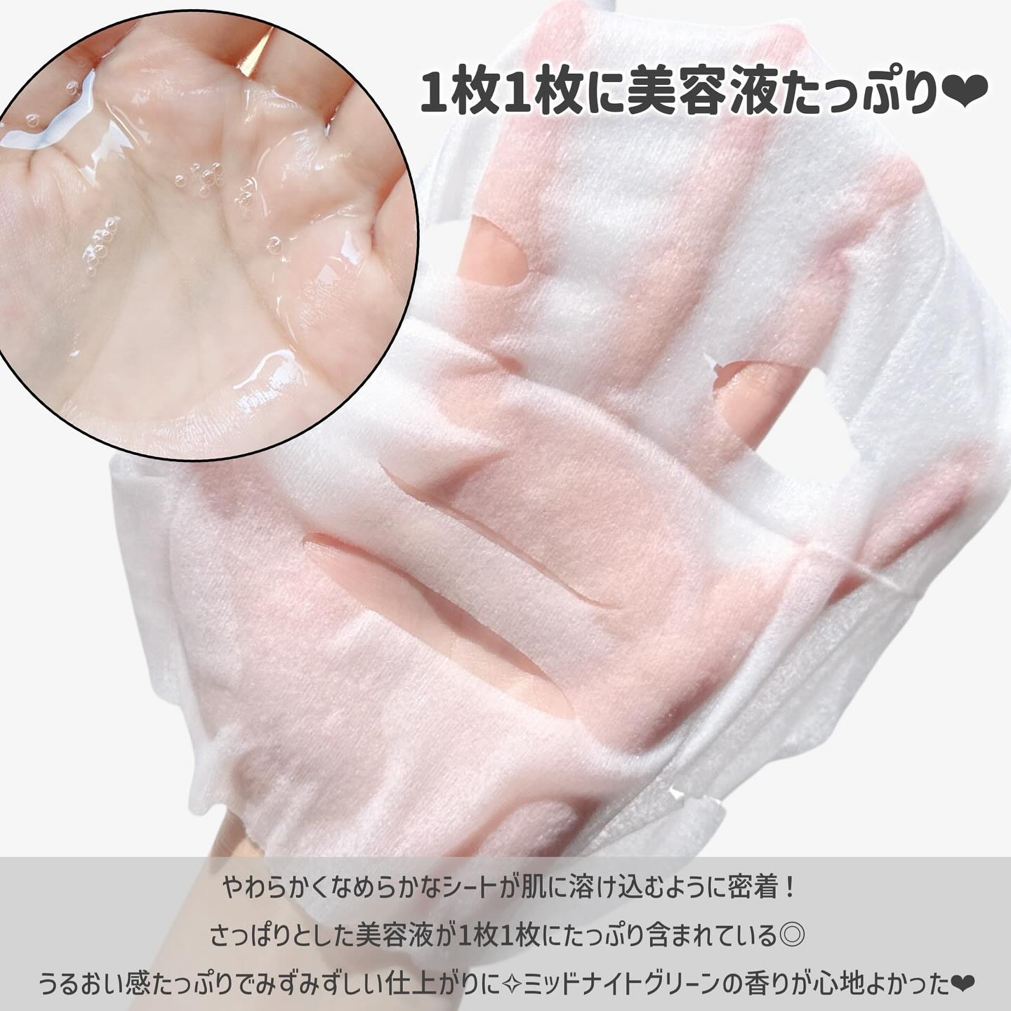 - メイク時に目立つ毛穴悩みに、毛穴対策+白玉*¹美容のスペシャルなデイリーケア。おやすみ前のお手入れはこれ1枚で完了!オールインワン処方の夜用マスク。 リッチな潤い成分配合で肌に美しい透明感。 【高濃度*²グルタチオン(保湿)】アミノ酸からなる成分で、美しく透明感のある肌に 【3種のビタミンC*³】 毛穴ゆるみをキュッとタイトニングしてもっちり肌。 毛穴の目立ちにくいハリと弾力のあるもっちり肌へと導きます。 【10種のペプチド】 ・パルミトイルテトラペプチド-7 ・パルミトイルトリペプチド-5 ・パルミトイルペンタペプチド-4 ・ヘキサカルボキシメチルジペプチド-12 ・アセチルジペプチド-1セチル ・パルミトイルトリペプチド-1 ・ヘキサペプチド-33 ・トリフルオロ酢酸テトラデシルアミノブチロイルバリルアミノ酪酸ウレア ・酢酸アミジノベンジルベンジルスルホニルD-セリルホモフェニルアラニンアミド ・ジ酢酸ジペプチドジアミノブチロイルベンジルアミド 【3種のタイトニングペプチド】 ・アセチルヘキサペプチド-1 ・テトラペプチド-1 ・アセチルテトラペプチド-2 【PDRN DUO】 ・DNA-Na ・オタネニンジン根エキス ・ハス葉エキス(以上、全て保湿) ナイアシンアミド配合で、肌のベースからアプローチ。 たっぷりの保湿成分とナイアシンアミド(整肌成分)を配合。 肌を内側からぷるんと白玉*¹肌へと整えます。 ・ナイアシンアミド(整肌) ・サボテンオイル*⁴ ・ヒアルロン酸Na(保湿) ・水溶性コラーゲン(保湿) 1枚貼るだけ!オールインワン処方 化粧水+乳液+美容液+クリーム+パック <小鼻を包み込むサボリーノオリジナルシートマスク> 液含みの良いシートで、肌あたりも優しくたっぷりひたひたの使い心地です。 サイドの切れ込みを持ち上げるように引き上げてお使いください。 ミッドナイトグリーンの香り 爽やかなグリーンの香りにアップルの香りを合わせた、 夜のひとときをリラックスさせてくれる香りです。 *1 肌イメージ *2 当社比 *3 テトラヘキシルデカン酸アスコルビル、パルミチン酸アスコルビルリン酸3Na、アスコルビルリン酸Na(以上、全て整肌) *4 オプンチアフィクスインジカ種子油(保湿)