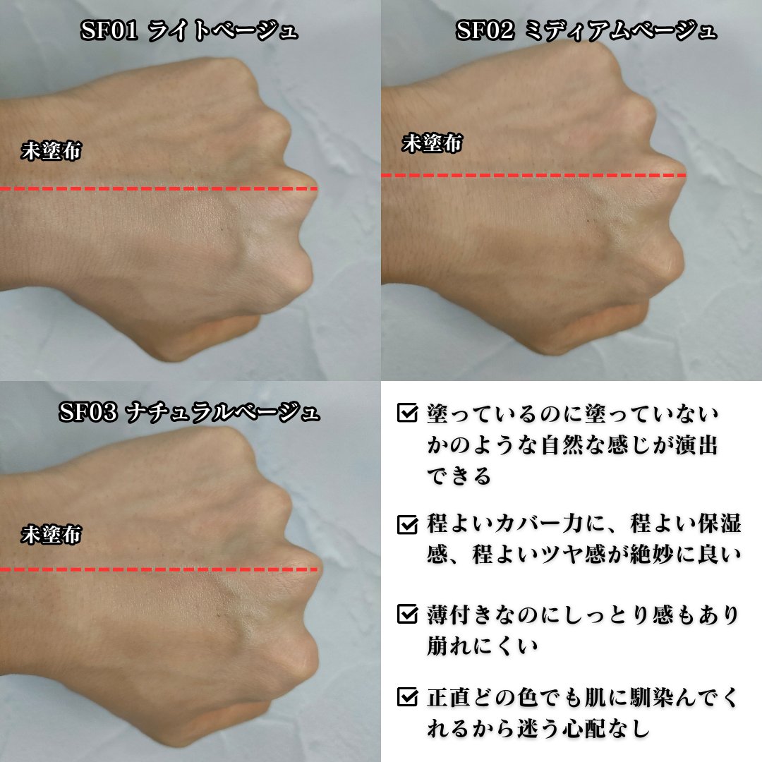 - <SF01 ライトベージュ(本体)> ジメチコン、水、酸化チタン、酸化亜鉛、BG、グリセリン、ジフェニルシロキシフェニルトリメチコン、ジカプリン酸ネオペンチルグリコール、メトキシケイヒ酸エチルヘキシル、PEG-10ジメチコン、キシリトール、イソステアリン酸、PEG-32、パルミチン酸アスコルビルリン酸3Na、ナイアシンアミド、グリシルグリシン、セラミドNG、セラミドNP、セラミドAP、セルロース、EDTA-2Na、キサンタンガム、クオタニウム-18ヘクトライト、ステアリン酸Mg、セスキイソステアリン酸ソルビタン、トリメチルシロキシケイ酸、ノイバラ果実エキス、ハイドロゲンジメチコン、フィトステロールズ、ラウロイルグルタミン酸Na、リシン、塩化Mg、水酸化Al、水添レシチン、硫酸Mg、フェノキシエタノール、マイカ、合成フルオロフロゴパイト、酸化鉄 <SF02 ミディアムベージュ(本体)> ジメチコン、水、酸化チタン、酸化亜鉛、BG、グリセリン、ジフェニルシロキシフェニルトリメチコン、ジカプリン酸ネオペンチルグリコール、メトキシケイヒ酸エチルヘキシル、PEG-10ジメチコン、キシリトール、イソステアリン酸、PEG-32、パルミチン酸アスコルビルリン酸3Na、ナイアシンアミド、グリシルグリシン、セラミドNG、セラミドNP、セラミドAP、セルロース、EDTA-2Na、キサンタンガム、クオタニウム-18ヘクトライト、ステアリン酸Mg、セスキイソステアリン酸ソルビタン、トリメチルシロキシケイ酸、ノイバラ果実エキス、ハイドロゲンジメチコン、フィトステロールズ、ラウロイルグルタミン酸Na、リシン、塩化Mg、水酸化Al、水添レシチン、硫酸Mg、フェノキシエタノール、マイカ、合成フルオロフロゴパイト、酸化鉄 <SF03 ナチュラルベージュ(本体)> ジメチコン、水、酸化チタン、酸化亜鉛、BG、グリセリン、ジフェニルシロキシフェニルトリメチコン、ジカプリン酸ネオペンチルグリコール、メトキシケイヒ酸エチルヘキシル、PEG-10ジメチコン、キシリトール、イソステアリン酸、PEG-32、パルミチン酸アスコルビルリン酸3Na、ナイアシンアミド、グリシルグリシン、セラミドNG、セラミドNP、セラミドAP、セルロース、EDTA-2Na、キサンタンガム、クオタニウム-18ヘクトライト、ステアリン酸Mg、セスキイソステアリン酸ソルビタン、トリメチルシロキシケイ酸、ノイバラ果実エキス、ハイドロゲンジメチコン、フィトステロールズ、ラウロイルグルタミン酸Na、リシン、塩化Mg、水酸化Al、水添レシチン、硫酸Mg、フェノキシエタノール、マイカ、合成フルオロフロゴパイト、酸化鉄 <SF01 ライトベージュ(リフィル)> ジメチコン、水、酸化チタン、酸化亜鉛、BG、グリセリン、ジフェニルシロキシフェニルトリメチコン、ジカプリン酸ネオペンチルグリコール、メトキシケイヒ酸エチルヘキシル、PEG-10ジメチコン、キシリトール、イソステアリン酸、PEG-32、パルミチン酸アスコルビルリン酸3Na、ナイアシンアミド、グリシルグリシン、セラミドNG、セラミドNP、セラミドAP、セルロース、EDTA-2Na、キサンタンガム、クオタニウム-18ヘクトライト、ステアリン酸Mg、セスキイソステアリン酸ソルビタン、トリメチルシロキシケイ酸、ノイバラ果実エキス、ハイドロゲンジメチコン、フィトステロールズ、ラウロイルグルタミン酸Na、リシン、塩化Mg、水酸化Al、水添レシチン、硫酸Mg、フェノキシエタノール、マイカ、合成フルオロフロゴパイト、酸化鉄 <SF02 ミディアムベージュ(リフィル)> ジメチコン、水、酸化チタン、酸化亜鉛、BG、グリセリン、ジフェニルシロキシフェニルトリメチコン、ジカプリン酸ネオペンチルグリコール、メトキシケイヒ酸エチルヘキシル、PEG-10ジメチコン、キシリトール、イソステアリン酸、PEG-32、パルミチン酸アスコルビルリン酸3Na、ナイアシンアミド、グリシルグリシン、セラミドNG、セラミドNP、セラミドAP、セルロース、EDTA-2Na、キサンタンガム、クオタニウム-18ヘクトライト、ステアリン酸Mg、セスキイソステアリン酸ソルビタン、トリメチルシロキシケイ酸、ノイバラ果実エキス、ハイドロゲンジメチコン、フィトステロールズ、ラウロイルグルタミン酸Na、リシン、塩化Mg、水酸化Al、水添レシチン、硫酸Mg、フェノキシエタノール、マイカ、合成フルオロフロゴパイト、酸化鉄 <SF03 ナチュラルベージュ(リフィル )> ジメチコン、水、酸化チタン、酸化亜鉛、BG、グリセリン、ジフェニルシロキシフェニルトリメチコン、ジカプリン酸ネオペンチルグリコール、メトキシケイヒ酸エチルヘキシル、PEG-10ジメチコン、キシリトール、イソステアリン酸、PEG-32、パルミチン酸アスコルビルリン酸3Na、ナイアシンアミド、グリシルグリシン、セラミドNG、セラミドNP、セラミドAP、セルロース、EDTA-2Na、キサンタンガム、クオタニウム-18ヘクトライト、ステアリン酸Mg、セスキイソステアリン酸ソルビタン、トリメチルシロキシケイ酸、ノイバラ果実エキス、ハイドロゲンジメチコン、フィトステロールズ、ラウロイルグルタミン