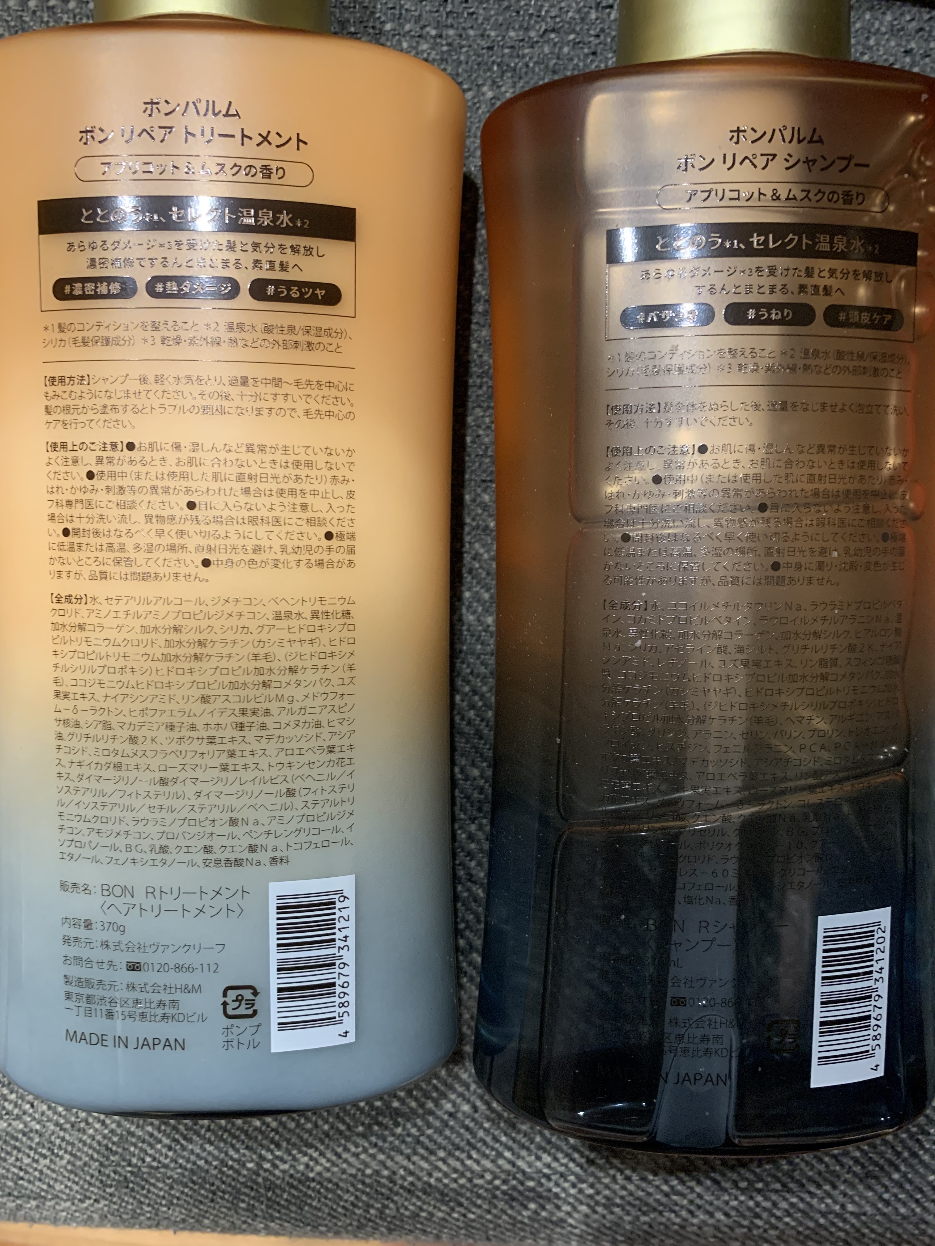 - <ボンリペアシャンプー/ボトル> 水、ココイルメチルタウリンNa、ラウラミドプロピルベタイン、コカミドプロピルベタイン、ラウロイルメチルアラニンNa、温泉水、異性化糖、加水分解コラーゲン、加水分解シルク、ヒアルロン酸Na、シリカ、アゼライン酸、海シルト、グリチルリチン酸2K、ナイアシンアミド、レチノール、ユズ果実エキス、リン脂質、スフィンゴ糖脂質、ココジモニウムヒドロキシプロピル加水分解コメタンパク、加水分解ケラチン(カシミヤヤギ)、ヒドロキシプロピルトリモニウム加水分解ケラチン(羊毛)、(ジヒドロキシメチルシリルプロポキシ)ヒドロキシプロピル加水分解ケラチン(羊毛)、ヘマチン、アルギニン、アスパラギン酸、グリシン、アラニン、セリン、バリン、プロリン、トレオニン、イソロイシン、ヒスチジン、フェニルアラニン、PCA、PCA-Na、ツボクサ葉エキス、マデカッソシド、アシアチコシド、ミロタムヌスフラベリフォリア葉エキス、アロエベラ葉エキス、リン酸アスコルビルMg、モモ葉エキス、カキ果実エキス、ローズマリー葉エキス、トウキンセンカ花エキス、メドウフォーム-δ-ラクトン、コレステロール、グルコシルルチン、リンゴ酸、クエン酸、クエン酸Na、乳酸Na、トリ(カプリル酸/カプリン酸)グリセリル、グリセリン、BG、プロパンジオール、ペンチレングリコール、ポリクオタニウム-10、グアーヒドロキシプロピルトリモニウムクロリド、ラウラミノプロピオン酸Na、コカミドメチルMEA、セテアレス-60ミリスチルグリコール、エタノール、EDTA-2Na、トコフェロール、フェノキシエタノール、安息香酸Na、硫酸亜鉛、BHT、塩化Na、香料 <ボンリペアトリートメント/ボトル> 水、セテアリルアルコール、ジメチコン、ベヘントリモニウムクロリド、アミノエチルアミノプロピルジメチコン、温泉水、異性化糖、加水分解コラーゲン、加水分解シルク、シリカ、グアーヒドロキシプロピルトリモニウムクロリド、加水分解ケラチン(カシミヤヤギ)、ヒドロキシプロピルトリモニウム加水分解ケラチン(羊毛)、(ジヒドロキシメチルシリルプロポキシ)ヒドロキシプロピル加水分解ケラチン(羊毛)、ココジモニウムヒドロキシプロピル加水分解コメタンパク、ユズ果実エキス、ナイアシンアミド、リン酸アスコルビルMg、メドウフォーム-δ-ラクトン、ヒポファエラムノイデス果実油、アルガニアスピノサ核油、シア脂、マカデミア種子油、ホホバ種子油、コメヌカ油、ヒマシ油、グリチルリチン酸2K、ツボクサ葉エキス、マデカッソシド、アシアチコシド、ミロタムヌスフラベリフォリア葉エキス、アロエベラ葉エキス、ナギイカダ根エキス、ローズマリー葉エキス、トウキンセンカ花エキス、ダイマージリノール酸ダイマージリノレイルビス(ベヘニル/イソステアリル/フィトステリル)、ダイマージリノール酸(フィトステリル/イソステアリル/セチル/ステアリル/ベヘニル)、ステアルトリモニウムクロリド、ラウラミノプロピオン酸Na、アミノプロピルジメチコン、アモジメチコン、プロパンジオール、ペンチレングリコール、イソプロパノール、BG、乳酸、クエン酸、クエン酸Na、トコフェロール、エタノール、フェノキシエタノール、安息香酸Na、香料 <ボンリペアシャンプー/リフィル> 水、ココイルメチルタウリンNa、ラウラミドプロピルベタイン、コカミドプロピルベタイン、ラウロイルメチルアラニンNa、温泉水、異性化糖、加水分解コラーゲン、加水分解シルク、ヒアルロン酸Na、シリカ、アゼライン酸、海シルト、グリチルリチン酸2K、ナイアシンアミド、レチノール、ユズ果実エキス、リン脂質、スフィンゴ糖脂質、ココジモニウムヒドロキシプロピル加水分解コメタンパク、加水分解ケラチン(カシミヤヤギ)、ヒドロキシプロピルトリモニウム加水分解ケラチン(羊毛)、(ジヒドロキシメチルシリルプロポキシ)ヒドロキシプロピル加水分解ケラチン(羊毛)、ヘマチン、アルギニン、アスパラギン酸、グリシン、アラニン、セリン、バリン、プロリン、トレオニン、イソロイシン、ヒスチジン、フェニルアラニン、PCA、PCA-Na、ツボクサ葉エキス、マデカッソシド、アシアチコシド、ミロタムヌスフラベリフォリア葉エキス、アロエベラ葉エキス、リン酸アスコルビルMg、モモ葉エキス、カキ果実エキス、ローズマリー葉エキス、トウキンセンカ花エキス、メドウフォーム-δ-ラクトン、コレステロール、グルコシルルチン、リンゴ酸、クエン酸、クエン酸Na、乳酸Na、トリ(カプリル酸/カプリン酸)グリセリル、グリセリン、BG、プロパンジオール、ペンチレングリコール、ポリクオタニウム-10、グアーヒドロキシプロピルトリモニウムクロリド、ラウラミノプロピオン酸Na、コカミドメチルMEA、セテアレス-60ミリスチルグリコール、エタノール、EDTA-2Na、トコフェロール、フェノキシエタノール、安息香酸Na、硫酸亜鉛、BHT、塩化Na、香料 <ボンリペアトリートメント/リフィル> 水、セテアリルアルコール