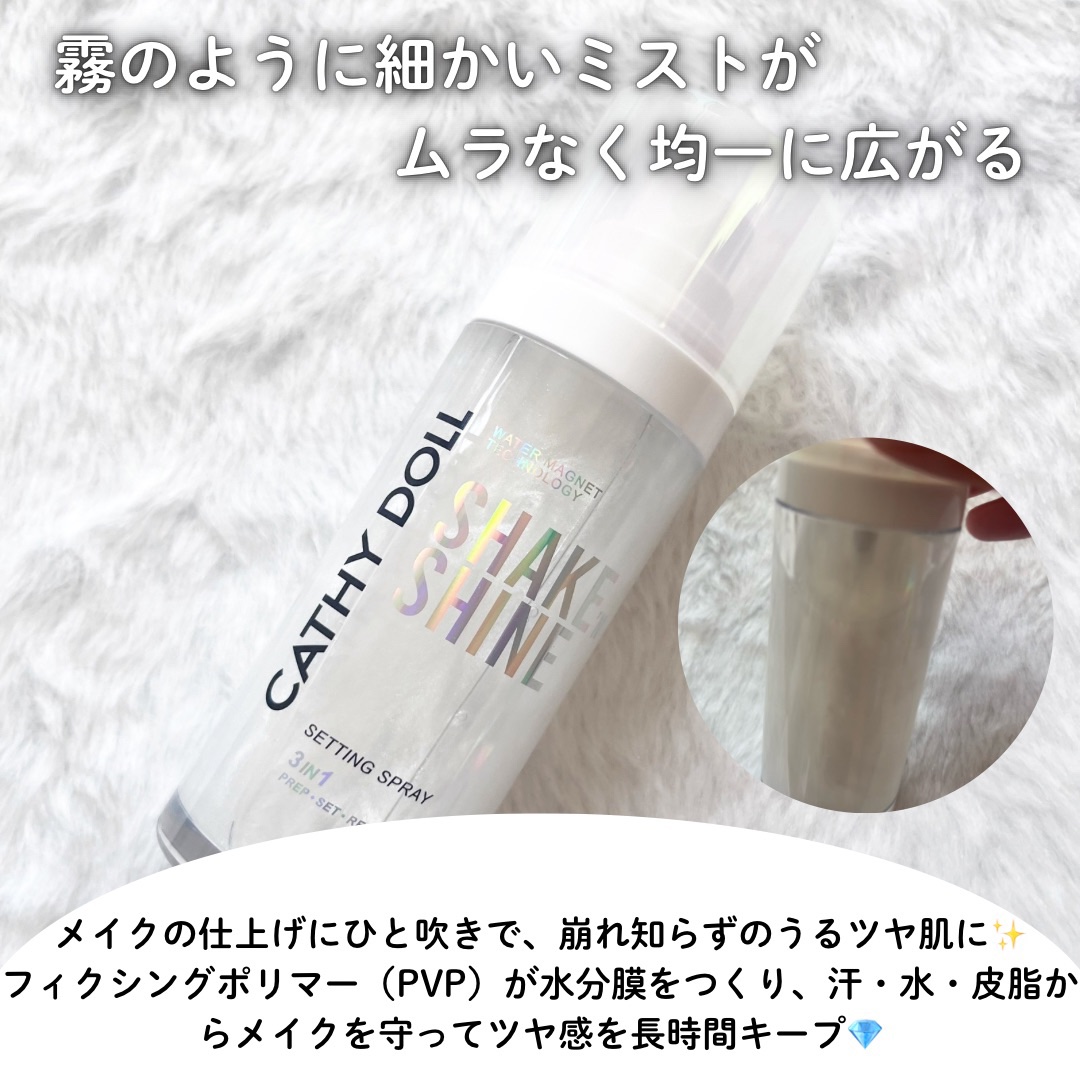 #PRCATHYDOLLシェイクシャインセッティングスプレー🤍フィックスミスト界にラメ革命✨超繊細なラメが入っていて、シュッとひと吹きするだけで、光が当たるたびにキラキラっと輝く毛穴レス*1なツヤ肌が完成💗毛穴やくすみが目立たない、なめらかな...