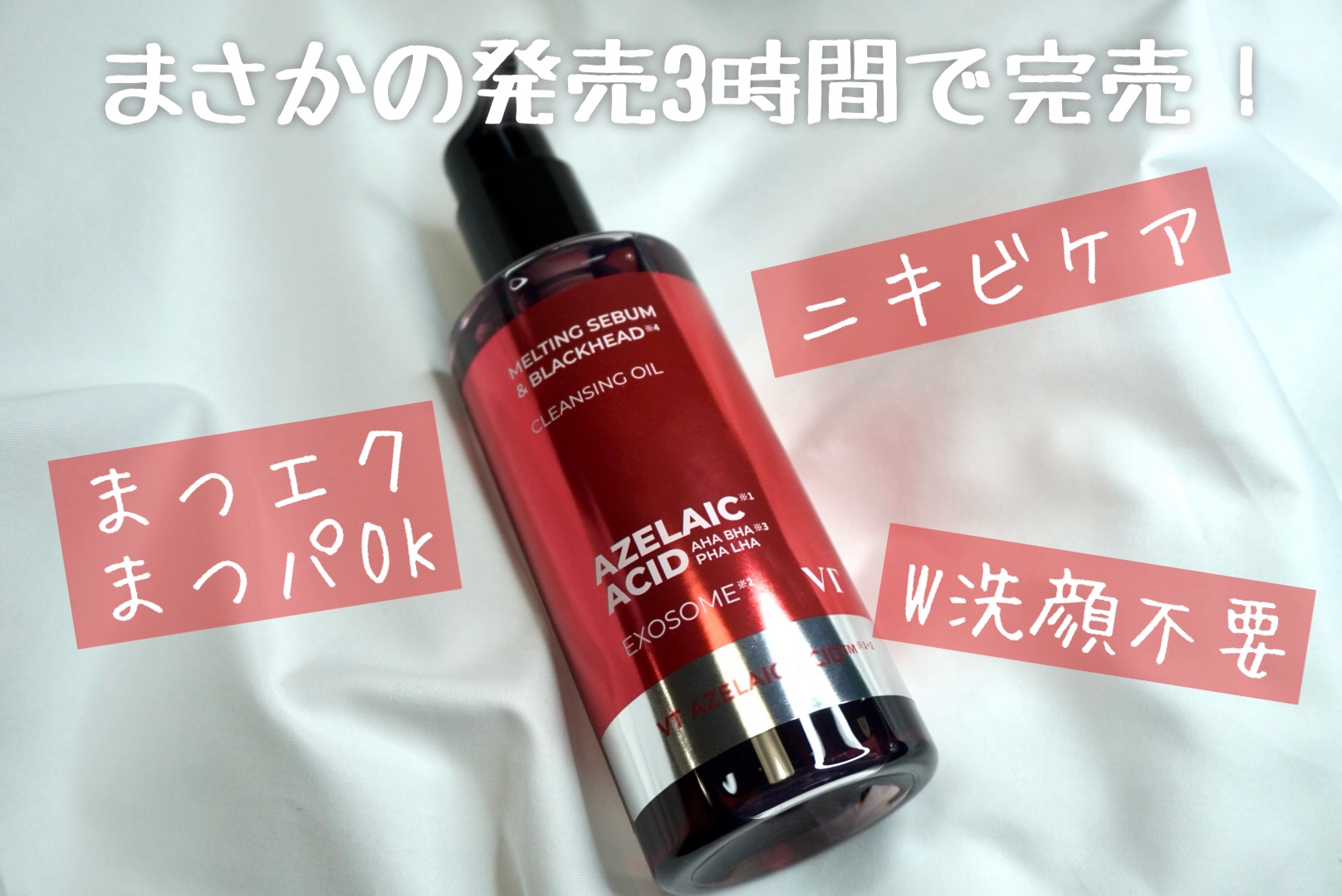 - 最近話題の毛穴ケア・整肌成分アゼライン酸!VTからはクレンジングオイルが登場! ポイントメイクまで落とすしっかりした洗浄力で、毛穴・皮脂までケアし保湿まで叶える一石三鳥アゼライン酸クレンジングオイル。 19種の植物性オイル*1も配合で、目に見えるブラッドヘッド*2から、隠れているホワイトヘッド*2、皮脂まですっきりケアします! ダブル洗顔不要! ※パッケージリニューアル ■このような方へおすすめ メイク・毛穴までディープクレンジング求める方 クレンジングでスキンケアまで行いたい方 ツッパリ感の少ないクレンジングを探していた方 ブラックヘッド*ケアも行いたい方 *1ダイズ油、アルガニアスピノサ核油、ユズ果実油、コメヌカ油、オタネニンジン種子油、アーモンド油、ザクロ種子油、リンゴ種子油、ホホバ種子油、ツバキ種子油、、バオバブ種子油、ユチャ種子油、ベニバナ種子油、ヒマワリ種子油、ヒポファエラムノイデス油、オリーブ果実油、アボカド油、アンズ核油、クロフサスグリ種子油(いずれも保湿) *2古い角質による
