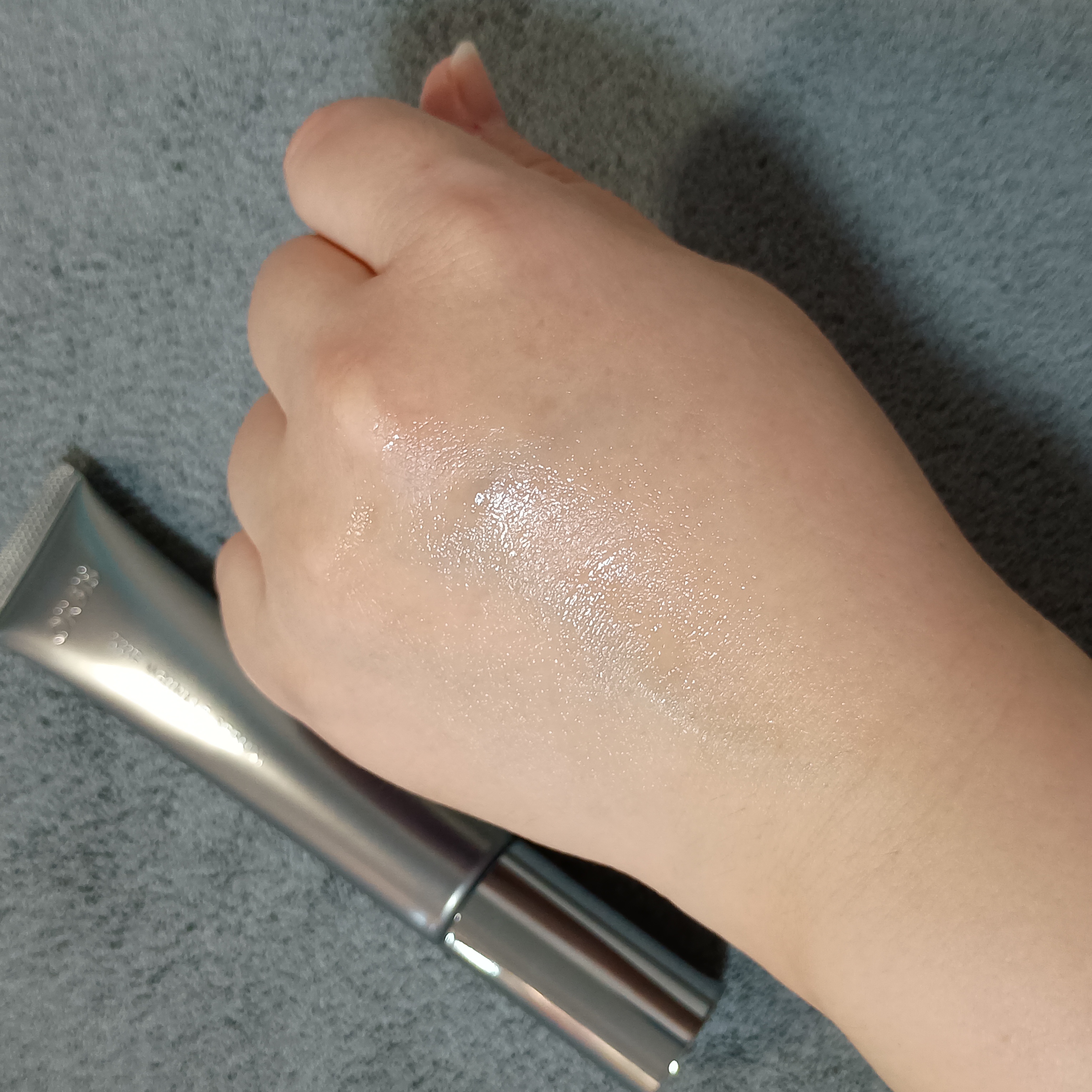 透明のジェルで固めのテクスチャー。かなり粘度の高いことが写真から分かるでしょうか?ハチミツとか水あめくらい濃厚です!! お肌に付けると温かさも感じます。 伸びは良くないですが使いにくいと思った場合は導入ローションを使うと良いです