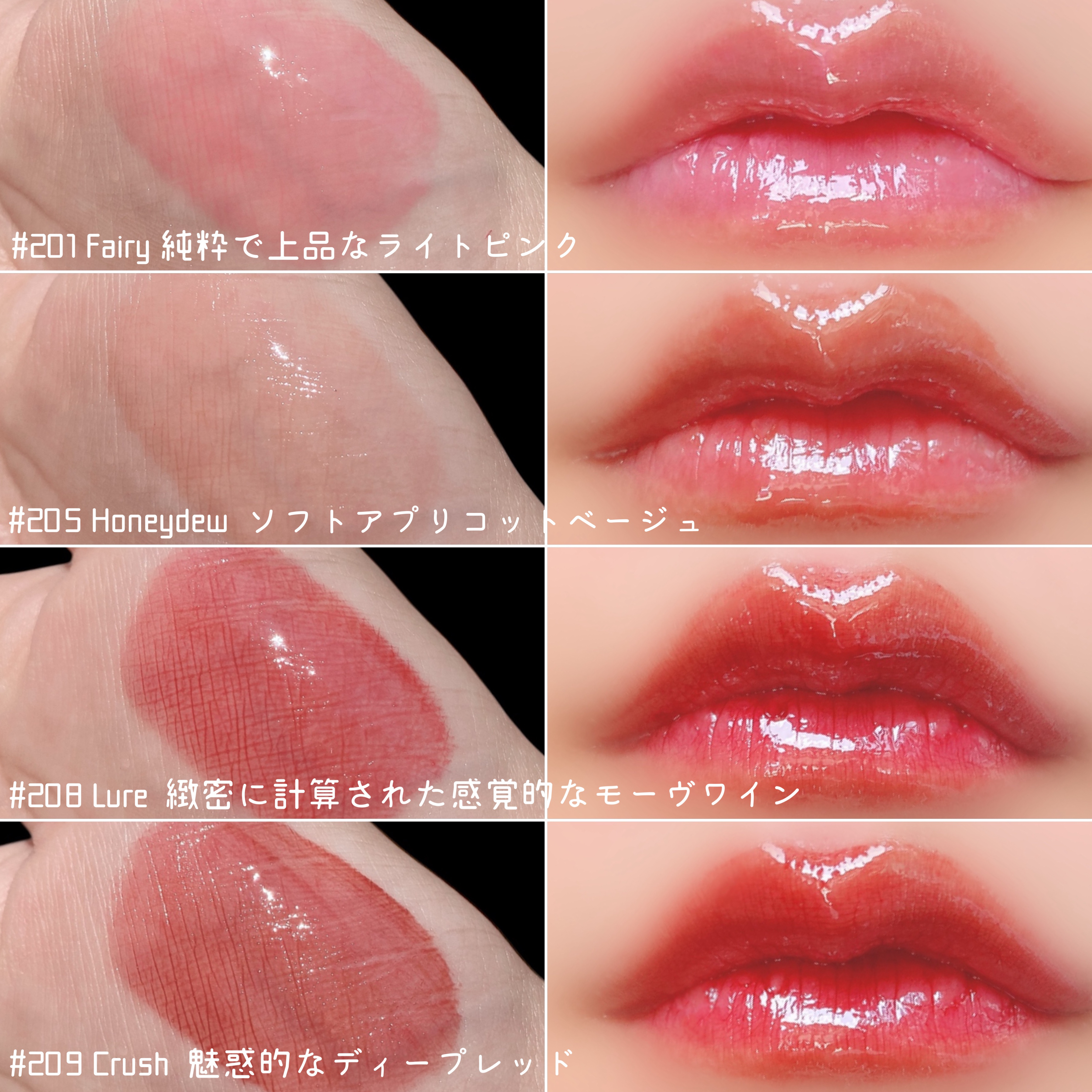 - <201 フェアリー> ダイマージリノール酸ジイソステアリル、ジフェニルシロキシフェニルトリメチコン、ビスジグリセリルポリアシルアジペート-2、水、ジフェニルジメチコン、水添ポリイソブテン、セチルPEG/PPG-10/1ジメチコン、ポリソルベート60、ペンチレングリコール、グリセリン、イソステアリン酸ポリグリセリル-4、フェノキシエタノール、1,2-ヘキサンジオール、セテアレス-20、酸化チタン (CI 77891)、(アクリル酸ヒドロキシエチル/アクリロイルジメチルタウリンNa)コポリマー、ステビオシド、スクワラン、香料、ジラウラミドグルタミドリシンNa、エチルヘキシルグリセリン、エチレンジアミンジコハク酸3Na、赤色227号 (CI 17200)、水酸化Al、黄色5号 (CI 15985)、ポリアクリル酸アンモニウム、イソステアリン酸ソルビタン、黄色4号 (CI 19140)、BG、赤色223号 (CI 45410)、青色1号 (CI 42090)、アラントイン、パンテノール、ツボクサエキス、ヒアルロン酸、加水分解ヒアルロン酸、ヒアルロン酸Na <203 バブリー> ダイマージリノール酸ジイソステアリル、ジフェニルシロキシフェニルトリメチコン、ビスジグリセリルポリアシルアジペート-2、水、ジフェニルジメチコン、水添ポリイソブテン、セチルPEG/PPG-10/1ジメチコン、ポリソルベート60、ペンチレングリコール、グリセリン、イソステアリン酸ポリグリセリル-4、フェノキシエタノール、1,2-ヘキサンジオール、セテアレス-20、(アクリル酸ヒドロキシエチル/アクリロイルジメチルタウリンNa)コポリマー、ステビオシド、酸化チタン (CI 77891)、スクワラン、香料、ジラウラミドグルタミドリシンNa、エチルヘキシルグリセリン、赤色227号 (CI 17200)、エチレンジアミンジコハク酸3Na、黄色5号 (CI 15985)、イソステアリン酸ソルビタン、水酸化Al、ポリアクリル酸アンモニウム、黄色4号 (CI 19140)、BG、青色1号 (CI 42090)、アラントイン、パンテノール、ツボクサエキス、ヒアルロン酸、加水分解ヒアルロン酸、ヒアルロン酸Na <204 レア> ダイマージリノール酸ジイソステアリル、ジフェニルシロキシフェニルトリメチコン、ビスジグリセリルポリアシルアジペート-2、水、ジフェニルジメチコン、水添ポリイソブテン、セチルPEG/PPG-10/1ジメチコン、ポリソルベート60、ペンチレングリコール、グリセリン、イソステアリン酸ポリグリセリル-4、フェノキシエタノール、1,2-ヘキサンジオール、セテアレス-20、(アクリル酸ヒドロキシエチル/アクリロイルジメチルタウリンNa)コポリマー、酸化チタン (CI 77891)、ステビオシド、スクワラン、香料、ジラウラミドグルタミドリシンNa、エチルヘキシルグリセリン、赤色227号 (CI 17200)、黄色5号 (CI 15985)、エチレンジアミンジコハク酸3Na、イソステアリン酸ソルビタン、水酸化Al、ポリアクリル酸アンモニウム、黄色4号 (CI 19140)、青色1号 (CI 42090)、BG、アラントイン、パンテノール、ツボクサエキス、ヒアルロン酸、加水分解ヒアルロン酸、ヒアルロン酸Na <205 ハニーデュー> ダイマージリノール酸ジイソステアリル、ジフェニルシロキシフェニルトリメチコン、ビスジグリセリルポリアシルアジペート-2、水、ジフェニルジメチコン、水添ポリイソブテン、セチルPEG/PPG-10/1ジメチコン、ポリソルベート60、ペンチレングリコール、グリセリン、イソステアリン酸ポリグリセリル-4、フェノキシエタノール、1,2-ヘキサンジオール、セテアレス-20、(アクリル酸ヒドロキシエチル/アクリロイルジメチルタウリンNa)コポリマー、酸化チタン (CI 77891)、ステビオシド、スクワラン、香料、ジラウラミドグルタミドリシンNa、エチルヘキシルグリセリン、赤色227号 (CI 17200)、黄色5号 (CI 15985)、エチレンジアミンジコハク酸3Na、イソステアリン酸ソルビタン、水酸化Al、ポリアクリル酸アンモニウム、黄色4号 (CI 19140)、青色1号 (CI 42090)、BG、アラントイン、パンテノール、ツボクサエキス、ヒアルロン酸、加水分解ヒアルロン酸、ヒアルロン酸Na <206 トフィー> ダイマージリノール酸ジイソステアリル、ジフェニルシロキシフェニルトリメチコン、ビスジグリセリルポリアシルアジペート-2、水、ジフェニルジメチコン、水添ポリイソブテン、セチルPEG/PPG-10/1ジメチコン、ポリソルベート60、ペンチレングリコール、グリセリン、イソステアリン酸ポリグリセリル-4、フェノキシエタノール、1,2-ヘキサンジオール、セテアレス-20、(アクリル酸ヒドロキシエチル/アクリロイルジメチルタウリンNa)コポリマー、ステビオシド、スクワラン、香料、ジラウラミドグルタミドリシンNa、酸化チタン (CI 77891)、エチルヘキシルグリセリン、黄色5号 (CI 15985)、エチレンジアミンジコハク酸3Na、黄色4号 (CI 19140)、赤色227号 (CI 17200)、イソステアリン酸ソルビタン、赤色223号 (CI 45410)、青色1号 (CI 42090)、水酸化Al、ポリアクリル酸アンモニウム、BG、アラントイン、パンテノール、ツボクサエキス、ヒアルロン酸、加水分解ヒアルロン酸、ヒアルロン酸Na <207 フレイム> ダイマージリノール酸ジイソステアリル、ジフェニルシロ