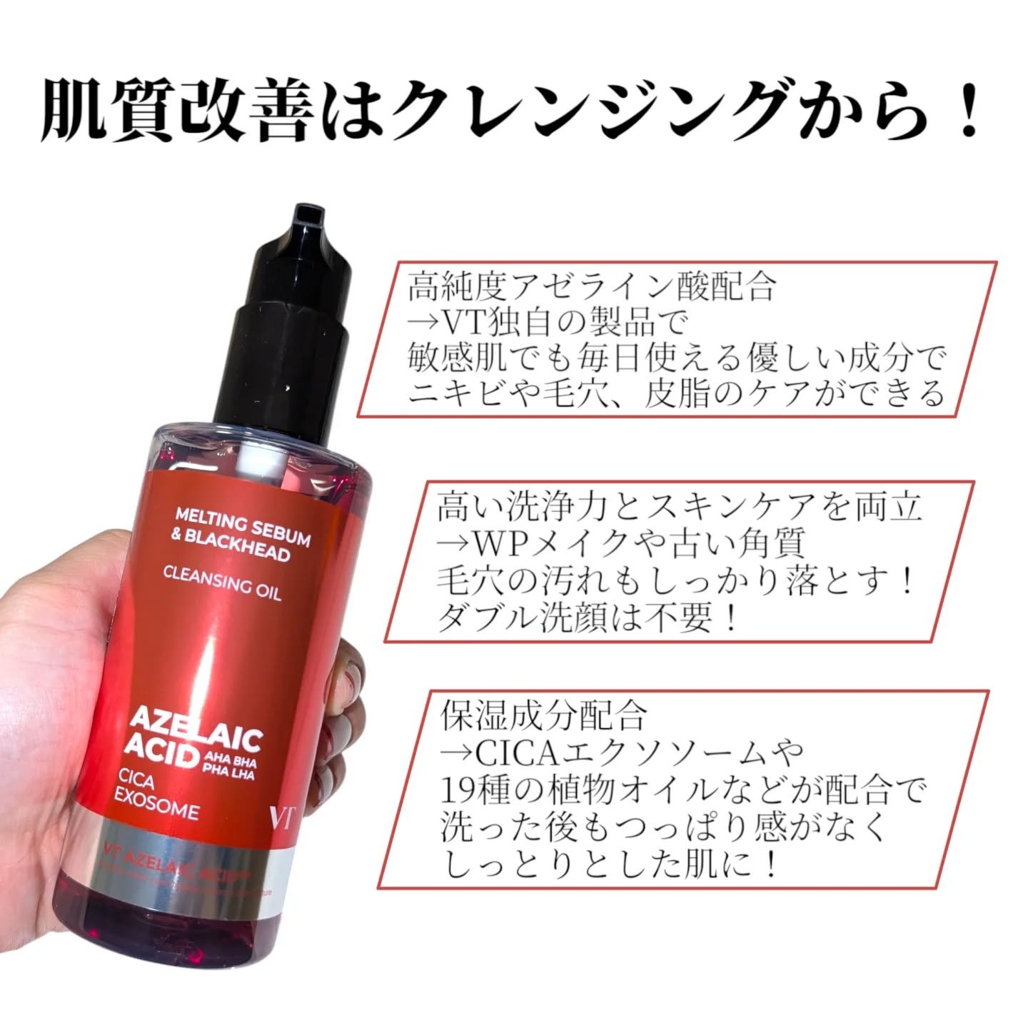 - 最近話題の毛穴ケア・整肌成分アゼライン酸!VTからはクレンジングオイルが登場! ポイントメイクまで落とすしっかりした洗浄力で、毛穴・皮脂までケアし保湿まで叶える一石三鳥アゼライン酸クレンジングオイル。 19種の植物性オイル*1も配合で、目に見えるブラッドヘッド*2から、隠れているホワイトヘッド*2、皮脂まですっきりケアします! ダブル洗顔不要! ※パッケージリニューアル ■このような方へおすすめ メイク・毛穴までディープクレンジング求める方 クレンジングでスキンケアまで行いたい方 ツッパリ感の少ないクレンジングを探していた方 ブラックヘッド*ケアも行いたい方 *1ダイズ油、アルガニアスピノサ核油、ユズ果実油、コメヌカ油、オタネニンジン種子油、アーモンド油、ザクロ種子油、リンゴ種子油、ホホバ種子油、ツバキ種子油、、バオバブ種子油、ユチャ種子油、ベニバナ種子油、ヒマワリ種子油、ヒポファエラムノイデス油、オリーブ果実油、アボカド油、アンズ核油、クロフサスグリ種子油(いずれも保湿) *2古い角質による
