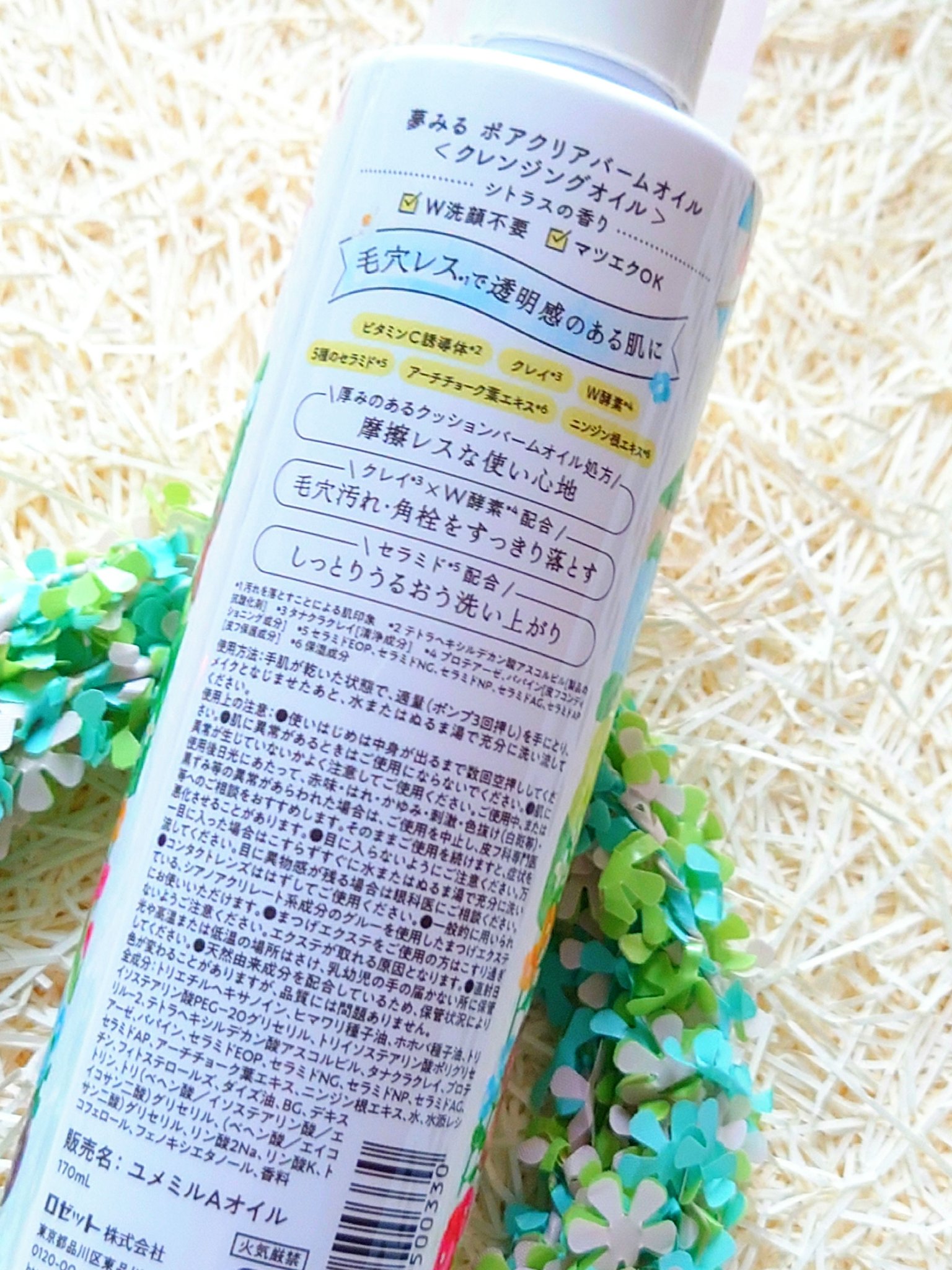 - <夢みる ポアクリアバームオイル> トリエチルヘキサノイン、ヒマワリ種子油、ホホバ種子油、トリイソステアリン酸PEG-20グリセリル、トリイソステアリン酸ポリグリセリル-2、テトラヘキシルデカン酸アスコルビル、タナクラクレイ、プロテアーゼ、パパイン、セラミドEOP、セラミドNG、セラミドNP、セラミドAG、セラミドAP、アーチチョーク葉エキス、ニンジン根エキス、水、水添レシチン、フィトステロールズ、ダイズ油、BG、デキストリン、トリ(ベヘン酸/イソステアリン酸/エイコサン二酸)グリセリル、(ベヘン酸/エイコサン二酸)グリセリル、リン酸2Na、リン酸K、トコフェロール、フェノキシエタノール、香料