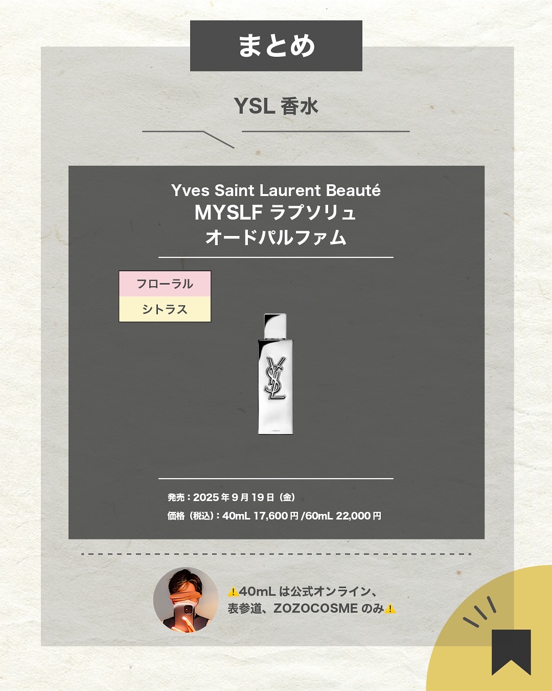 . 『YSL 数量限定』 🌳製品情報🌳 Yves Saint Laurent Beauté MYSLF ラプソリュ オードパルファム 発売:2025年9月19日(金) 価格(税込):40mL 17,600円/60mL 22,000円 引用 Yves Saint Laurent Beauté公式HP ファッションプレスHP -------------- エスログ┊1日1分のモテ香水紹介 @slog_bt ▷19時投稿 ▷毎月200万人が訪れる国内最大級の香水アカウント👑 -------------- #フレグランス #香水マニア #香水好き #香りフェチ #香り好きな人と繋がりたい #YvesSaintLaurentBeauté #YSL #フローラル #シトラス