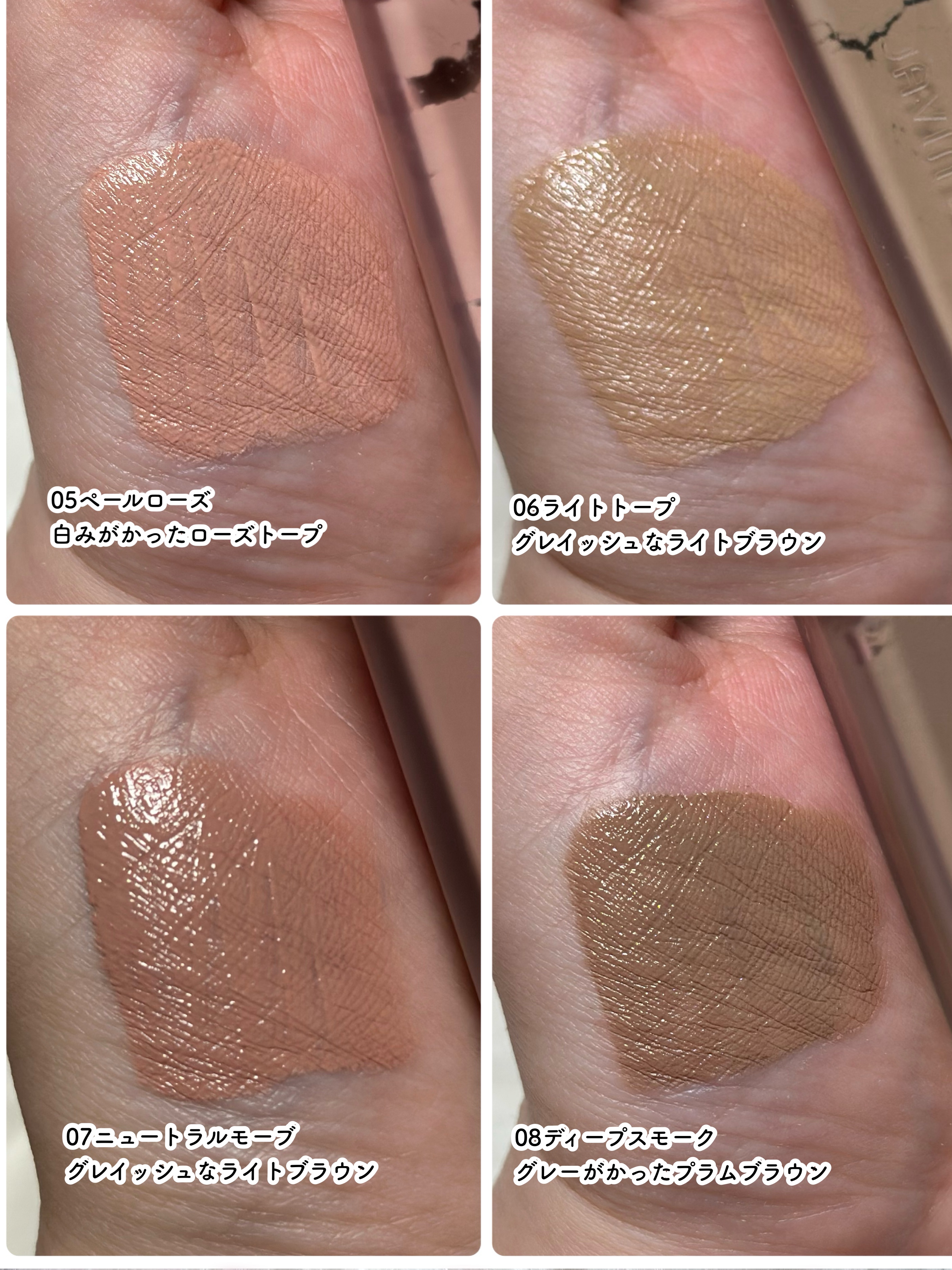 - <01 ペールジンジャー> インドデカン、シリカ、(アクリレーツ/メタクリル酸ポリトリメチルシロキシ)コポリマー、酸化チタン、水添(スチレン/インプレン)コポリマー、オクチルドデカノール、水添ポリデセン、(カプリル酸/プリン酸)グリセリル、メタクリル酸メチルクロスポリマー、黄色酸化鉄、ジステアルジモニウムヘクトライト、マイカ、赤色酸化鉄、炭酸プロピレン、トリエトキシカプリリルシラン、水酸化Al、黒色酸化鉄、トコフェロール <02 ライトウッド> イソドデカン、シリカ、(アクリレーツ/メタクリル酸ポリトリメチルシロキシ)コポリマー、水添(スチレン/イソプレン)コポリマー、オクチルドデカノール、水添ポリデセン、(カプリル酸/カプリン酸)グリセリズ、メタクリル酸メチルクロスポリマー、ジステアルジモニウムヘクトライト、トリエトキシカプリリルシラン、炭酸プロピレン、水酸化Al、トコフェロール、酸化チタン、酸化鉄、マイカ <03 ニュートラルナッツ> イソドデカン、シリカ、(アクリレーツ/メタクリル酸ポリトリメチルシロキシ)コポリマー、水添(スチレン/イソプレン)コポリマー、オクチルドデカノール、水添ポリデセン、(カプリル酸/カプリン酸)グリセリズ、メタクリル酸メチルクロスポリマー、ジステアルジモニウムヘクトライト、トリエトキシカプリリルシラン、炭酸プロピレン、水酸化Al、トコフェロール、酸化チタン、酸化鉄、マイカ <04 ディープコーラル> イソドデカン、シリカ、(アクリレーツ/メタクリル酸ポリトリメチルシロキシ)コポリマー、水添(スチレン/イソプレン)コポリマー、オクチルドデカノール、水添ポリデセン、(カプリル酸/カプリン酸)グリセリズ、メタクリル酸メチルクロスポリマー、ジステアルジモニウムヘクトライト、トリエトキシカプリリルシラン、炭酸プロピレン、水酸化Al、トコフェロール、酸化チタン、酸化鉄、マイカ <05 ペールローズ> イソドデカン、シリカ、(アクリレーツ/メタクリル酸ポリトリメチルシロキシ)コポリマー、水添(スチレン/イソプレン)コポリマー、オクチルドデカノール、水添ポリデセン、(カプリル酸/カプリン酸)グリセリズ、メタクリル酸メチルクロスポリマー、ジステアルジモニウムヘクトライト、炭酸プロピレン、トリエトキシカプリリルシラン、水酸化Al、トコフェロール、酸化チタン、酸化鉄、マイカ <06 ライトトープ> イソドデカン、シリカ、(アクリレーツ/メタクリル酸ポリトリメチルシロキシ)コポリマー、水添(スチレン/イソプレン)コポリマー、オクチルドデカノール、水添ポリデセン、(カプリル酸/カプリン酸)グリセリズ、メタクリル酸メチルクロスポリマー、ジステアルジモニウムヘクトライト、炭酸プロピレン、トリエトキシカプリリルシラン、水酸化Al、トコフェロール、酸化チタン、酸化鉄、マイカ <07 ニュートラルモーブ> イソドデカン、シリカ、(アクリレーツ/メタクリル酸ポリトリメチルシロキシ)コポリマー、水添(スチレン/イソプレン)コポリマー、オクチルドデカノール、水添ポリデセン、(カプリル酸/カプリン酸)グリセリズ、メタクリル酸メチルクロスポリマー、ジステアルジモニウムヘクトライト、炭酸プロピレン、トリエトキシカプリリルシラン、水酸化Al、トコフェロール、酸化チタン、酸化鉄、マイカ <08 ディープスモーク> イソドデカン、シリカ、(アクリレーツ/メタクリル酸ポリトリメチルシロキシ)コポリマー、水添(スチレン/イソプレン)コポリマー、オクチルドデカノール、水添ポリデセン、(カプリル酸/カプリン酸)グリセリズ、メタクリル酸メチルクロスポリマー、ジステアルジモニウムヘクトライト、炭酸プロピレン、トリエトキシカプリリルシラン、水酸化Al、トコフェロール、酸化チタン、酸化鉄、マイカ
