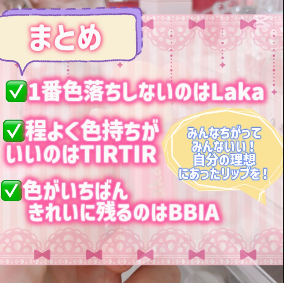 落ちないと話題のこのリップ…💄╭╮どれが1番色持ちするの〜!!╰━v╯…という訳で!今回はどれが1番色持ちがいいのか検証してみましたっ(*`・ω・´)❣️これからリップを検討中の方色落ちしないリップが欲しい方ぜひぜひ参考にしてください😺✨✎︎...