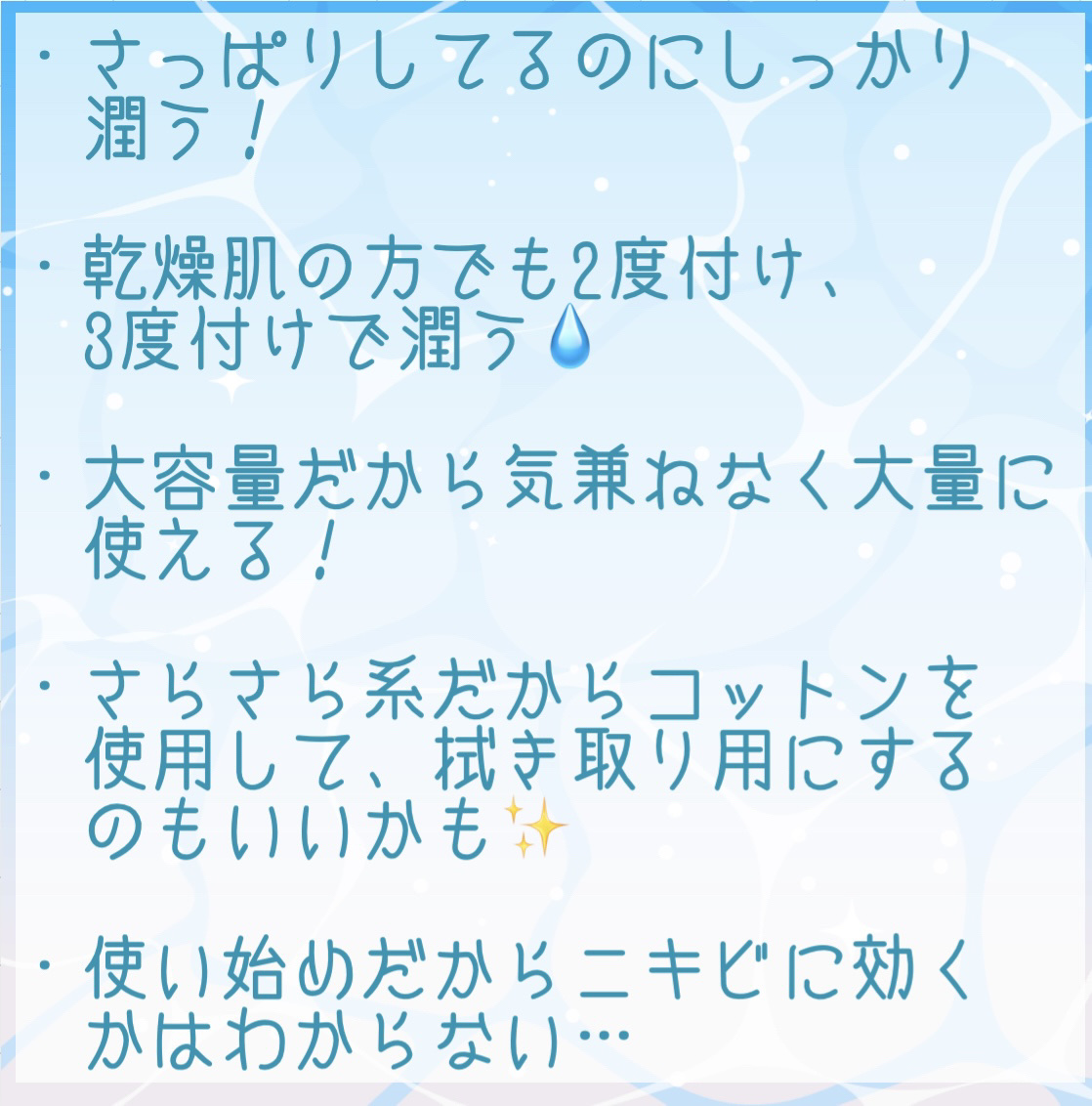 濡れた手でも使える! 使用後の肌がいつもと違う!? 化粧水がしっかり浸透してもちもち肌に 肌に優しい✨ 週に1〜2回しか使わないので、減りが少ないです。ちょっと高いかもと思った方でも試す価値ありです∩^ω^∩