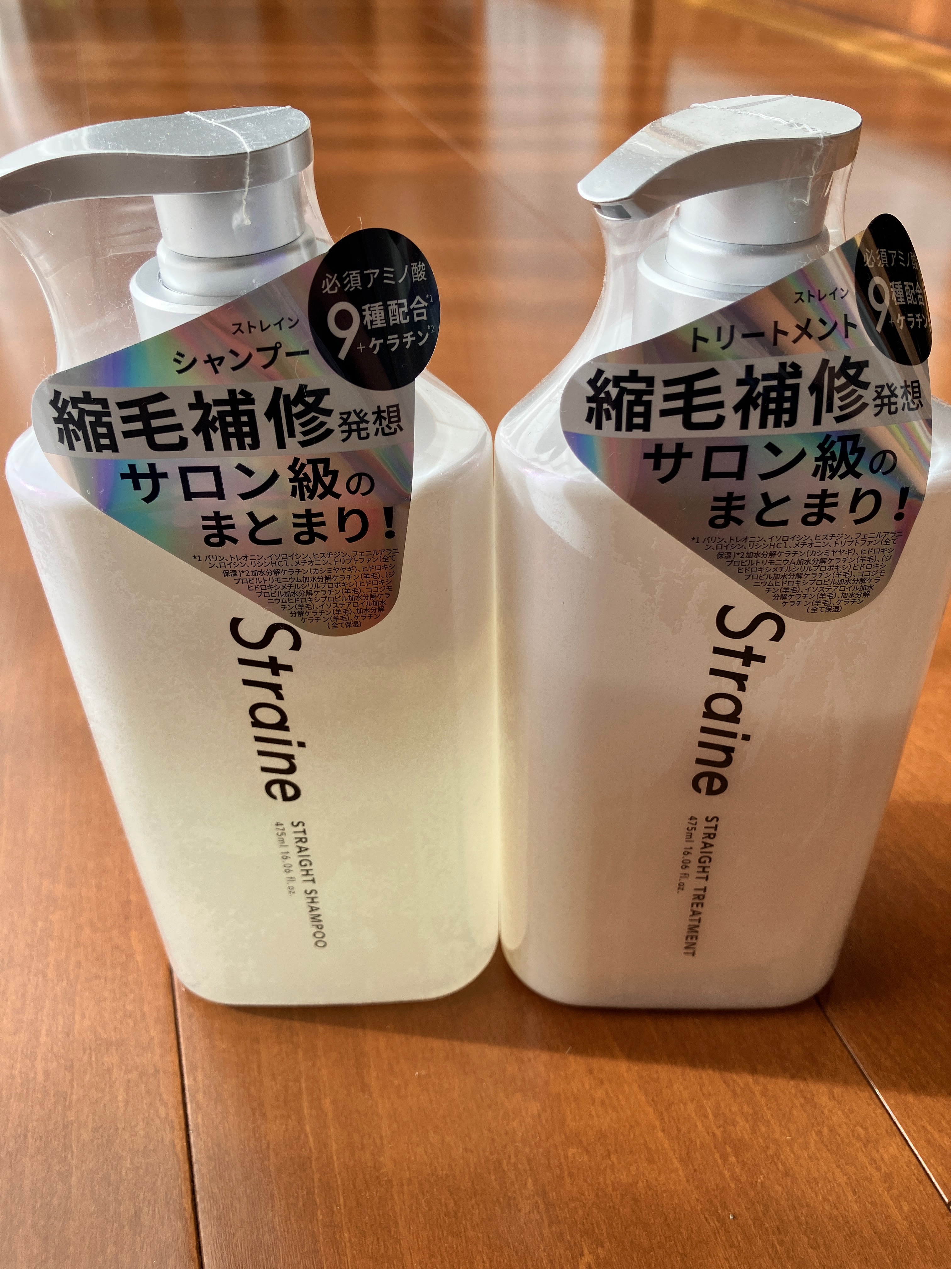Straineストレートシャンプー/ストレートトリートメント髪内部のうねり原因を補修してストレートヘアを目指すシャンプー&トリートメント✨上から見ると三角形のデザインシャンプーはさらっとしたテクスチャー泡立ちは良くて...