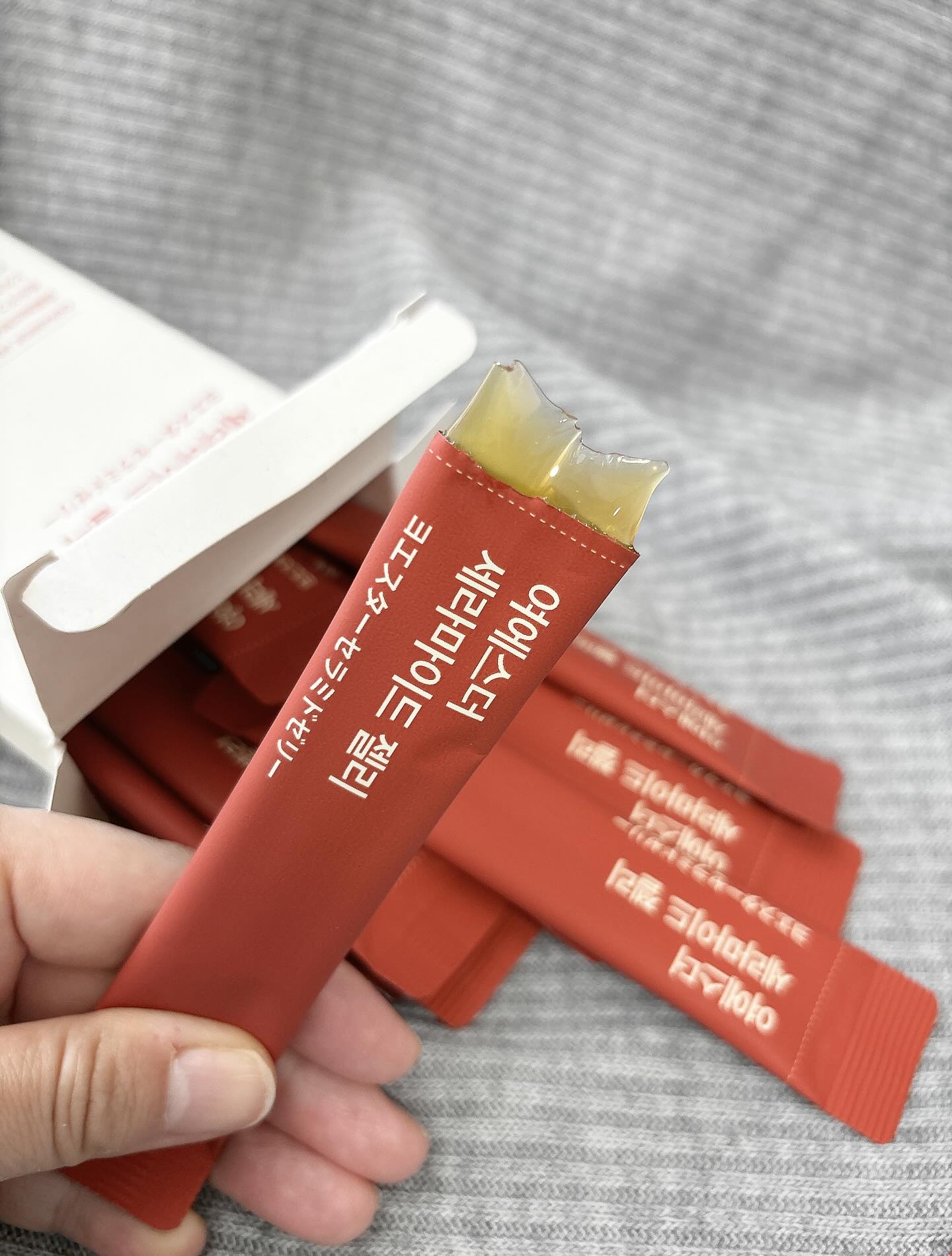1本あたりに保湿の核心成分のセラミドがたっぷり✨ 1本でグルコシルセラミドだけでなくヒアルロン酸、コラーゲン、サケ鼻軟骨粉末、ビタミンC、複合オウゴンエキスまで◎ ややかためのゼリーのような食感。味はピーチのよう。酸味もあって美味しく食べれるから続けやすい🥰