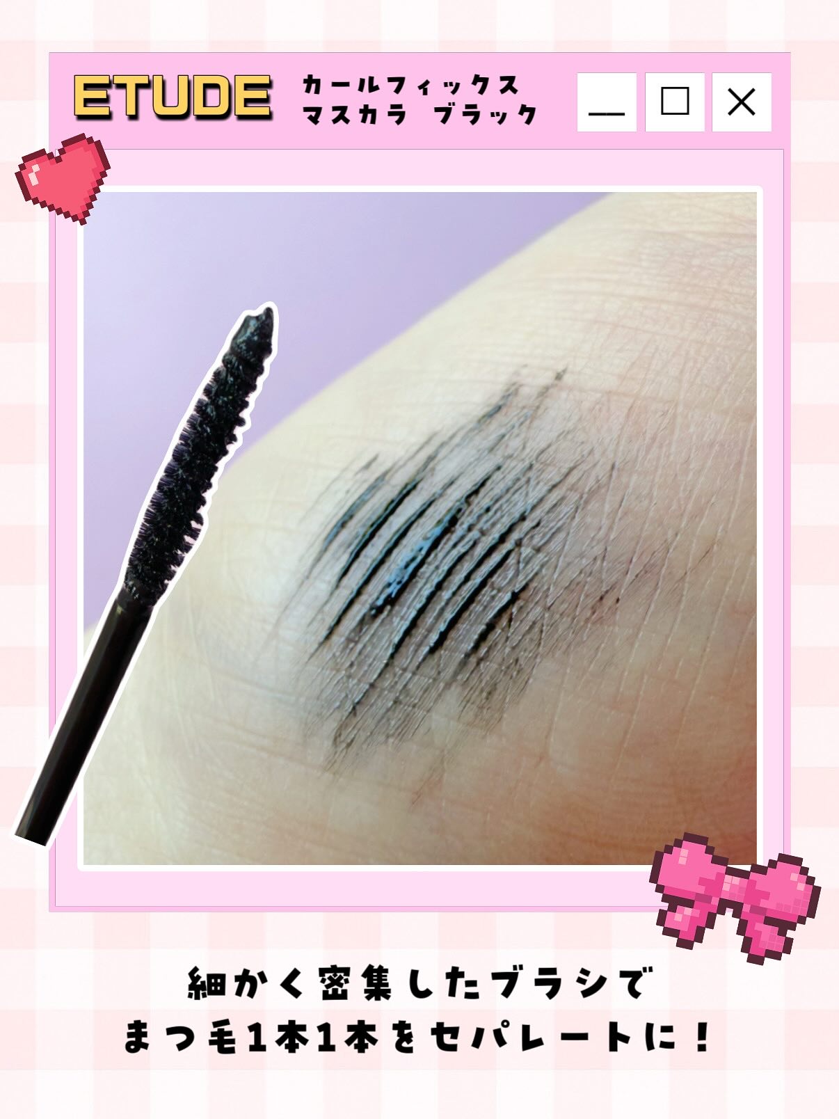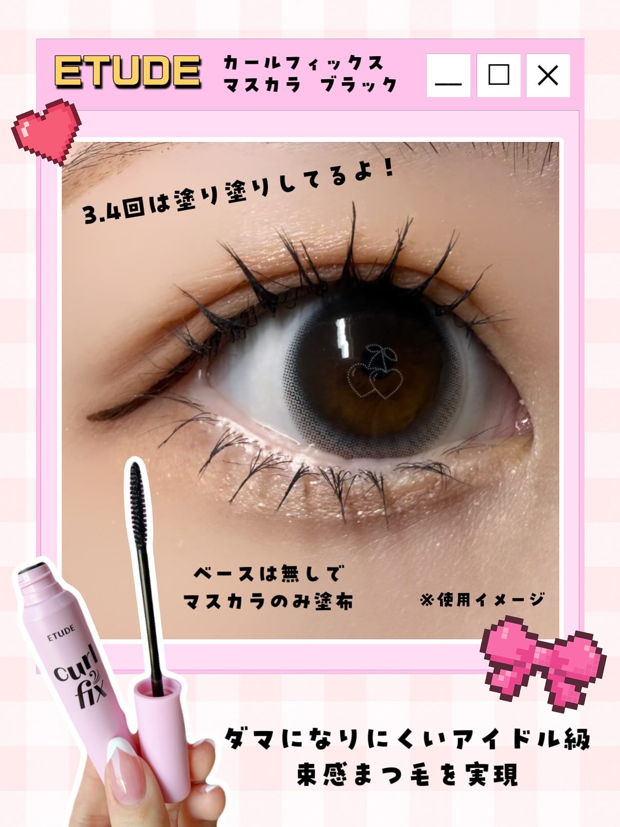 👀ETUDEカールフィックスマスカラ🖤24時間*1上向きカールをキープするカールフィックスマスカラ👀✨重ね塗りしてもダマになりにくく、ブラシがとても使いやすい✨ナチュラル感も出せるし、束感にもできる👌🏻束感出したかったら根本からさっと上げたあ...