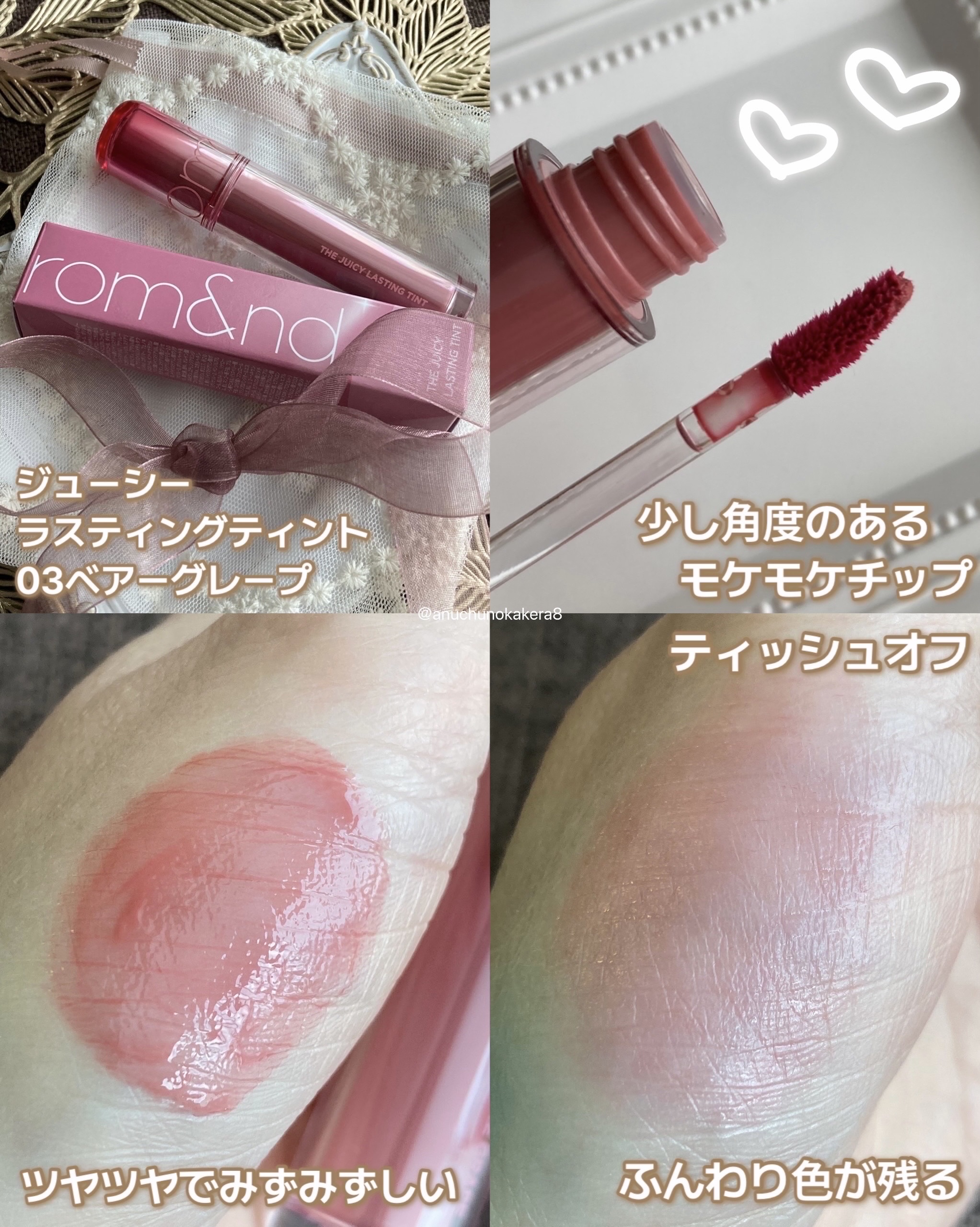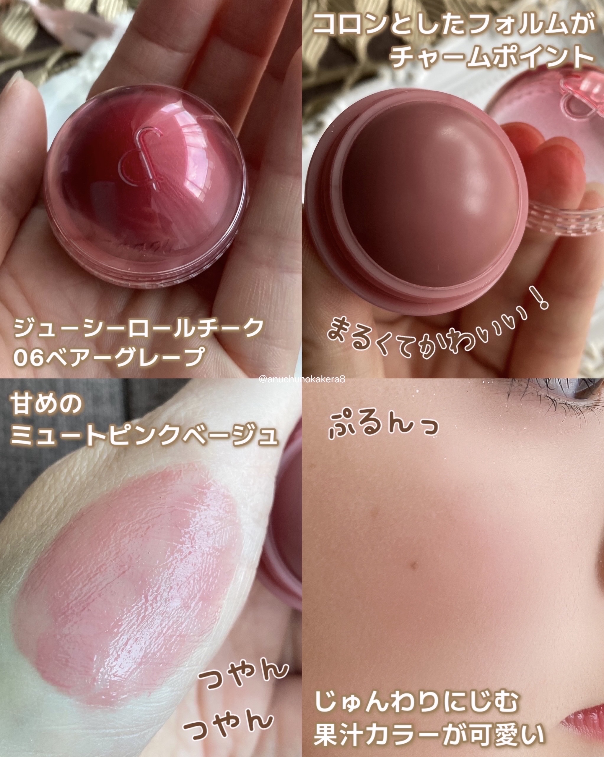 rom&ndさまから商品提供いただきましたrom&ndジューシーロールチーク内容量 8.4g1,430円(税込)ザジューシーラスティングティント🍇透明感あるレア光沢メイクしてみたよ💜どちらも使ったカラーはベアーグレープ🍇ぶどうの果実のような甘...