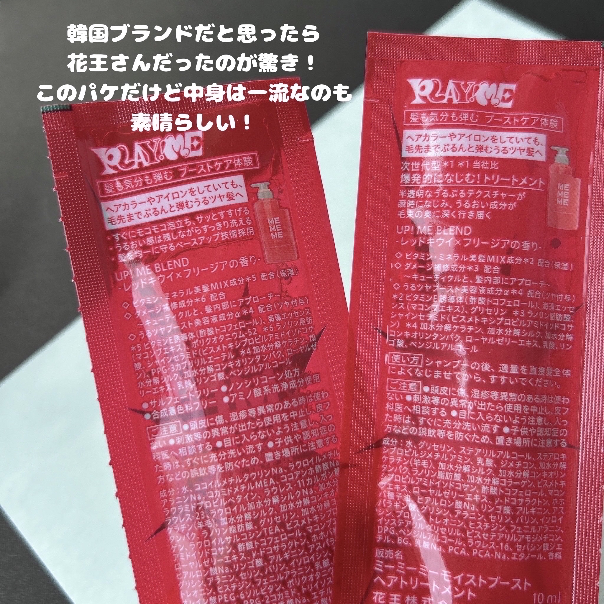 - ヘアカラーやアイロンをしていても、毛先までぷるんと弾む自信がみなぎるうるツヤ髪へ 【モイストブーストシャンプー】 ・すぐにモコモコ泡立ち、サッとすすげる! ・うるおい感は残しながらすっきり洗える ・髪を均一に守るベースアップ技術採用 【モイストブーストトリートメント】 次世代型*¹ 素早く一気になじむトリートメント。 ・半透明なうるぷるテクスチャーが瞬時になじみ、うるおい成分が毛束のすみずみまで行き届く ●サルフェートフリー ●合成着色料フリー シャンプーのみ:●ノンシリコーン処方 ●アミノ酸系洗浄成分使用*² UP! ME BLEND レッドキウイ×フリージアの香り ◇ビタミン・ミネラル美髪MIX成分*³配合(保湿) ◇うるツヤブースト美容液成分α*⁴配合(ツヤ付与) ◇ダメージ補修成分*⁵ ~キューティクルと、髪内部にアプローチ~ *1 花王内 *2 ココイルメチルタウリンNa、ラウロイルメチルアラニンNa、ラウロイルサルコシンTEA *3 ビタミンE誘導体(酢酸トコフェロール)、海藻エッセンス(マコンブエキス)、ポリクオタニウム-52(シャンプーのみ)、グリセリン(トリートメントのみ) *4 加水分解ケラチン、加水分解シルク、加水分解コンキオリンタンパク、ローヤルゼリーエキス、乳酸、リンゴ酸、ベンジルアルコール *5 ラノリン脂肪酸、シャインセラミド(ビスメトキシプロピルアミドイソドコサン)、PPG-3カプリリルエーテル(シャンプーのみ)