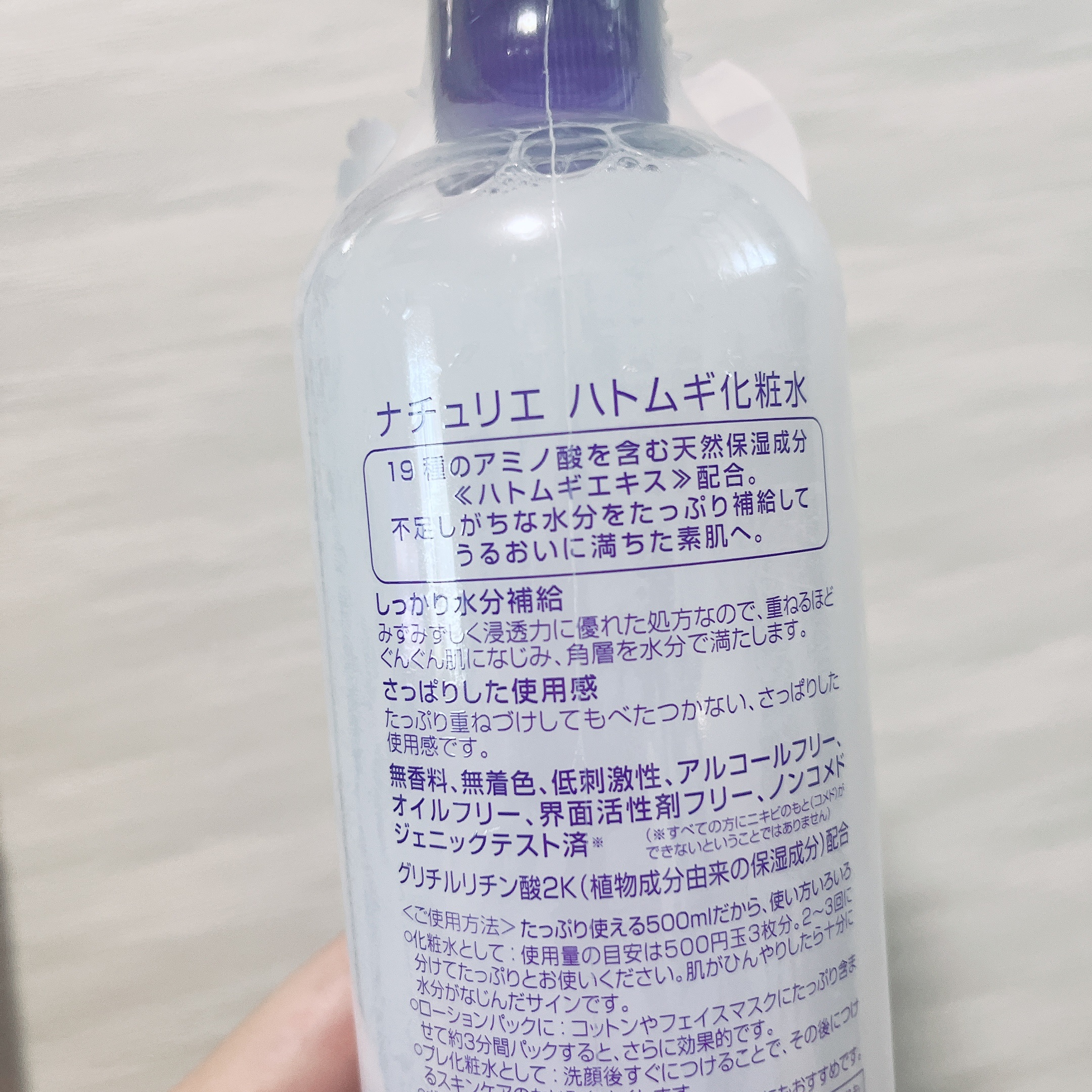 - <通常サイズ 500ml> 水、DPG、BG、グリセリン、ハトムギエキス、グリチルリチン酸2K、(スチレン/VP)コポリマー、クエン酸、クエン酸Na、メチルパラベン <500ml+ 限定ムーミンデザインボトル> 水、DPG、BG、グリセリン、ハトムギエキス、グリチルリチン酸2K、(スチレン/VP)コポリマー、クエン酸、クエン酸Na、メチルパラベン <詰め替えタイプ 480ml> 水、DPG、BG、グリセリン、ハトムギエキス、グリチルリチン酸2K、(スチレン/VP)コポリマー、クエン酸、クエン酸Na、メチルパラベン <旧製品> BG、グリセリン、メチルパラベン、エタノール、グリチルリチン酸2K、ハトムギエキス、DPG、クエン酸Na、プロピルパラベン、クエン酸、(スチレン/アクリレーツ)コポリマー、水 <限定ムーミンデザイン> 水、DPG、BG、グリセリン、ハトムギエキス、グリチルリチン酸2K、(スチレン/VP)コポリマー、クエン酸、クエン酸Na、メチルパラベン