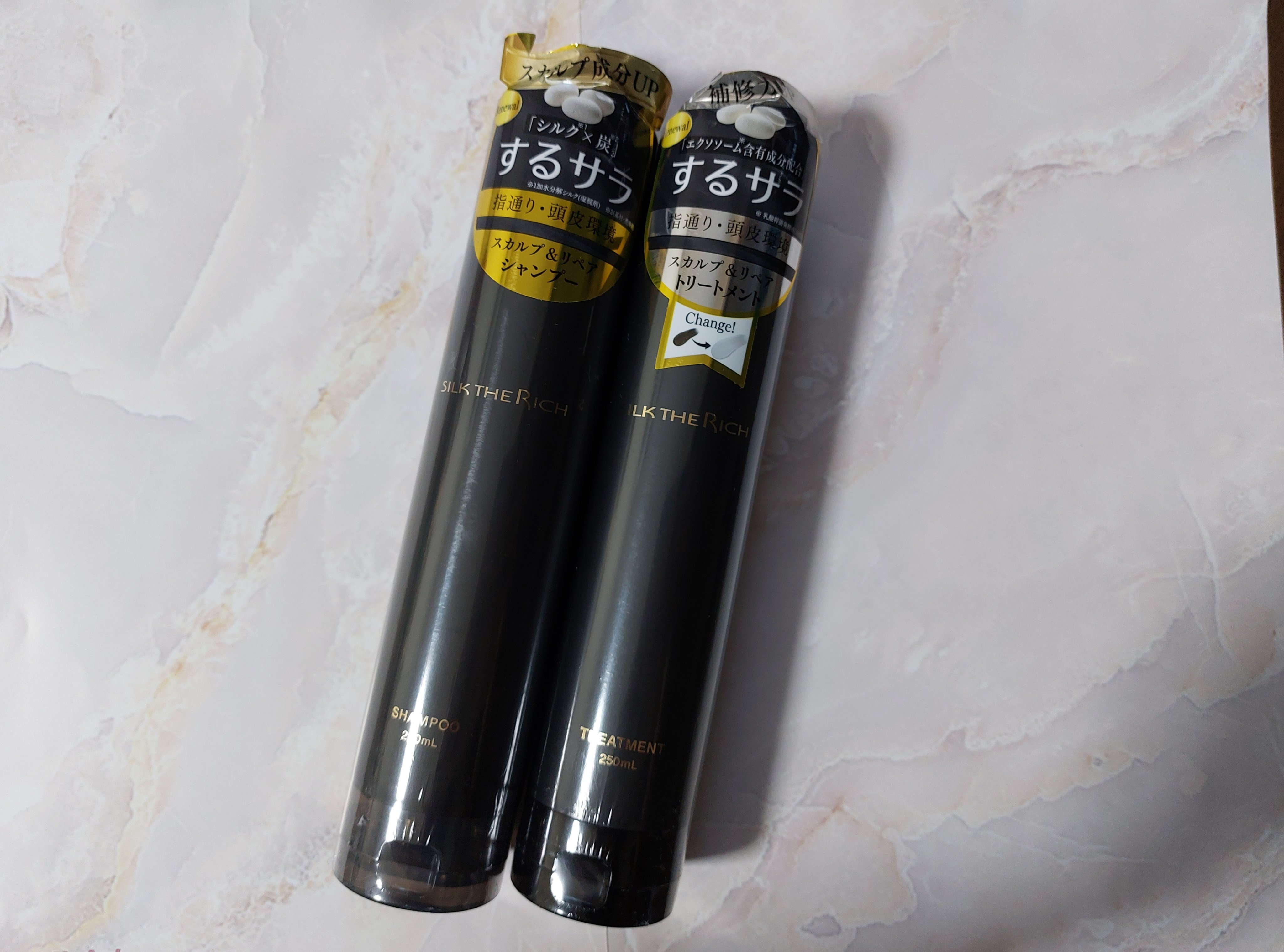 シルクザリッチ【スカルプ&リペア】シャンプー・トリートメントこだわりの3種のシルク成分と美容成分、さらに7種のスカルプ成分を配合したシャンプーと、トリートメントです。シャンプーは黒いテクスチャーで、きめ細かい泡で洗いやすかったです。トリートメ...