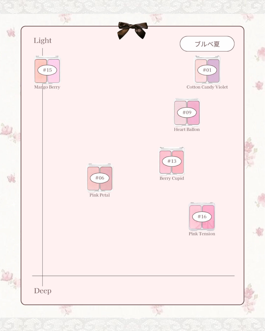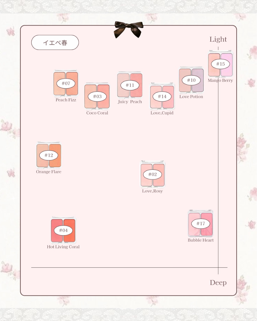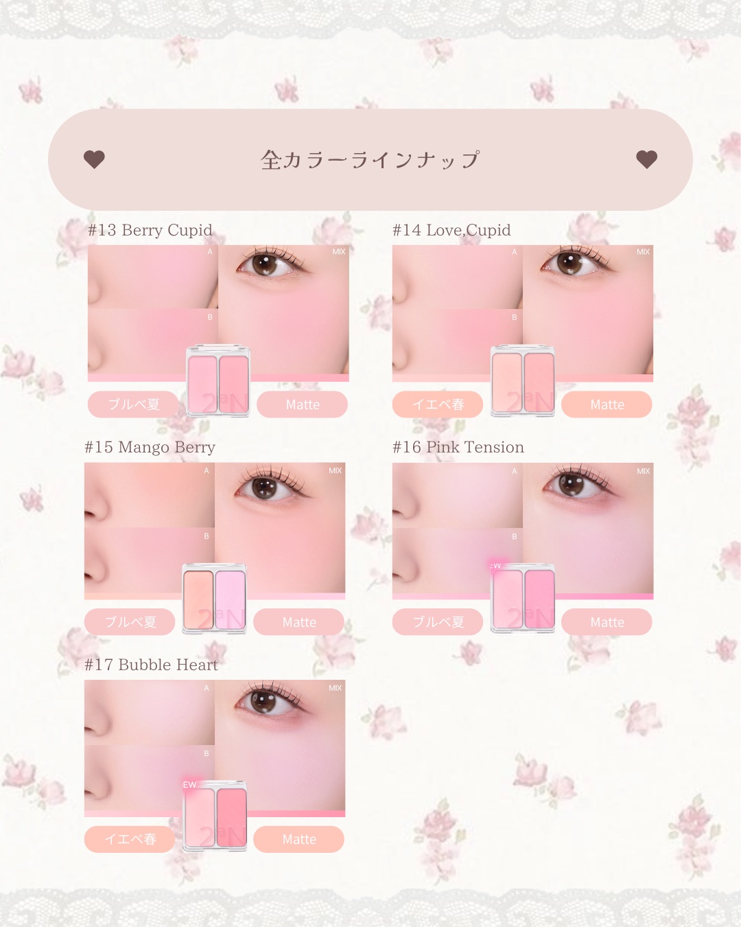 - <【新】01 コットンキャンディバイオレット> タルク、マイカ、ナイロン-12、シリカ、フェニルトリメチコン、ステアロイルオキシステアリン酸オクチルドデシル、酸化チタン、ミリスチン酸Mg、窒化ホウ素、ステアリン酸Mg、ジエチルヘキサン酸ネオペンチルグリコール、メチルプロパンジオール、グンジョウ、プロパンジオール、リンゴ酸ジイソステアリル、ヘキサ(ヒドロキシステアリン酸/ステアリン酸/ロジン酸)ジペンタエリスリチル、ネオペンタン酸イソステアリル、ジメチコン、ラウロイルリシン、トリ(カプリル酸/カプリン酸)グリセリル、ポリブテン、水添レシチン、トリエトキシカプリリルシラン、メチコン、赤226、黄4、酸化鉄、水 <【新】02 ラブロージー> タルク、マイカ、酸化チタン、ナイロン-12、シリカ、ステアロイルオキシステアリン酸オクチルドデシル、フェニルトリメチコン、ミリスチン酸Mg、ジメチコン、メチルプロパンジオール、ステアリン酸Mg、リンゴ酸ジイソステアリル、ヘキサ(ヒドロキシステアリン酸/ステアリン酸/ロジン酸)ジペンタエリスリチル、酸化鉄、マカデミア種子油、プロパンジオール、ステアリン酸ジメチコノール、赤226、ラウロイルリシン、トリエトキシカプリリルシラン、グンジョウ、黄4、水 <【新】05 ムードインチーク> タルク、マイカ、ナイロン-12、シリカ、酸化チタン、ステアロイルオキシステアリン酸オクチルドデシル、フェニルトリメチコン、窒化ホウ素、ミリスチン酸Mg、ステアリン酸Mg、酸化鉄、メチルプロパンジオール、ジメチコン、プロパンジオール、ラウロイルリシン、カルミン、水添レシチン、グンジョウ、赤226、メチコン、トリエトキシカプリリルシラン、黄4、水 <【新】06 ピンクペタル> タルク、マイカ、ナイロン-12、酸化チタン、シリカ、ミリスチン酸Mg、ジエチルヘキサン酸ネオペンチルグリコール、フェニルトリメチコン、ステアリン酸Mg、メチルプロパンジオール、ヘキサ(ヒドロキシステアリン酸/ステアリン酸/ロジン酸)ジペンタエリスリチル、リンゴ酸ジイソステアリル、ネオペンタン酸イソステアリル、ステアロイルオキシステアリン酸オクチルドデシル、プロパンジオール、トリ(カプリル酸/カプリン酸)グリセリル、ポリブテン、ラウロイルリシン、ジメチコン、酸化鉄、水添レシチン、グンジョウ、メチコン、赤226、トリエトキシカプリリルシラン、黄4、水酸化Al、酸化スズ <【新】07 ピーチフィズ> タルク、マイカ、ナイロン-12、酸化チタン、シリカ、ミリスチン酸Mg、ジエチルヘキサン酸ネオペンチルグリコール、フェニルトリメチコン、ステアリン酸Mg、メチルプロパンジオール、ヘキサ(ヒドロキシステアリン酸/ステアリン酸/ロジン酸)ジペンタエリスリチル、リンゴ酸ジイソステアリル、ネオペンタン酸イソステアリル、ステアロイルオキシステアリン酸オクチルドデシル、酸化鉄、プロパンジオール、トリ(カプリル酸/カプリン酸)グリセリル、ラウロイルリシン、ポリブテン、黄4、ジメチコン、水添レシチン、メチコン、赤226、黄5、トリエトキシカプリリルシラン、グンジョウ、水酸化Al、酸化スズ <【新】08 ヌードヘイズ> タルク、マイカ、ナイロン-12、酸化チタン、シリカ、ミリスチン酸Mg、ジエチルヘキサン酸ネオペンチルグリコール、フェニルトリメチコン、ステアリン酸Mg、メチルプロパンジオール、ヘキサ(ヒドロキシステアリン酸/ステアリン酸/ロジン酸)ジペンタエリスリチル、リンゴ酸ジイソステアリル、ネオペンタン酸イソステアリル、ステアロイルオキシステアリン酸オクチルドデシル、プロパンジオール、酸化鉄、トリ(カプリル酸/カプリン酸)グリセリル、ラウロイルリシン、ポリブテン、グンジョウ、ジメチコン、水添レシチン、メチコン、トリエトキシカプリリルシラン、赤226、水酸化Al、酸化スズ、黄4 <【新】09 ハートバルーン> マイカ、ジメチコン、酸化チタン、合成フルオロフロゴパイト、ナイロン-12、ポリメタクリル酸メチル、(ジフェニルジメチコン/ビニルジフェニルジメチコン/シルセスキオキサン)クロスポリマー、シリカ、ポリメチルシルセスキオキサン、ホウケイ酸(Ca/Al)、ミリスチン酸Mg、グリセリン、ペンチレングリコール、ホウケイ酸(Ca/Na)、ホウケイ酸(Ca/チタン)、トリエトキシカプリリルシラン、ポリソルベート20、アクリル酸Na/アクリロイルジメチルタウリンNa)コポリマー、ケイ酸(Al/Mg)、(ビニルジメチコン/メチコンシルセスキオキサン)クロスポリマー、オリーブ油脂肪酸ソルビタン、ステアリン酸ソルビタン、イソヘキサデカン、赤226、デヒドロ酢酸Na、酸化スズ、エチルヘキシルグリセリン、グンジョウ、水酸化Al、ポリソルベート80、メチコン、オレイン酸ソルビタン、トコフェロール <【新】10 ラブポーション> マイカ、酸化チタン、ジメチコン、合成フルオロフロゴパイト、ナイロン-12、ポリメタクリル酸メチル、(ジフェニルジメチコン/ビニルジフェニルジメチコン/シルセスキオ