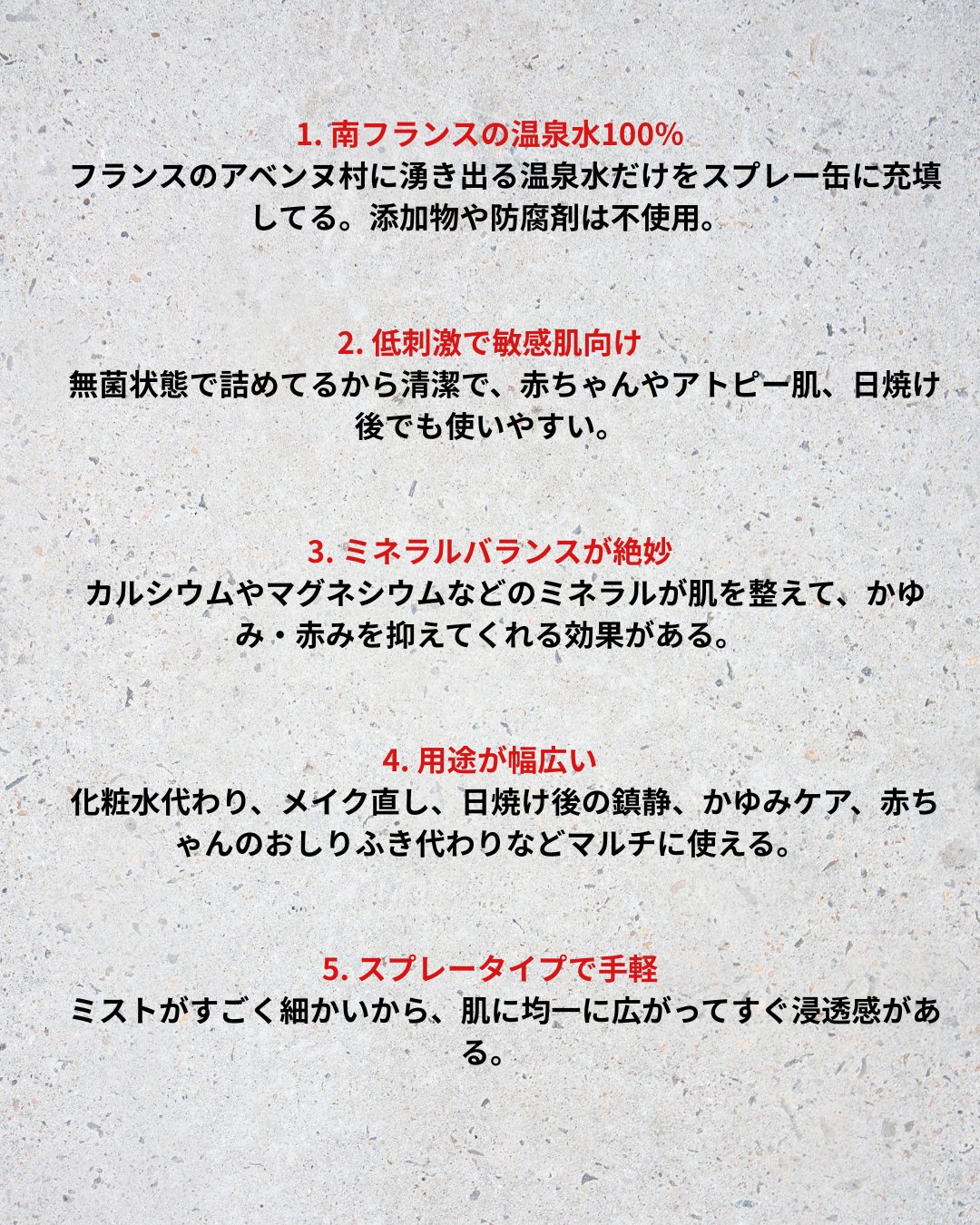 - 肌にいい水、アベンヌ温泉水100%。 肌をやわらげ、みずみずしくなめらかにし、敏感な肌をやさしく落ちつかせます。 使いやすいスプレータイプの化粧水。 ~こんなとき、こんな方におすすめ~ ●洗顔後・毎日のお手入れに ●敏感肌をはじめ肌あれ・乾燥肌~オイリー肌など、すべての肌タイプ ●化粧水の前に、プレ化粧水として ●年齢性別を問わずすべての方に ●赤ちゃん(生後3ヵ月~)のデリケートな肌のお手入れに ●外出や旅先でのお手入れに ●乾燥しがちな機内やホテルでの水分補給に ●脱毛・脱色後のデリケートな肌に 無菌室製造/無香料/無着色/アルコール(エタノール)フリー/防腐剤フリー/アレルギーテスト・パッチテスト・ノンコメドジェニックテスト済み ※すべての方にアレルギーや皮ふ刺激がおきない、また、ニキビができないわけではありません。 ※2024年9月より順次パッケージリニューアル