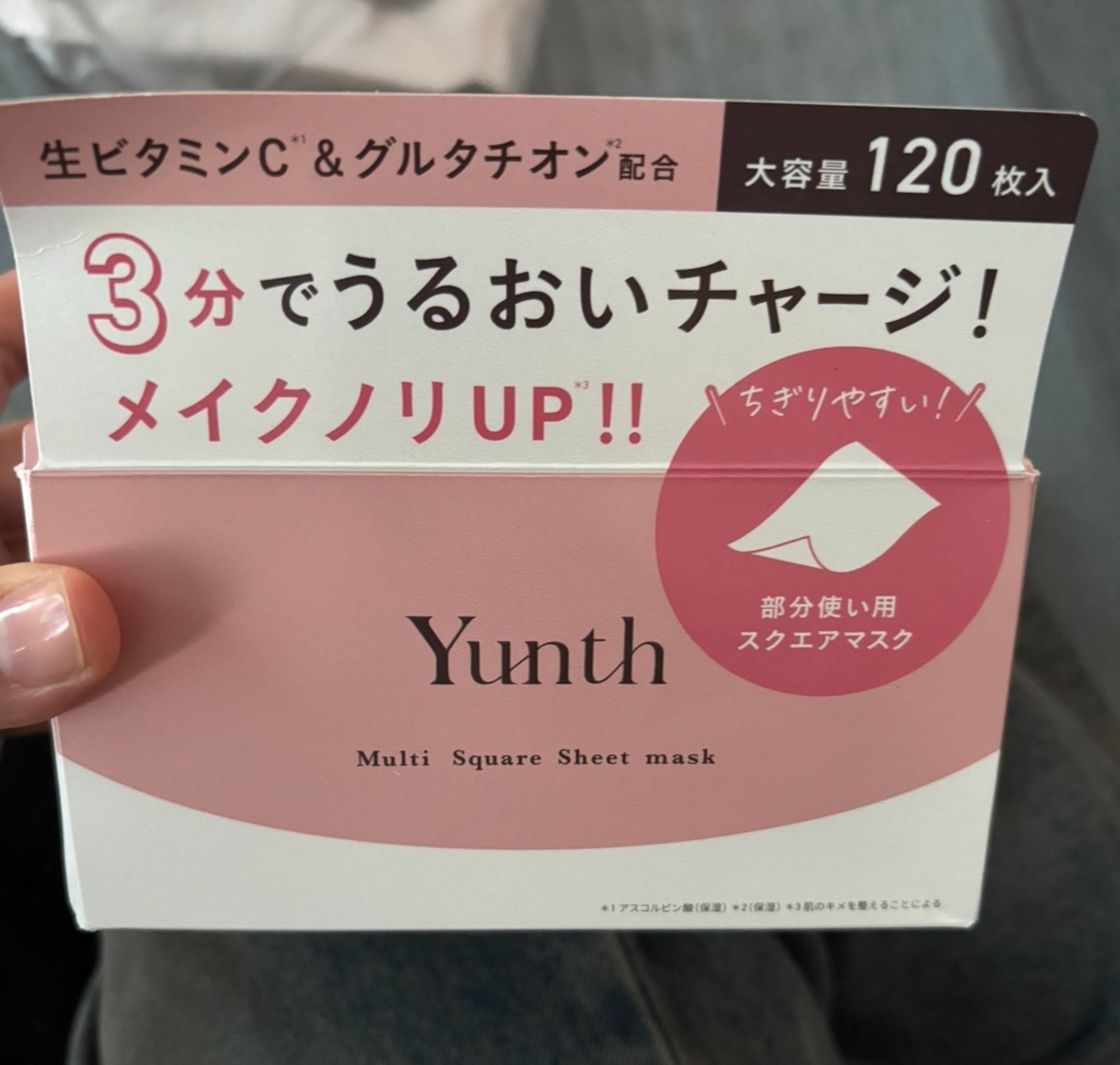 - ① 生ビタミンC×グルタチオンで、輝きあふれる透明感へ。与える+オフのWアプローチ Yunthでおなじみの生ビタミンC※1に加え、グルタチオン※2やセラミド※3、ヒアルロン酸※4など肌の保湿と透明感※5を底上げする成分だけでなく、ふき取り用途として次世代型AHA※6、肌を整えるアゼライン酸※7やツボクサエキス※8も配合。あらゆる肌悩みに多角的にアプローチする処方設計です。 ※1 アスコルビン酸 ※2 グルタチオン (保湿) ※3 セラミドNP、セラミドNG、セラミドAP (保湿) ※4 ヒアルロン酸Na (保湿) ※5 うるおいによる ※6 グルコノバクター/ハチミツ発酵液 (整肌) ※7 アゼロイルジグリシンK (整肌) ※8 ツボクサ葉/茎エキス (整肌) ②たっぷり使える120枚入り。毎日使いやすい“ちぎれる”スクエア形状 液含みがよく、手で簡単にちぎれるシートを採用。 顔全体はもちろん、小鼻・目元・首元など気になるパーツにサッと貼ることができます。お好みのサイズにちぎって、Tゾーンや目元などのピンポイントケアにも最適です。たっぷり使える大容量120枚入り。 ③高密着&高保のシートで忙しい朝でも3分で潤いチャージ 絶妙な厚みの高密着シートが肌にぴたりとフィットし、美容液のうるおいをしっかり届けます。たった3分で肌をみずみずしく整え、メイクのノリもアップ。夏のメイク崩れも防ぎやすくします。「毎日のスキンケアをもっと手軽に」「隙間時間に賢くケアしたい」という方にぴったりの時短アイテムです。 ④肌にやさしい6つのフリー パラベン、エタノール、鉱物油、石油系界面活性剤、香料、着色料がフリー。毎日使えるやさしい使い心地を追求しました。