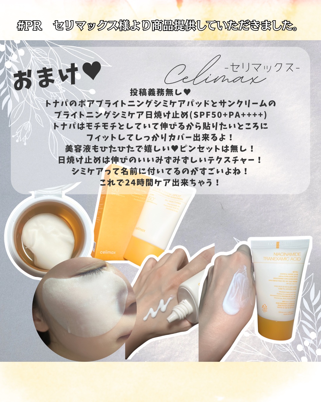 ナイスチョイスな4点セット✨celimaxシミケア4種セット◆ポアブライトニングシミケアパッド◆ポアブライトニングシミケアセラム◆ポアブライトニングシミケアクリーム◆ポアブライトニングケアサンクリームお試ししました!夏に向けて、準備開始!ポア...
