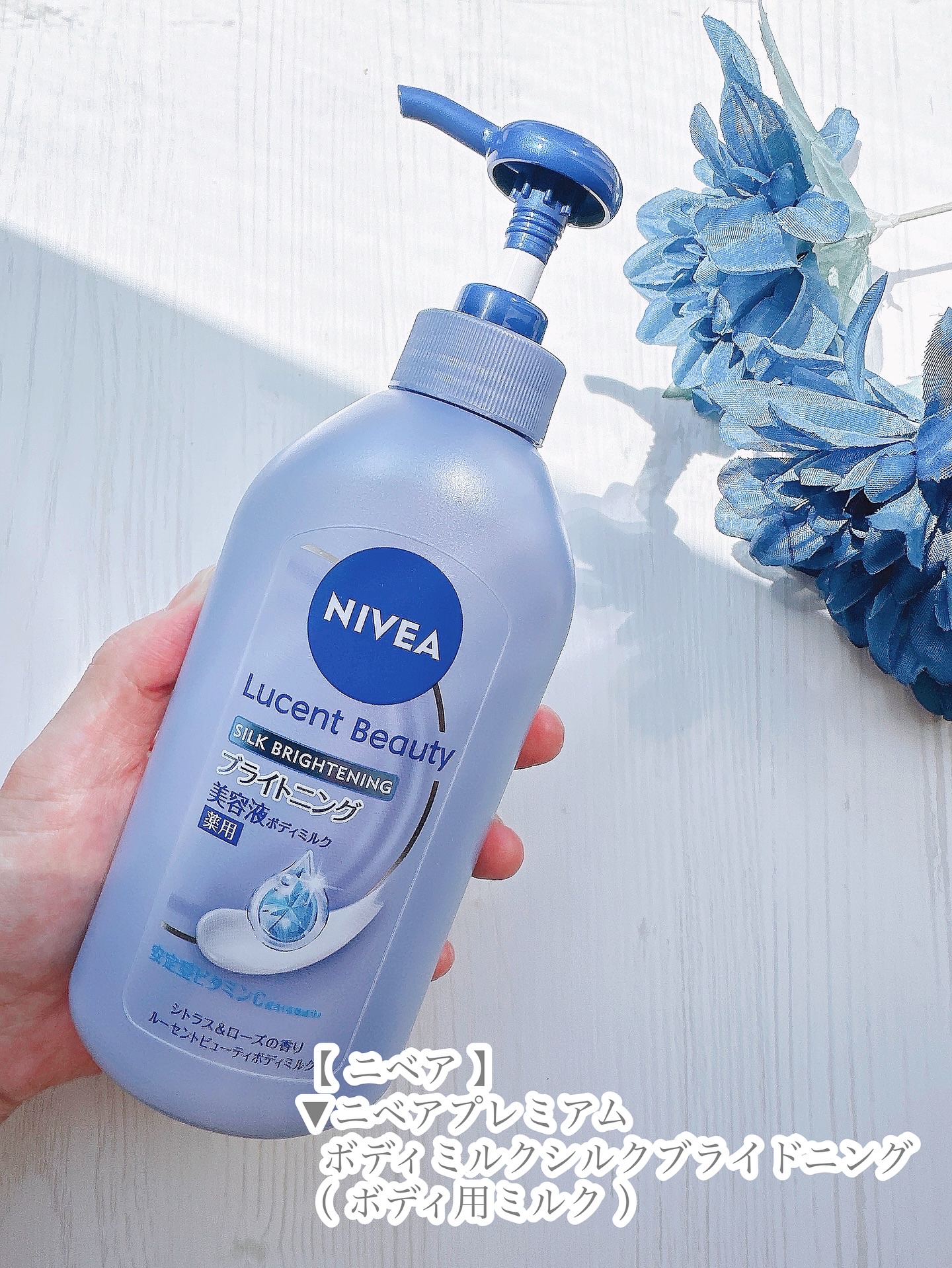 - うるおって透明感あふれる美肌へ導く、高保湿美容液ボディミルクシリーズ。 ニベアが考えるボディの美肌の鍵「キメ・つや・なめらかさ」にアプローチ。 うるおいに満ちて透明感のある肌に導く。ヒアルロン4G美容液成分※1 配合(保湿) 【医薬部外品】薬事販売名ニベアプレミアムセラムボディミルクシルクブライトニング 絹のようになめらかにうるおって明るい印象の透明美肌に。乾燥してくすみがちな肌に、みずみずしいうるおいが長続き。 有効成分(安定型ビタミンC)配合。メラニンの生成を抑え、シミ・そばかすを防ぐ。 ルミナスEP成分配合:エクトイン、真珠たん白抽出液※2、PG(すべて保湿) 乾燥してくすみがちな肌にうるおいを与えます。 気分満たさせる、上質で爽やかなシトラス&ローズの香り ※1 ヒアルロン酸、グリセリン、グリコーゲン、グリセリルグルコシド、酢酸キトサミン ※2 パールカルクエキス