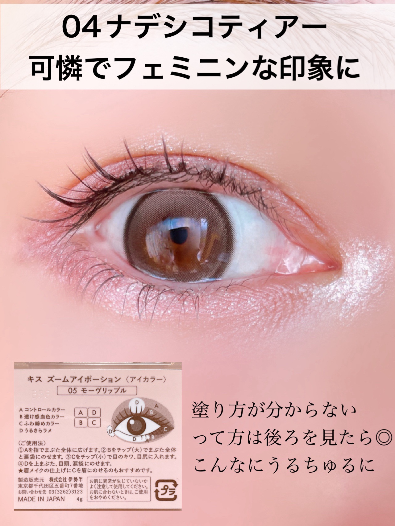 - 粘膜拡張カラーでうるちゅる目もとに 理想の顔に整えるアイカラーパレット 血色感を仕込んだ「粘膜拡張」カラーが大きな目もとを演出 ◇透け感のある血色カラーが粘膜を拡張し、涙袋をぷっくりとみせ、ナチュラルで大きな目もとに仕上げます。 透明感と高発色を両立した色設計 ◇にごりにくく自然なグラデーションを作る色設計で、透明感のある目もとを演出。 ◇さらに、しっとりと密着する高発色処方で、透明感と高発色の両立を実現します。 光を操る “うるきら”ラメで 、ちゅるんとした目もとに ◇うるうる&きらきらに輝くガラスパール配合で、目頭や上まぶた、涙袋などに光を集め、ちゅるんとうるんだ目もとを演出。 異なる質感と処方で、簡単に大きな目もとに仕上げるパレット設計 ◇異なる質感・処方が特徴の4色<コントロールカラー>・<透け感血色カラー>・<ふわ締めカラー>・<うるきらラメ>が入ったパレット。 ◇アイカラーベースの効果やしっとり高密着な処方により、ヨレを防ぎ、塗りたての美しい仕上がりを長時間キープします。