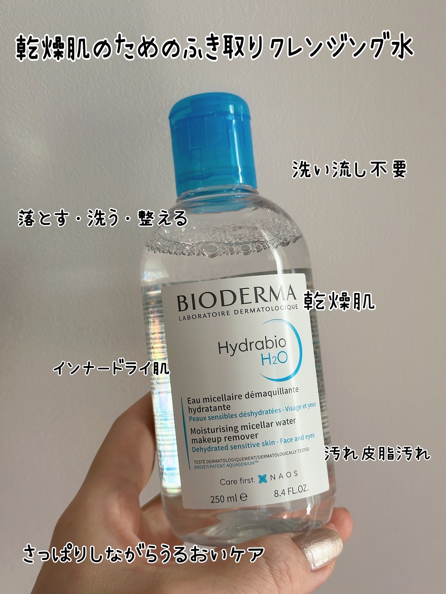 - ※2025年11月下旬〜250mlの商品パッケージを順次リニューアル。尚、これにかかる商品の返品・交換は承っておりません。 メイクをしっかり落とすだけでなく、水分不足の肌も保湿ケアします。 敏感乾燥肌に 皮膚に存在する水の通り道”アクアポリン”に着目して開発されました。 独自処方のアクアジェニウムが角質層に水分を与え、うるおいをキープ。 乾燥を防いでうるおいのある素肌へと導きます。 心地よい香り。 ■アップルシードエキス(保湿成分):素肌にうるおいを与えます。 ■ナイアシンアミド(皮膚コンディショニング成分): しっかりと肌のうるおいをキープします。 ■ビオデルマ独自のD.A.F.*複合体保湿成分配合。 敏感肌をやさしい使い心地で保湿し、うるおった肌へ導きます。 *D.A.F.(Dermatological Advanced Formulation) 保湿成分:マンニトール、キシリトール、ラムノース