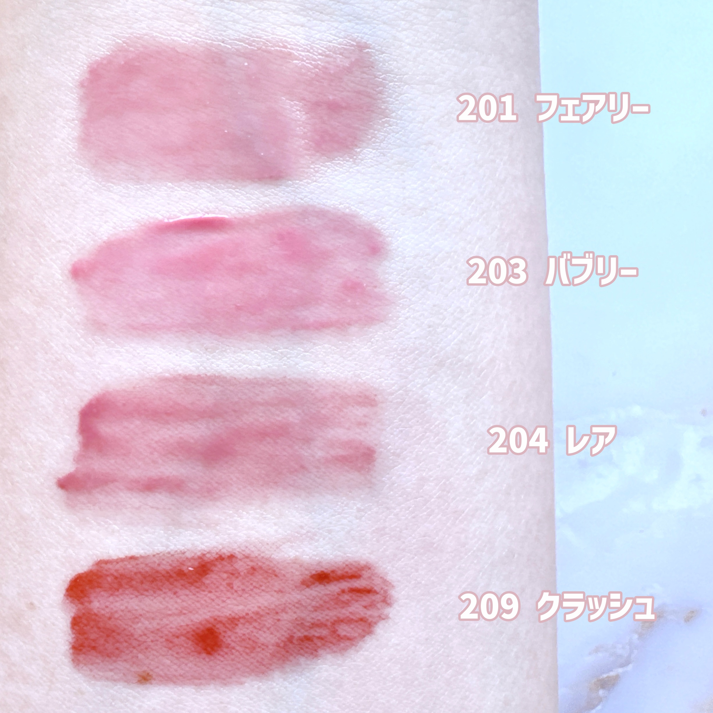 - <201 フェアリー> ダイマージリノール酸ジイソステアリル、ジフェニルシロキシフェニルトリメチコン、ビスジグリセリルポリアシルアジペート-2、水、ジフェニルジメチコン、水添ポリイソブテン、セチルPEG/PPG-10/1ジメチコン、ポリソルベート60、ペンチレングリコール、グリセリン、イソステアリン酸ポリグリセリル-4、フェノキシエタノール、1,2-ヘキサンジオール、セテアレス-20、酸化チタン (CI 77891)、(アクリル酸ヒドロキシエチル/アクリロイルジメチルタウリンNa)コポリマー、ステビオシド、スクワラン、香料、ジラウラミドグルタミドリシンNa、エチルヘキシルグリセリン、エチレンジアミンジコハク酸3Na、赤色227号 (CI 17200)、水酸化Al、黄色5号 (CI 15985)、ポリアクリル酸アンモニウム、イソステアリン酸ソルビタン、黄色4号 (CI 19140)、BG、赤色223号 (CI 45410)、青色1号 (CI 42090)、アラントイン、パンテノール、ツボクサエキス、ヒアルロン酸、加水分解ヒアルロン酸、ヒアルロン酸Na <203 バブリー> ダイマージリノール酸ジイソステアリル、ジフェニルシロキシフェニルトリメチコン、ビスジグリセリルポリアシルアジペート-2、水、ジフェニルジメチコン、水添ポリイソブテン、セチルPEG/PPG-10/1ジメチコン、ポリソルベート60、ペンチレングリコール、グリセリン、イソステアリン酸ポリグリセリル-4、フェノキシエタノール、1,2-ヘキサンジオール、セテアレス-20、(アクリル酸ヒドロキシエチル/アクリロイルジメチルタウリンNa)コポリマー、ステビオシド、酸化チタン (CI 77891)、スクワラン、香料、ジラウラミドグルタミドリシンNa、エチルヘキシルグリセリン、赤色227号 (CI 17200)、エチレンジアミンジコハク酸3Na、黄色5号 (CI 15985)、イソステアリン酸ソルビタン、水酸化Al、ポリアクリル酸アンモニウム、黄色4号 (CI 19140)、BG、青色1号 (CI 42090)、アラントイン、パンテノール、ツボクサエキス、ヒアルロン酸、加水分解ヒアルロン酸、ヒアルロン酸Na <204 レア> ダイマージリノール酸ジイソステアリル、ジフェニルシロキシフェニルトリメチコン、ビスジグリセリルポリアシルアジペート-2、水、ジフェニルジメチコン、水添ポリイソブテン、セチルPEG/PPG-10/1ジメチコン、ポリソルベート60、ペンチレングリコール、グリセリン、イソステアリン酸ポリグリセリル-4、フェノキシエタノール、1,2-ヘキサンジオール、セテアレス-20、(アクリル酸ヒドロキシエチル/アクリロイルジメチルタウリンNa)コポリマー、酸化チタン (CI 77891)、ステビオシド、スクワラン、香料、ジラウラミドグルタミドリシンNa、エチルヘキシルグリセリン、赤色227号 (CI 17200)、黄色5号 (CI 15985)、エチレンジアミンジコハク酸3Na、イソステアリン酸ソルビタン、水酸化Al、ポリアクリル酸アンモニウム、黄色4号 (CI 19140)、青色1号 (CI 42090)、BG、アラントイン、パンテノール、ツボクサエキス、ヒアルロン酸、加水分解ヒアルロン酸、ヒアルロン酸Na <205 ハニーデュー> ダイマージリノール酸ジイソステアリル、ジフェニルシロキシフェニルトリメチコン、ビスジグリセリルポリアシルアジペート-2、水、ジフェニルジメチコン、水添ポリイソブテン、セチルPEG/PPG-10/1ジメチコン、ポリソルベート60、ペンチレングリコール、グリセリン、イソステアリン酸ポリグリセリル-4、フェノキシエタノール、1,2-ヘキサンジオール、セテアレス-20、(アクリル酸ヒドロキシエチル/アクリロイルジメチルタウリンNa)コポリマー、酸化チタン (CI 77891)、ステビオシド、スクワラン、香料、ジラウラミドグルタミドリシンNa、エチルヘキシルグリセリン、赤色227号 (CI 17200)、黄色5号 (CI 15985)、エチレンジアミンジコハク酸3Na、イソステアリン酸ソルビタン、水酸化Al、ポリアクリル酸アンモニウム、黄色4号 (CI 19140)、青色1号 (CI 42090)、BG、アラントイン、パンテノール、ツボクサエキス、ヒアルロン酸、加水分解ヒアルロン酸、ヒアルロン酸Na <206 トフィー> ダイマージリノール酸ジイソステアリル、ジフェニルシロキシフェニルトリメチコン、ビスジグリセリルポリアシルアジペート-2、水、ジフェニルジメチコン、水添ポリイソブテン、セチルPEG/PPG-10/1ジメチコン、ポリソルベート60、ペンチレングリコール、グリセリン、イソステアリン酸ポリグリセリル-4、フェノキシエタノール、1,2-ヘキサンジオール、セテアレス-20、(アクリル酸ヒドロキシエチル/アクリロイルジメチルタウリンNa)コポリマー、ステビオシド、スクワラン、香料、ジラウラミドグルタミドリシンNa、酸化チタン (CI 77891)、エチルヘキシルグリセリン、黄色5号 (CI 15985)、エチレンジアミンジコハク酸3Na、黄色4号 (CI 19140)、赤色227号 (CI 17200)、イソステアリン酸ソルビタン、赤色223号 (CI 45410)、青色1号 (CI 42090)、水酸化Al、ポリアクリル酸アンモニウム、BG、アラントイン、パンテノール、ツボクサエキス、ヒアルロン酸、加水分解ヒアルロン酸、ヒアルロン酸Na <207 フレイム> ダイマージリノール酸ジイソステアリル、ジフェニルシロ