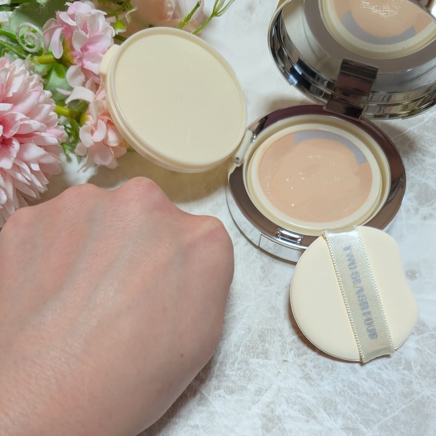 クッション部分はしっかりとファンデーションが染み込んでいて、触るとジュワッとするような感覚です。 ツヤ感のある綺麗な仕上がりで、カバー力もあるように思いますが厚塗り感がないのが嬉しいなと思います✨ 薄付きに仕上げられるのですが重ねても重たくならず、仕上がりがとにかく綺麗で肌への密着も良いように感じました。 付けていて肌への圧迫感も感じませんでしたし、使い心地も良くとても気に入りました😊