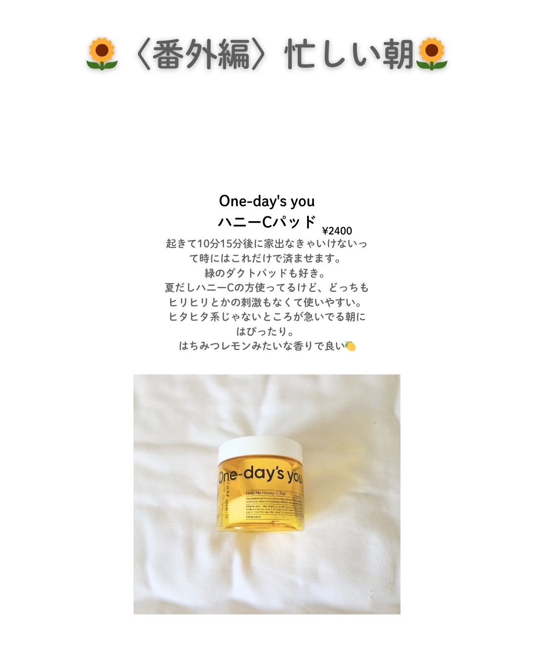 \ビタミン系トナーパッド🍋🐝/★One-day'syouヘルプミー!ハニーCパッド60枚ぽこぽこしたエンボス面があるトナーパッドだから拭き取りにぴったり😸🌟時間が無い時、めんどくさい時はこれで拭き取りだけして、日焼け止め塗って外に出たりしてた...