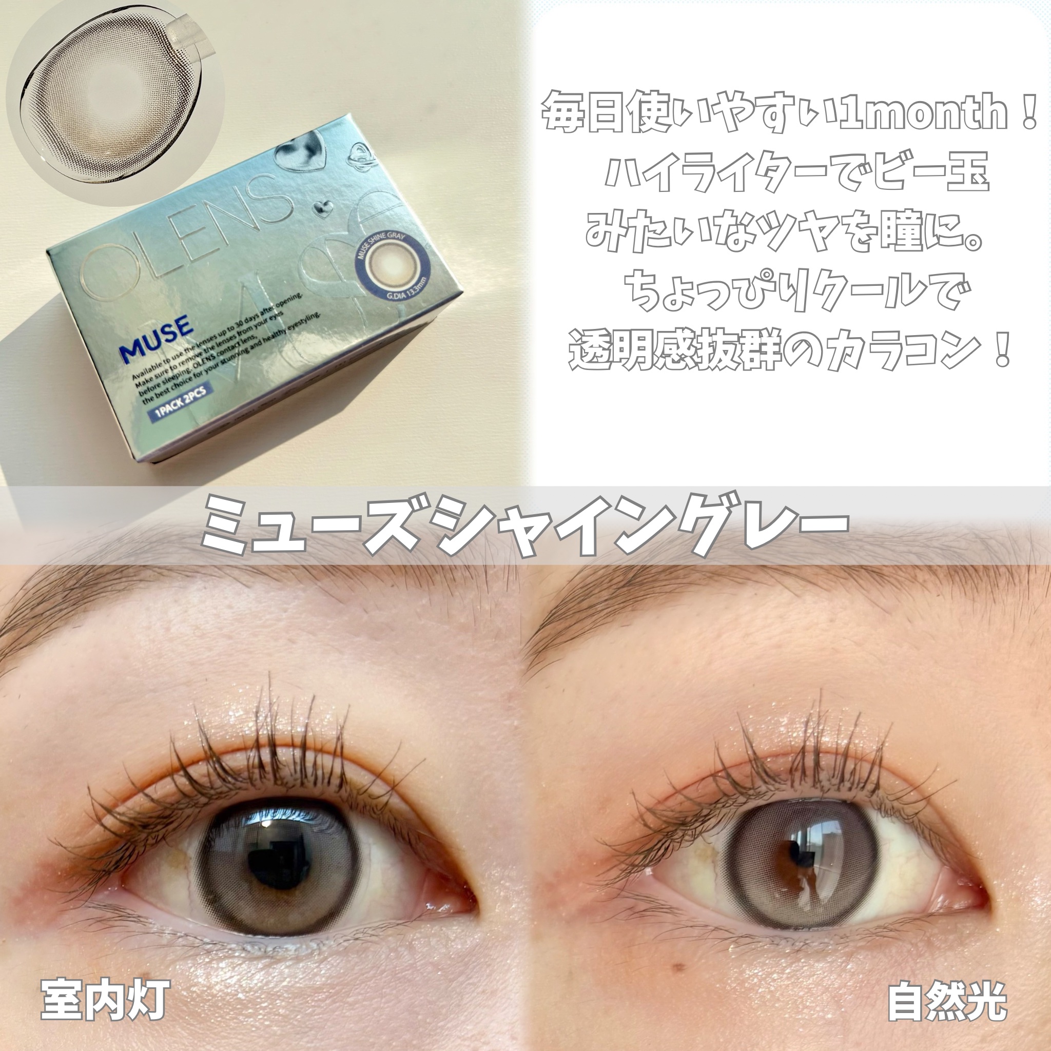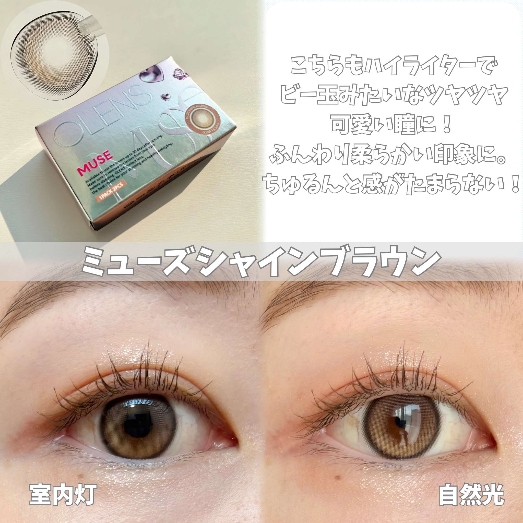 OLENS(オーレンズ)🩶ミューズシャイングレー🤎ミューズシャインブラウン1Month(1箱2枚入り)DIA:14.0mm着色直径:13.3mm明るいハイライトカラーでビー玉のように輝くうるツヤカラコン🫧✨️元が黒っぽい瞳の私は馴染みが良く自...
