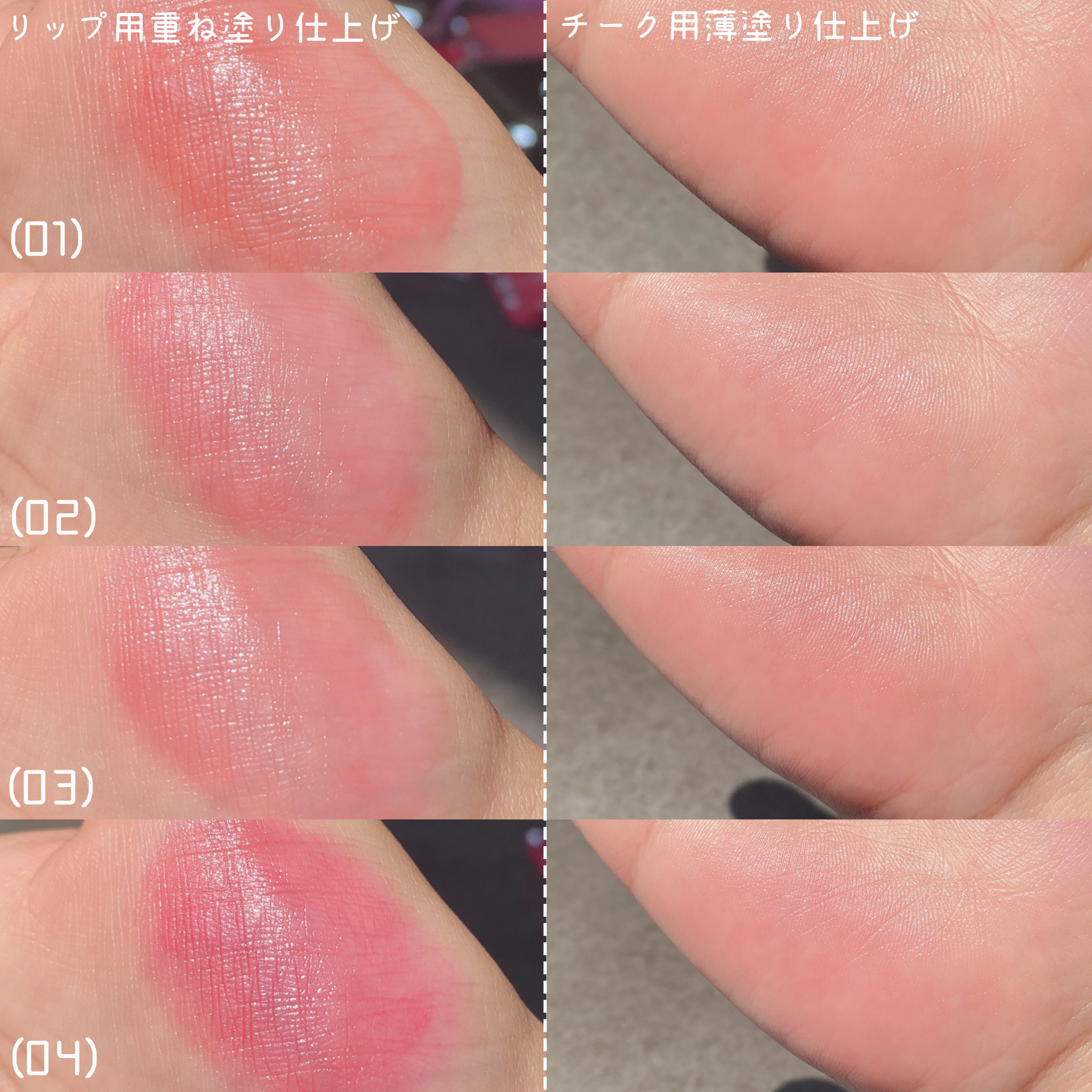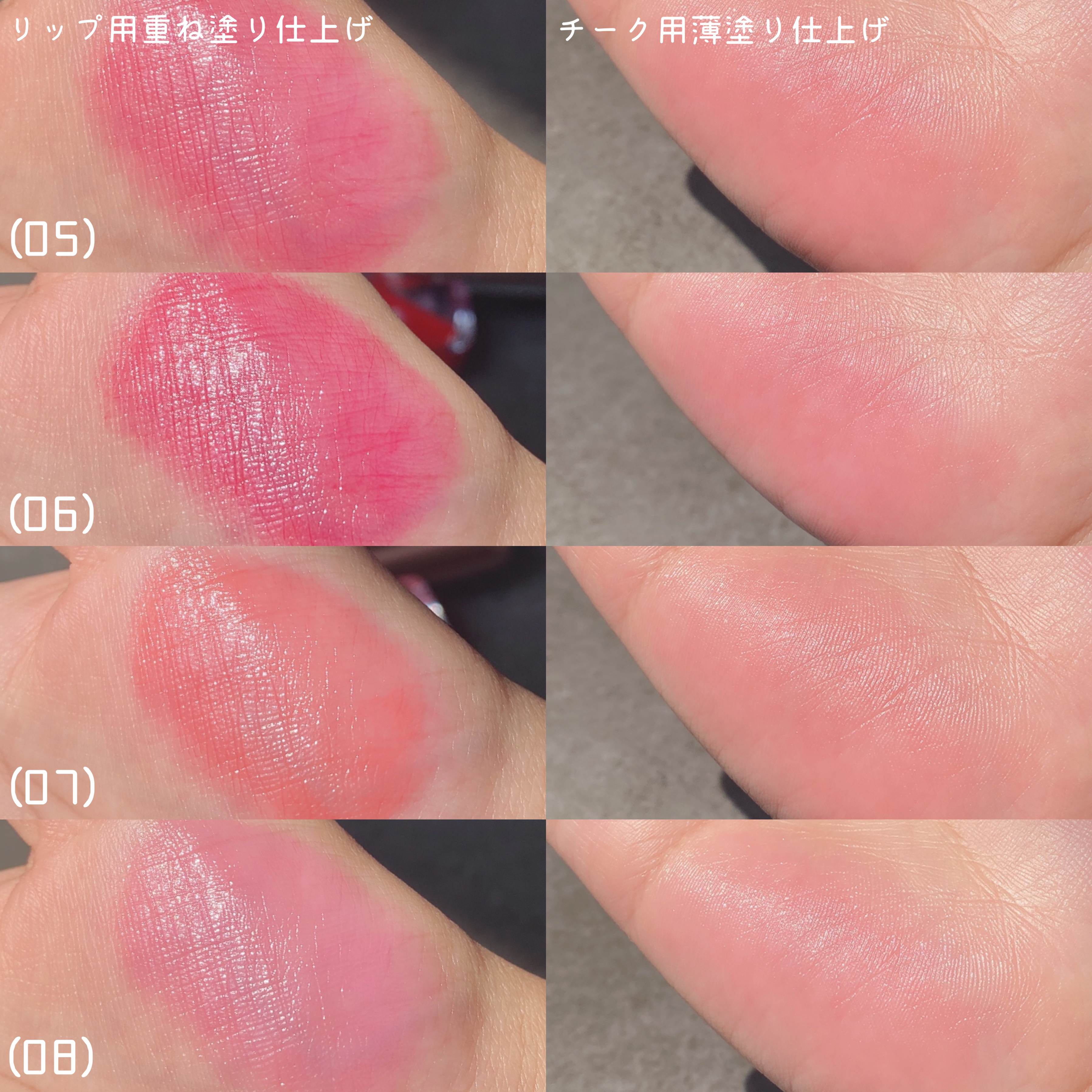 - ヘルシーで華やかな印象を叶える、リップやチークなどマルチに使える透明感のあるカラーのバーム。 <01 ピーチフラッシュ(PEACH FLUSH)> ヘルシーに表現されるピーチ コーラル カラー <02 バニーブラッシュ(BUNNY BLUSH)> 可愛らしく清純なベビーピンク カラー <03 ロージーブロー(ROSY BLOW)> 落ち着きのある成熟したロージーカラー <04 フロムベリー(FROW BERRY)> 紫色を一滴追加、デイリーベリーカラー <05 チェリーシャワー(CHERRY SHOWER)> イキイキとした血色感を与えるチェリー 果汁カラー <06 アップルガーデン(APPLE GARDEN)> クリアに満ちるレッドアップルカラー <07 アプリコット ブリーズ(APRICOT BREEZE)> やわらかい陽ざしのぬくもりを閉じ込めたサンキスドコーラル <08 バブリープラム(BUBLY PLUM)> 活気に満ちたライラックの花のように爽やかなライブリーパープル <100 シュガーリボン(SUGAR RIBBON)> ふんわり甘く、きゅんをひとさじしたようなローズピンクカラー