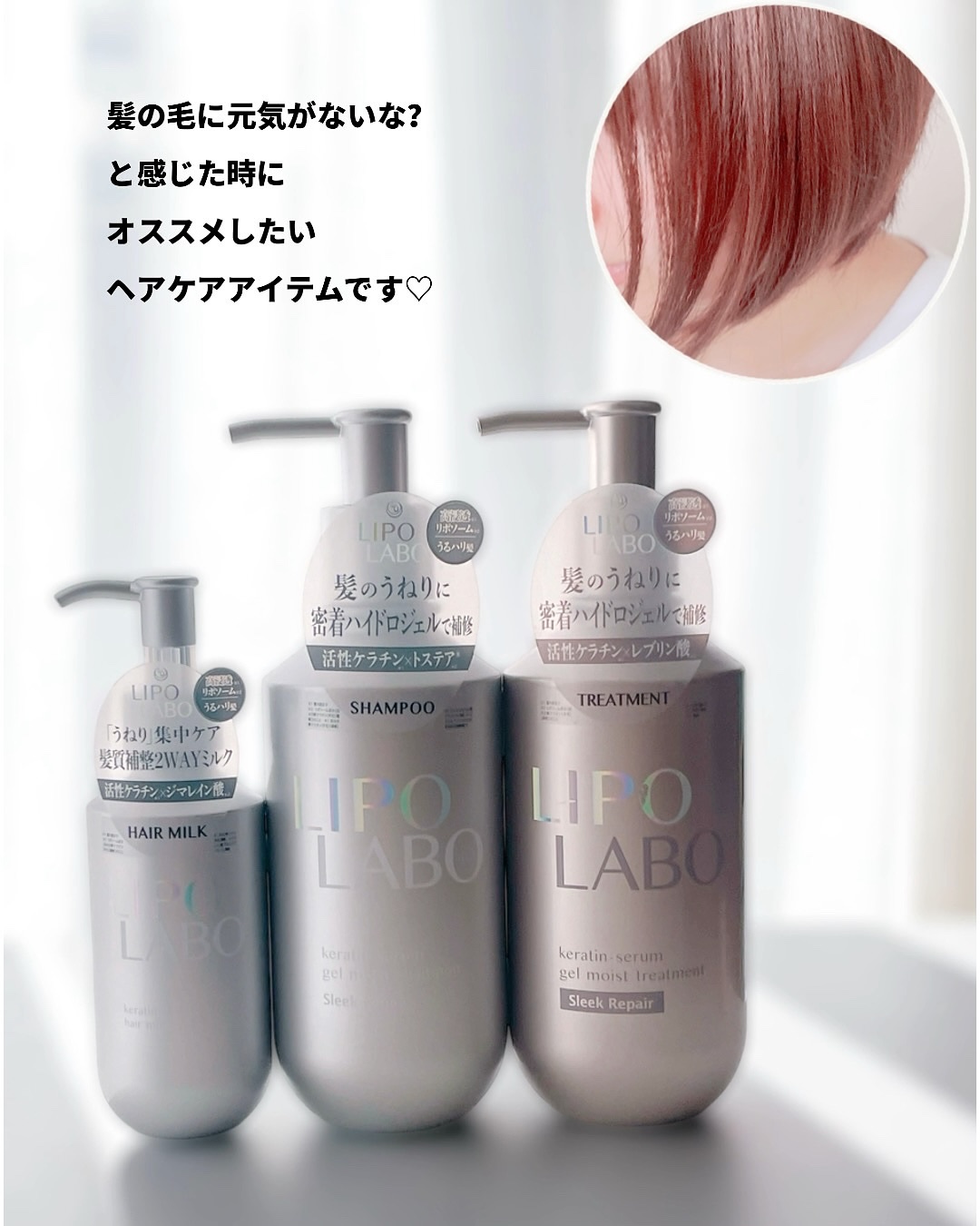 リポ ラボ ケラチンセラム ジェルモイスト シャンプー/トリートメント スリークリペア*、ヘアミルク*を使用しました😊活性ケラチンをリポソーム化した独自原料「ケラチンリポソーム*1」を配合して、髪のダメージを深層から*2整えるヘアケアブランド...