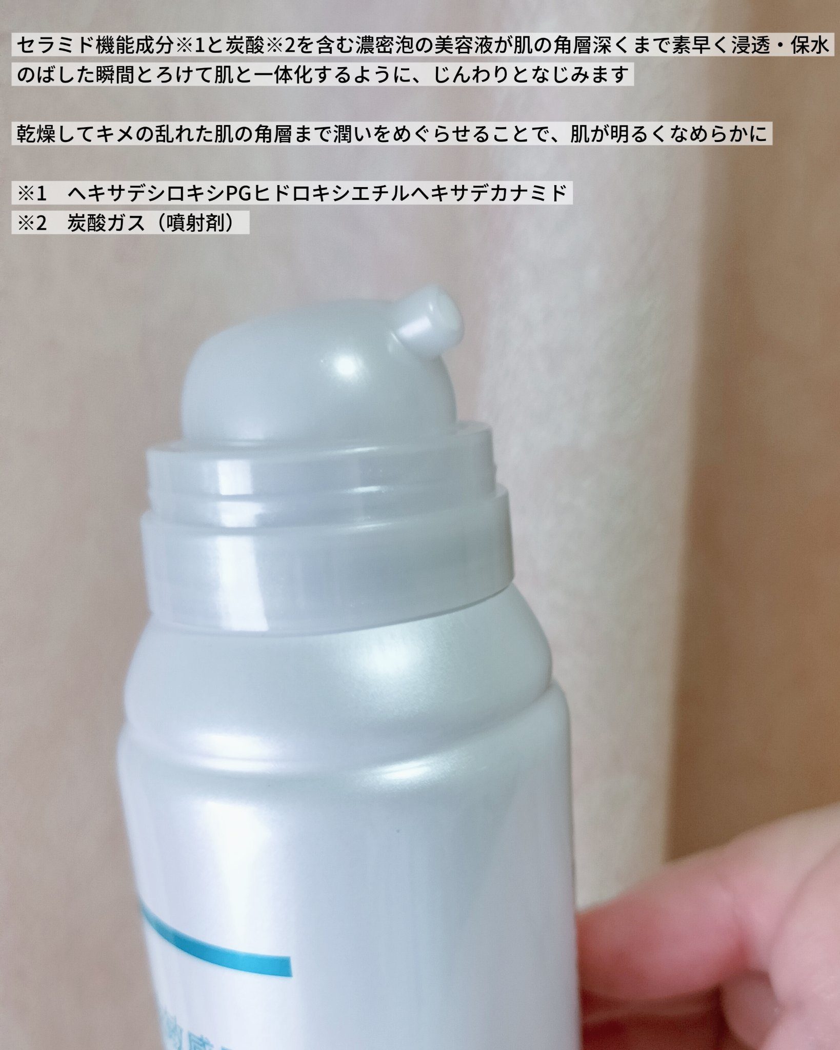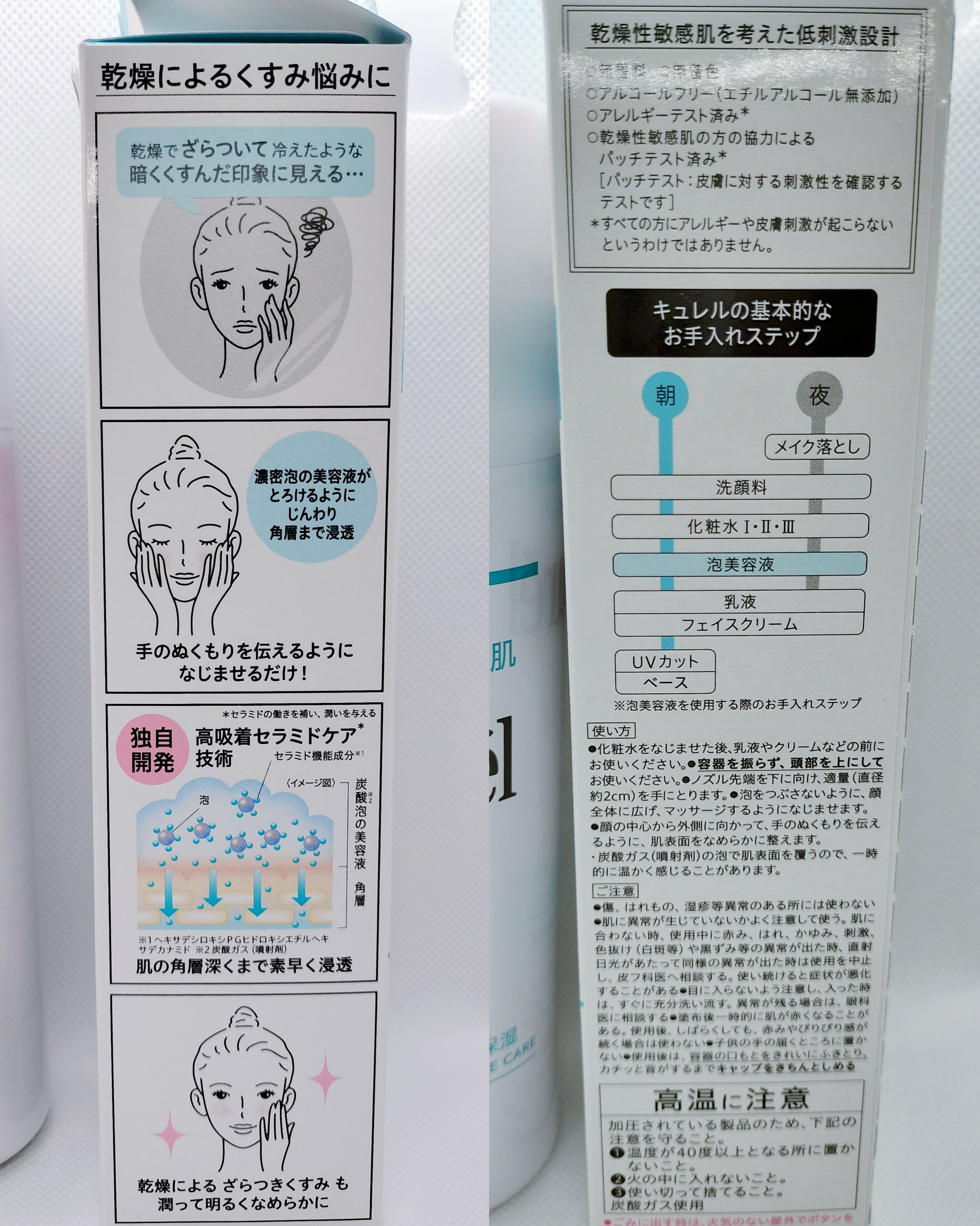 - 【敏感肌用】 乾燥によるざらつきくすみを潤いで満たし、くすみが晴れたような明るいなめらかさのある肌へ導く炭酸*3泡の美容液。 ● 高吸着セラミドケア*2技術 セラミド機能成分*7(保湿)と炭酸*3を含む濃密泡の美容液が、 肌の角層深くまで素早く浸透し保水する ● 潤い成分(セラミド機能成分*7、ユーカリエキス)配合 ● 有効成分(グリチルリチン酸ジカリウム)配合。肌荒れを防ぎます ● 伸ばした瞬間とろけて、肌と一体化するようになじむ使い心地 *2 セラミドの働きを補い、潤いを与える *3 炭酸ガス(噴射剤) *7 ヘキサデシロキシPGヒドロキシエチルヘキサデカナミド <乾燥性敏感肌を考えた低刺激設計> ● 無香料 ● 無着色 ● アルコールフリー(エチルアルコール無添加) ● アレルギーテスト済※ ● 乾燥性敏感肌の方の協力によるパッチテスト済※ パッチテスト:皮膚に対する刺激性を確認するテストです。 ※すべての方にアレルギーや皮膚刺激が起こらないというわけではありません 商品に関するお問い合わせ 受付時間9:00~17:00(土曜・日曜・祝日除く) *製品の誤飲・誤食など緊急の場合は、受付時間外でもお電話ください キュレル:0120-165-698