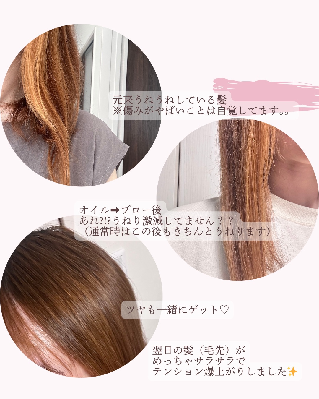 うねりを抑制するジェルということで、ゆるパーマかけた?ってくらいうねる自分の髪だと ジェルをつかってドライヤーで乾かすと 効果は一目瞭然でした🙌 パサつきもなくなり ツヤっとした髪表面と なんといってもまとまりが変わる‼️ ぼゎぼゎヘアーが しっとりキレイヘアーに変身しました✨ 髪に塗ったあとの 手のひらにベタつきが残らないのも ポイントの1つです♡