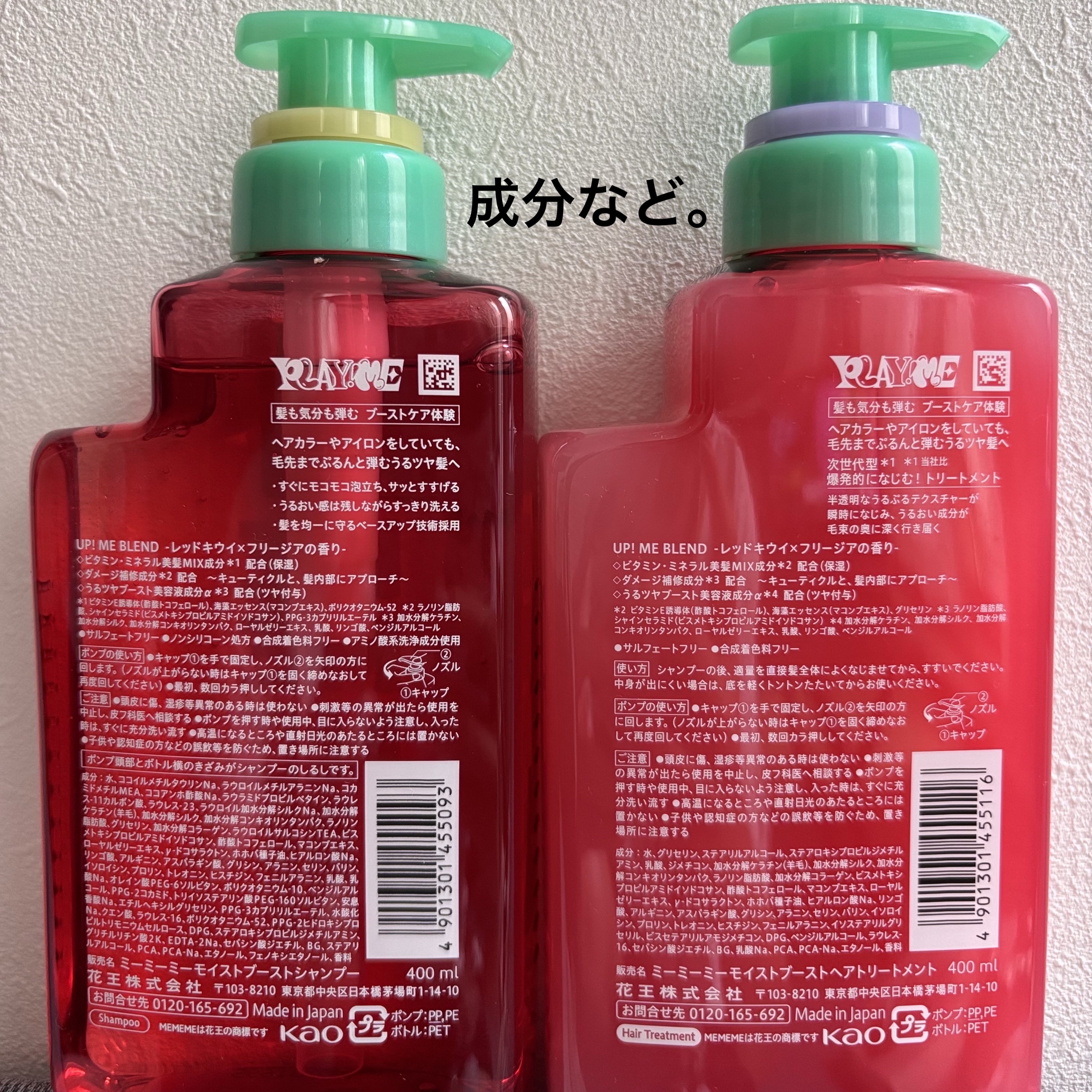 - ヘアカラーやアイロンをしていても、毛先までぷるんと弾む自信がみなぎるうるツヤ髪へ 【モイストブーストシャンプー】 ・すぐにモコモコ泡立ち、サッとすすげる! ・うるおい感は残しながらすっきり洗える ・髪を均一に守るベースアップ技術採用 【モイストブーストトリートメント】 次世代型*¹ 素早く一気になじむトリートメント。 ・半透明なうるぷるテクスチャーが瞬時になじみ、うるおい成分が毛束のすみずみまで行き届く ●サルフェートフリー ●合成着色料フリー シャンプーのみ:●ノンシリコーン処方 ●アミノ酸系洗浄成分使用*² UP! ME BLEND レッドキウイ×フリージアの香り ◇ビタミン・ミネラル美髪MIX成分*³配合(保湿) ◇うるツヤブースト美容液成分α*⁴配合(ツヤ付与) ◇ダメージ補修成分*⁵ ~キューティクルと、髪内部にアプローチ~ *1 花王内 *2 ココイルメチルタウリンNa、ラウロイルメチルアラニンNa、ラウロイルサルコシンTEA *3 ビタミンE誘導体(酢酸トコフェロール)、海藻エッセンス(マコンブエキス)、ポリクオタニウム-52(シャンプーのみ)、グリセリン(トリートメントのみ) *4 加水分解ケラチン、加水分解シルク、加水分解コンキオリンタンパク、ローヤルゼリーエキス、乳酸、リンゴ酸、ベンジルアルコール *5 ラノリン脂肪酸、シャインセラミド(ビスメトキシプロピルアミドイソドコサン)、PPG-3カプリリルエーテル(シャンプーのみ)