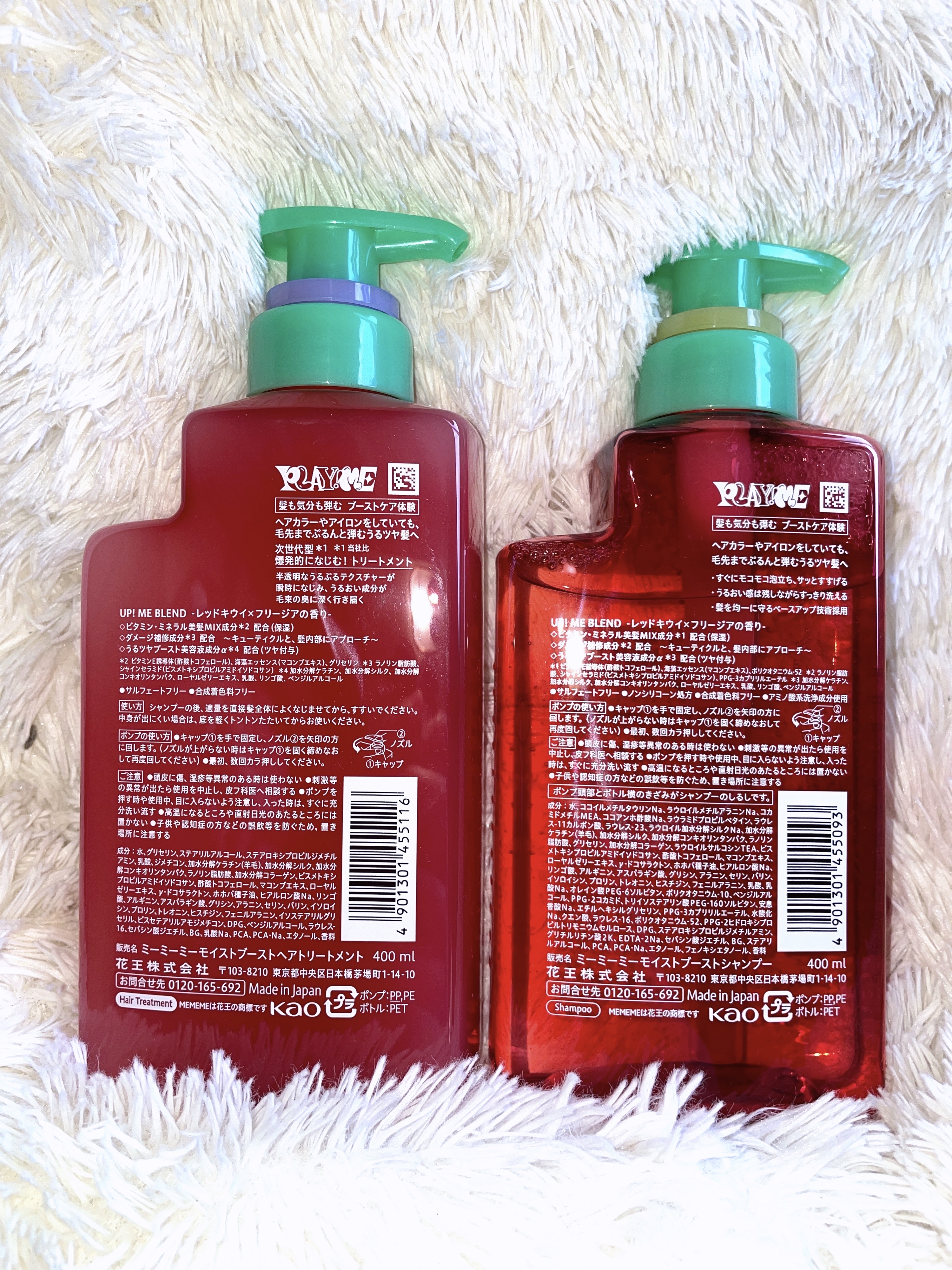 - ヘアカラーやアイロンをしていても、毛先までぷるんと弾む自信がみなぎるうるツヤ髪へ 【モイストブーストシャンプー】 ・すぐにモコモコ泡立ち、サッとすすげる! ・うるおい感は残しながらすっきり洗える ・髪を均一に守るベースアップ技術採用 【モイストブーストトリートメント】 次世代型*¹ 素早く一気になじむトリートメント。 ・半透明なうるぷるテクスチャーが瞬時になじみ、うるおい成分が毛束のすみずみまで行き届く ●サルフェートフリー ●合成着色料フリー シャンプーのみ:●ノンシリコーン処方 ●アミノ酸系洗浄成分使用*² UP! ME BLEND レッドキウイ×フリージアの香り ◇ビタミン・ミネラル美髪MIX成分*³配合(保湿) ◇うるツヤブースト美容液成分α*⁴配合(ツヤ付与) ◇ダメージ補修成分*⁵ ~キューティクルと、髪内部にアプローチ~ *1 花王内 *2 ココイルメチルタウリンNa、ラウロイルメチルアラニンNa、ラウロイルサルコシンTEA *3 ビタミンE誘導体(酢酸トコフェロール)、海藻エッセンス(マコンブエキス)、ポリクオタニウム-52(シャンプーのみ)、グリセリン(トリートメントのみ) *4 加水分解ケラチン、加水分解シルク、加水分解コンキオリンタンパク、ローヤルゼリーエキス、乳酸、リンゴ酸、ベンジルアルコール *5 ラノリン脂肪酸、シャインセラミド(ビスメトキシプロピルアミドイソドコサン)、PPG-3カプリリルエーテル(シャンプーのみ)