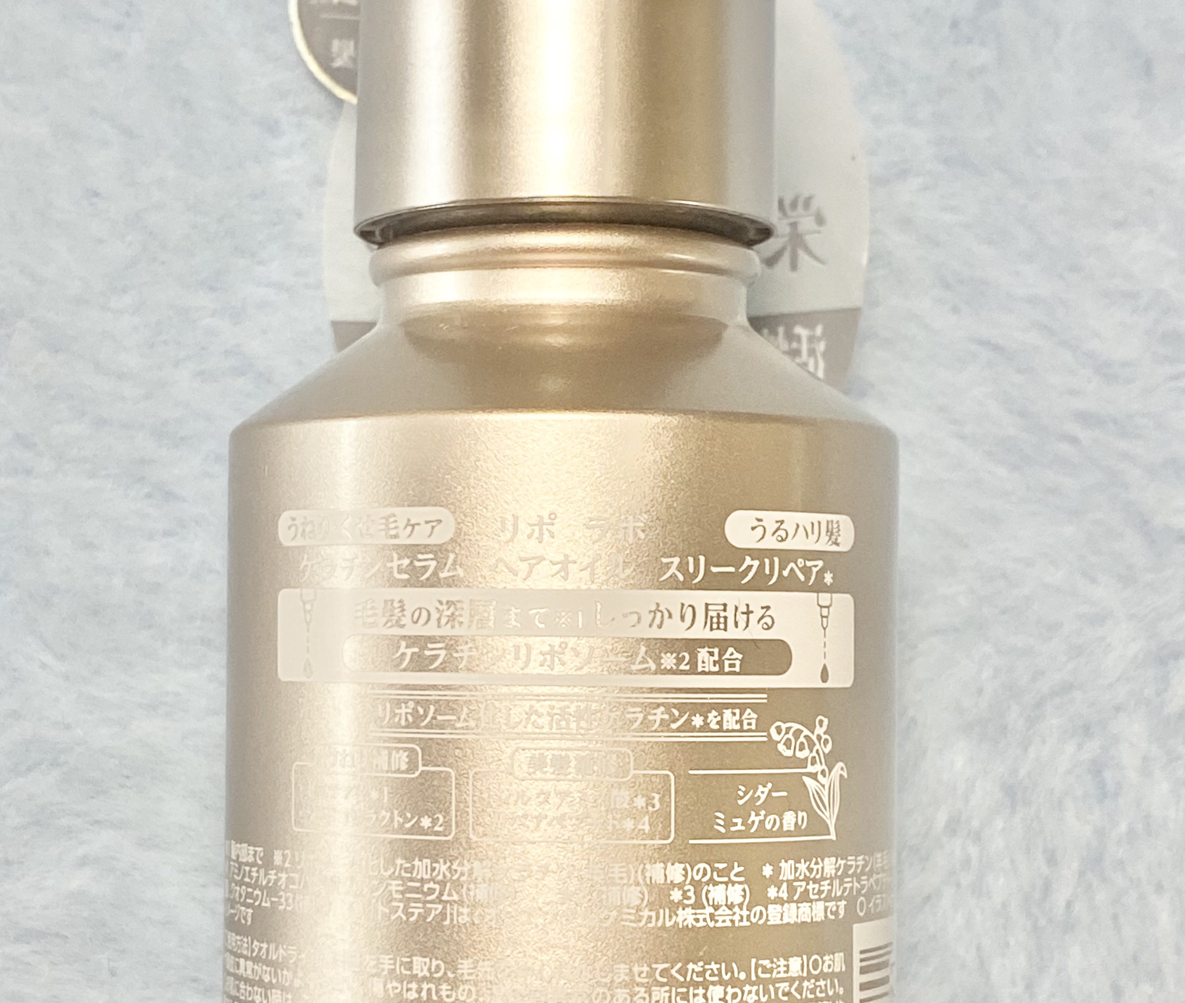 - <100mL> シクロペンタシロキサン、ジメチコン、ミリスチン酸イソプロピル、ジメチコノール、加水分解ケラチン(羊毛)、スフィンゴ糖脂質、水素、アミノエチルチオコハク酸ジアンモニウム、シルクアミノ酸、アセチルテトラペプチド-3、セラミドNG、セラミドNP、セラミドAP、クオタニウム-33、コレステロール、ラウロイルグルタミン酸ジ(フィトステリル/オクチルドデシル)、γ-ドコサラクトン、アカツメクサ花エキス、水添レシチン、乳酸桿菌発酵液、グリセリン、ペンチレングリコール、シクロヘキサン-1,4-ジカルボン酸ビスエトキシジグリコール、トリ(カプリル酸/カプリン酸)グリセリル、水、デキストラン、クオタニウム-18、PG、BG、フェノキシエタノール、香料
