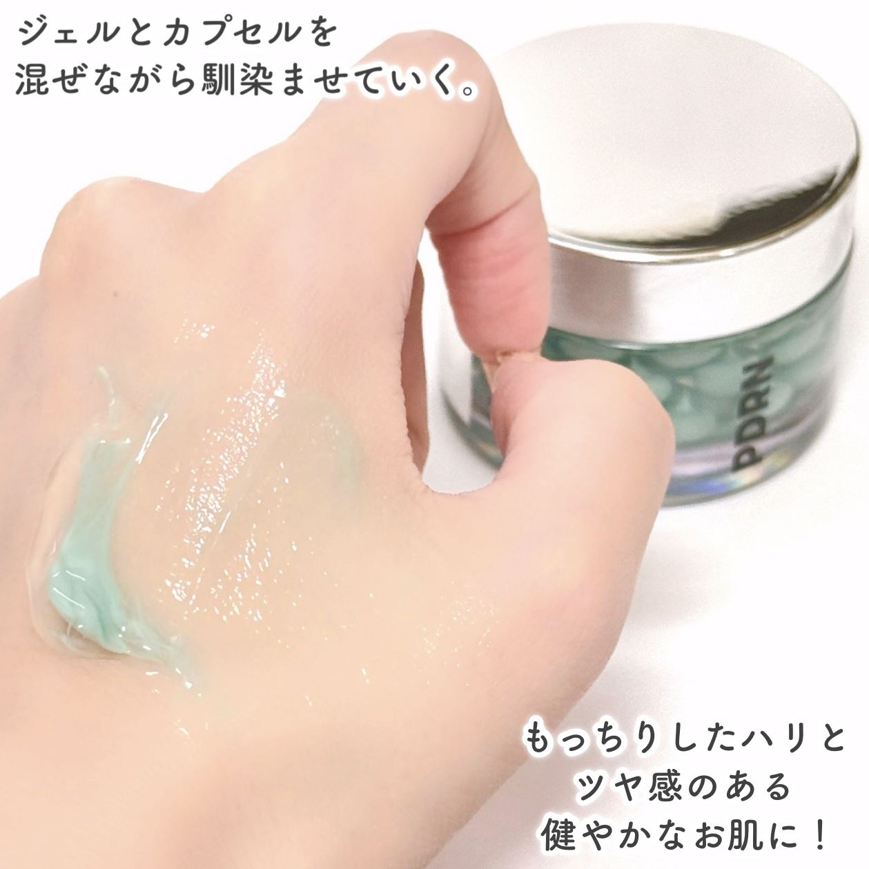 - 「いい感じの肌」を目指す韓国高麗人参由来の植物性PDRN(整肌)がたっぷり入ったカプセルクリーム。 ライトジェルに含まれるペプチド、ヒアルロン、パンテノールと一緒に肌へなじませることで、水分感溢れるプルンプルンな肌印象へ! ・カプセルクリーム(ミント):高麗人参由来のPDRN(整肌)配合クリーム。 ・ライトジェル(透明):すっきり水分ジェルクリーム。油水分・保湿ケア <すこやかなツヤ肌を保つ美容保湿成分がプラス> ✔ セラミド:しっとりした肌ケア、ツヤ保護膜 ✔ 9つのペプチド : 健やか肌のキープ、肌バリア保護 ✔ パンテノール : 保湿サポート&肌バリア機能を守る ✔ スクワラン : 肌バリアサポート ✔ 10種のヒアルロン酸 : 肌角層へ潤う水分を届ける ■使い方 洗顔後、スキンケアの最後の段階で適量を手に取り、肌にやさしく塗り広げます。 ■このような方へおすすめ ハリのない肌が気になる方 ツヤのある美肌を目指したい方 乾燥肌で肌コンディションを整えたい方 外部刺激によってゆらぐ肌へのケアが必要な方 PDRN(整肌)配合商品でハリケアをしたい方