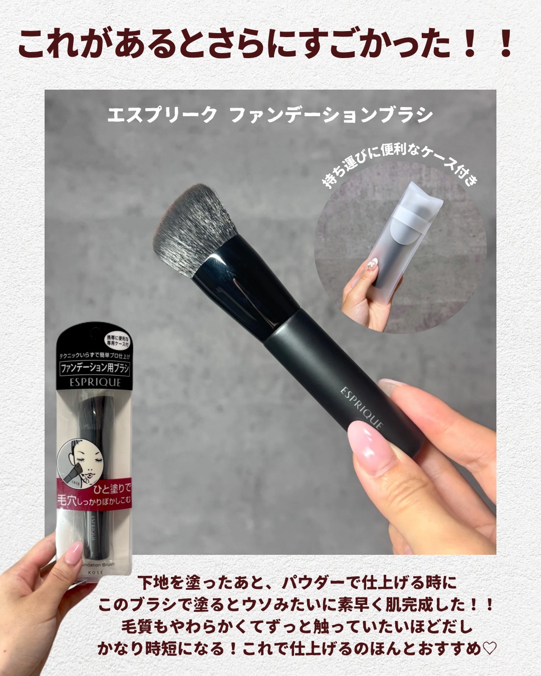 | ブラシの毛が細かくみっちりつまっていて、ファンデーションが伸ばしやすく毛穴をしっかりカバーしてくれます! | 詳細を見る | ||