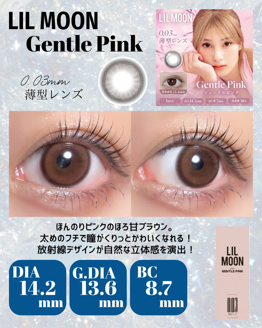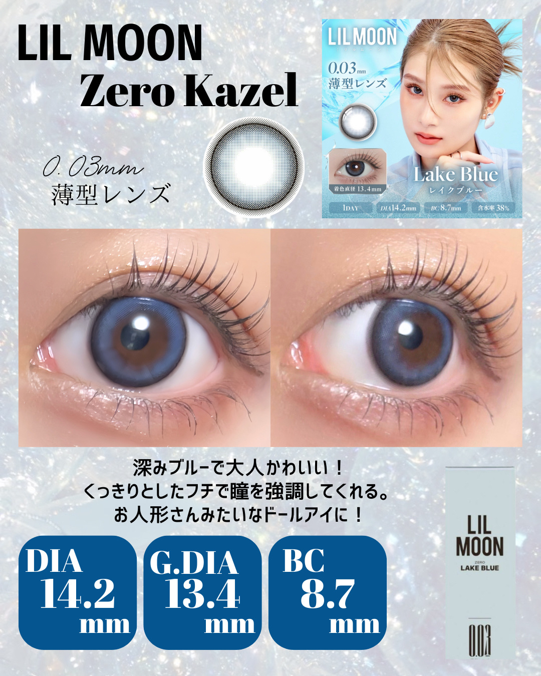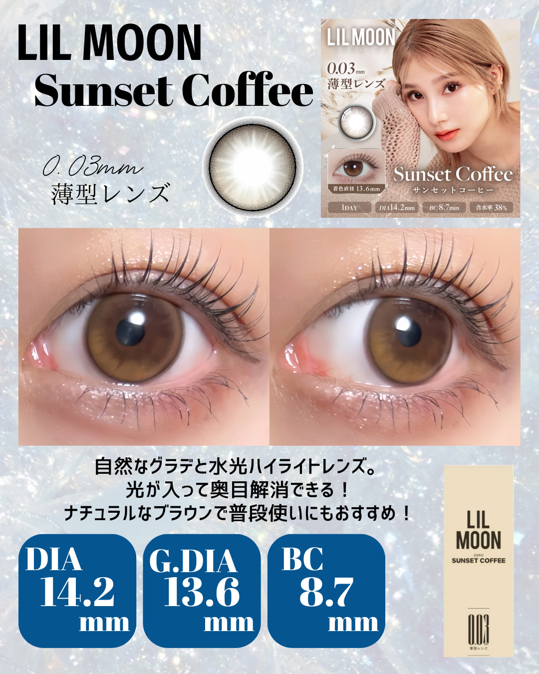 - "ZERO”感つけ心地、きらめきUP! (1)全度数0.03mm極薄*1*2 LILMOON(リルムーン)「0.03シリーズ」は、全度数レンズの中心厚が0.03㎜で、レンズが薄く厚みが少ない分、まるで裸眼のような快適な付け心地で異物感を感じにくいです。 (2) 全度数酸素透過率DK/t:45 『LIL MOON(リルムーン)』0.03シリーズは全度数レンズの酸素透過率DK/t:45、従来の含水率38%通常厚レンズと比べ2倍以上*2の酸素透過率を実現し、酸素不足による充血を軽減。高い保水力を持つMPCポリマーを保存液に配合し、乾燥や目のゴロゴロ感を軽減。 (3)気分で選べるクリアレンズとカラーレンズ 多彩な瞳も、自然な瞳も,カラコンとクリアレンズ、どちらも揃う。カラコンお試しサイズ2枚入りを用意、気軽にお試しできちゃう。幅広いラインナップで、瞳に自信と輝きをプラス、毎日のスタイルを自由に楽しめる! <クラッシュグレー> センス◎!やりすぎないアクセントで、馴染みのいいアッシュグレーアイ <サンセットコーヒー> ちゅるんと透明感UP演出! 落ち着いた水光ブラウンアイ <ジェントルピンク> クリっと瞳を際立たせるふんわり太フチと、 優しいほんのりピンクアイ <ゼロインク> ダークウッドをイメージしたブラックレンズ、透明感あふれるクリっとした瞳 <ゼロヘーゼル> 大人っぽいブラウンに差し込む ヘーゼルカラー、オシャレなブラウンアイ <ゼロチャコール> 落ち着いたダークグレーにブルー でアクセント、クールな大人アイ <レイクブルー> ほどよいフチ感で立体感見え重視、深みのあるダークブルーアイ *1:使用感には個人差があります *2:当社製品比較 カラーコンタクトレンズの不適正使用による眼障害の危険性等などがあります。 ●コンタクトレンズは高度管理医療機器です。不十分な洗浄・消毒など不適切なケアや、長時間・交換期間を超えた装用により、アレルギー性結膜炎、角膜感染症、角膜潰瘍等の重篤な眼障害が発生する危険性があります ●ご使用前に取扱説明書を確認してください 使用上の留意事項 ●眼科医院等を受診してからお求めください ●眼に異常を感じたら直ちにレンズ使用を中止し、お近くの眼科等で診察を受けてください ●医師の指示にしたがってご使用ください ●コンタクトレンズを装用する場合、自覚症状がなくても、眼科医院等での定期検査を受けてください ●レンズに不具合がある場合は使用しないでください
