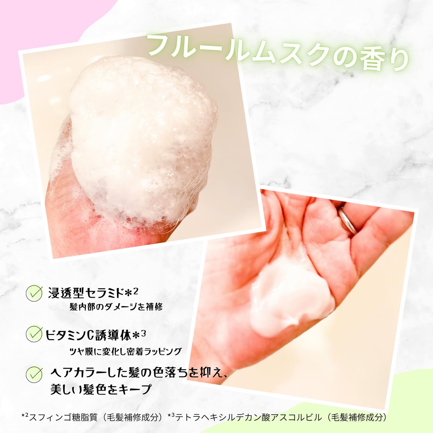 - カラーやパーマによるダメージも密着補修 ゴワつく髪もすとんとまとまるツヤ髪へ 扱いやすく柔らかな質感の髪に導く ツヤ膜ラッピング うねり※1ケア処方 ・浸透型セラミド※2 ダメージを受けて硬くなった 髪内部に浸透し、毛髪を補修 + ・ビタミンC誘導体※3 ツヤ膜に変化して密着ラッピング 〇ダメージ補修しながらカラーをキープ ※ラッピング効果による 〇華やかさとやわらかさをまとった フルールムスクの香り 〇あらゆるダメージ髪に [うねり※3・ゴワつき] [カラー・パーマ] [紫外線による乾燥ダメージ][くり返す熱ダメージ] ※1 乾燥による ※2 スフィンゴ糖脂質(毛髪補修成分) ※3 テトラヘキシルデカン酸アスコルビル(毛髪補修成分) シャンプー:シリコン・パラベン・合成着色料・サルフェート※フリー トリートメント:パラベン・鉱物油・合成着色料フリー
